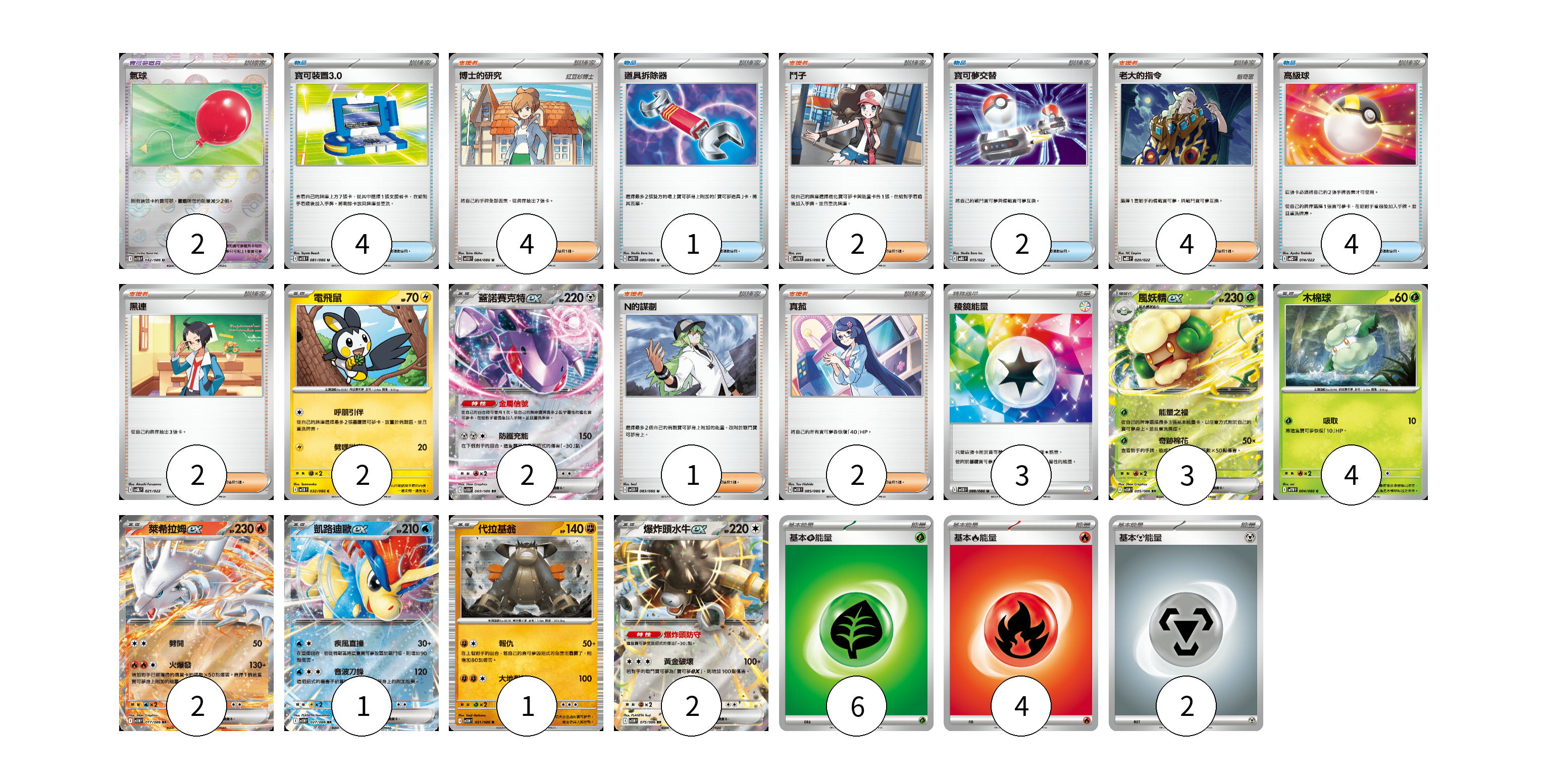 牌組構築方案 以此牌組為基礎新構築牌組 顯示卡面 顯示列表 寶可夢卡(17) 2 2 3 4 2 1 1 2 寶可夢道具(2) 2 物品卡(11) 4 1 2 4 支援者卡(15) 4 2 4 2 1 2 能量卡(15) 3 6 4 2 寶可夢卡(17) 卡牌名稱 張數 卡牌名稱 張數 電飛鼠 SV11B 032/086 02 蓋諾賽克特ex SV11B 069/086 02 風妖精ex SV11W 005/086 03 木棉球 SV11W 004/086 04 萊希拉姆ex SV11W 017/086 02 凱路迪歐ex SV11W 027/086 01 代拉基翁 SV11W 051/086 01 爆炸頭水牛ex SV11W 075/086 02 寶可夢道具(2) 卡牌名稱 張數 卡牌名稱 張數 氣球 SV11B 082/086 02 物品卡(11) 卡牌名稱 張數 卡牌名稱 張數 寶可裝置3.0 SV11B 081/086 04 道具拆除器 SV11W 080/086 01 寶可夢交替 MBG 015/022 02 高級球 MBD 014/022 04 支援者卡(15) 卡牌名稱 張數 卡牌名稱 張數 博士的研究 SV11B 084/086 04 鬥子 SV11W 085/086 02 老大的指令 MBD 020/022 04 黑連 SVQL 021/022 02 N的謀劃 SV11B 083/086 01 真菰 SV11B 085/086 02 能量卡(15) 卡牌名稱 張數 卡牌名稱 張數 稜鏡能量 SV11B 086/086 03 基本草能量 sv-p GRA 06 基本火能量 sv-p FIR 04 基本鋼能量 sv-p MET 02 以此牌組為基礎新構築牌組 牌組編碼 EzxBra-aTkGnV-DZBnnr copy 列印牌組單 牌組編碼已複製 分享至SNS