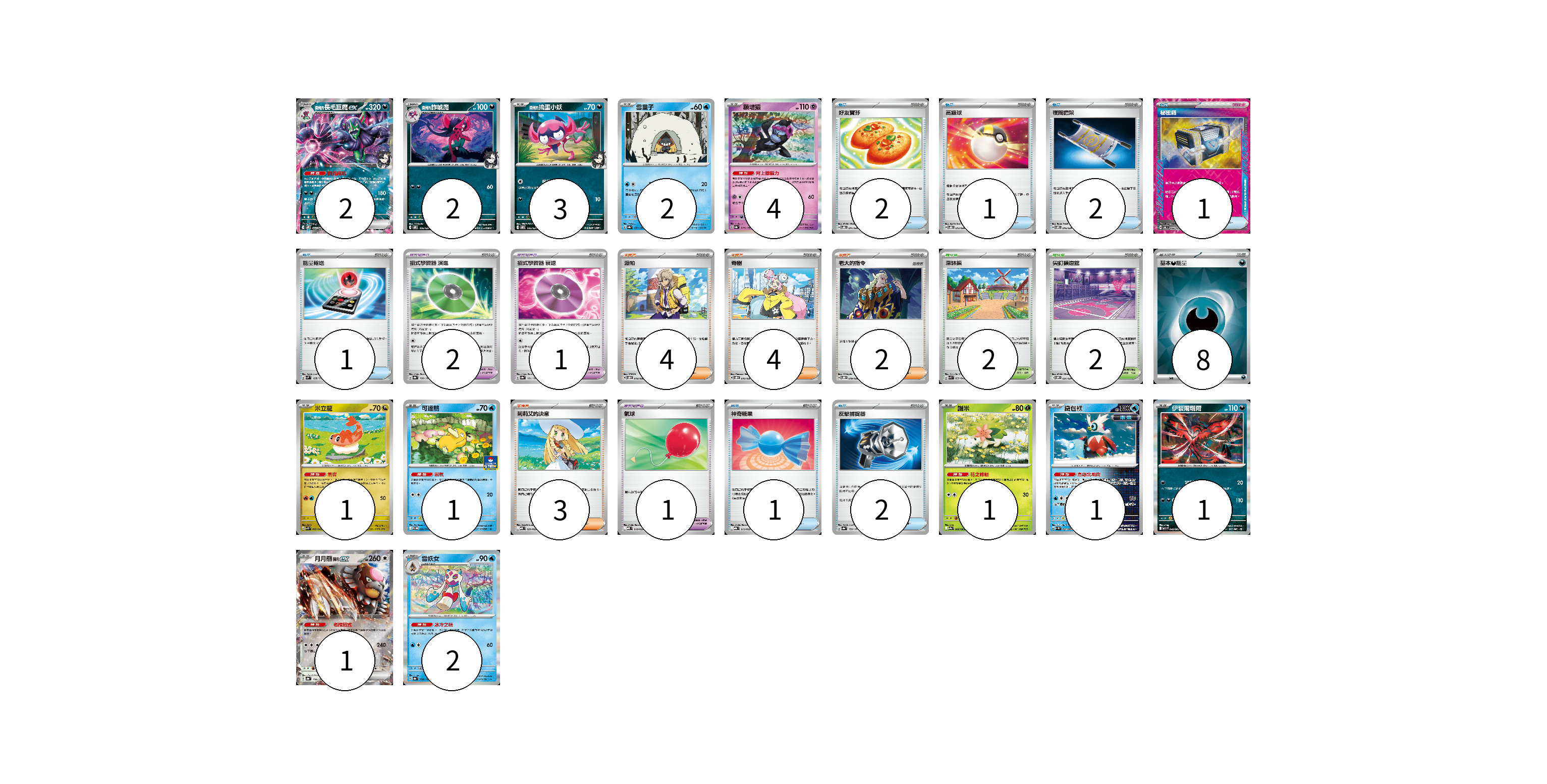 牌組構築方案 以此牌組為基礎新構築牌組 顯示卡面 顯示列表 寶可夢卡(21) 2 2 3 2 4 1 1 1 1 1 1 2 寶可夢道具(4) 2 1 1 物品卡(10) 2 1 2 1 1 1 2 支援者卡(13) 4 4 2 3 競技場卡(4) 2 2 能量卡(8) 8 寶可夢卡(21) 卡牌名稱 張數 卡牌名稱 張數 <瑪俐的>長毛巨魔ex SVOM 007/021 02 <瑪俐的>詐唬魔 SVOM 006/021 02 <瑪俐的>搗蛋小妖 SVOM 005/021 03 雪童子 SV8a 037/187 02 願增猿 SV8a 075/187 04 米立龍 SVK 002/042 01 可達鴨 SV-P 220/SV-P 01 謝米 SV9a 006/063 01 鐵包袱 SV4M 020/066 01 伊裴爾塔爾 M1L 040/063 01 月月熊 赫月ex SV8a 134/187 01 雪妖女 SV8a 038/187 02 寶可夢道具(4) 卡牌名稱 張數 卡牌名稱 張數 招式學習器 演進 SV8a 160/187 02 招式學習器 衰退 SV8a 161/187 01 氣球 MBD 018/022 01 物品卡(10) 卡牌名稱 張數 卡牌名稱 張數 好友寶芬 SVOD 011/020 02 高級球 SVOD 012/020 01 夜間擔架 SVOM 016/021 02 秘密箱 SV6 092/101 01 能量輸送 SVM 128/175 01 神奇糖果 MBG 013/022 01 反擊捕捉器 SV8a 139/187 02 支援者卡(13) 卡牌名稱 張數 卡牌名稱 張數 派帕 SVOD 018/020 04 奇樹 SVOD 016/020 04 老大的指令 SVOD 019/020 02 莉莉艾的決意 MBD 021/022 03 競技場卡(4) 卡牌名稱 張數 卡牌名稱 張數 深缽鎮 SVK 039/042 02 尖釘鎮道館 SVOM 021/021 02 能量卡(8) 卡牌名稱 張數 卡牌名稱 張數 基本【惡】能量 SVOM DAR 08 以此牌組為基礎新構築牌組 牌組編碼 FBdBix-XHjRqo-SKsatd copy 列印牌組單 牌組編碼已複製 分享至SNS