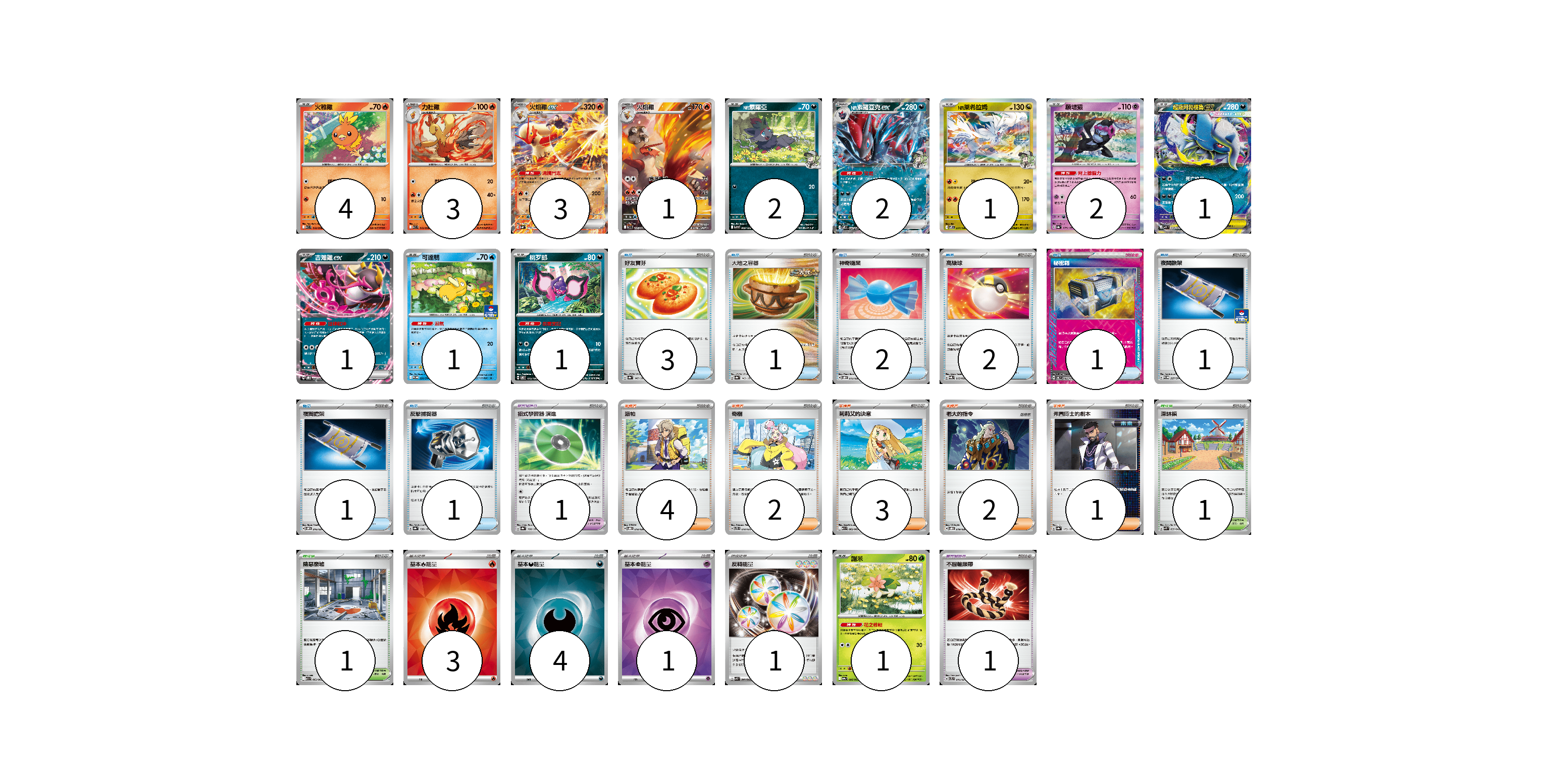 牌組構築方案 以此牌組為基礎新構築牌組 顯示卡面 顯示列表 寶可夢卡(23) 4 3 3 1 2 2 1 2 1 1 1 1 1 寶可夢道具(2) 1 1 物品卡(12) 3 1 2 2 1 1 1 1 支援者卡(12) 4 2 3 2 1 競技場卡(2) 1 1 能量卡(9) 3 4 1 1 寶可夢卡(23) 卡牌名稱 張數 卡牌名稱 張數 火稚雞 SV10 018/098 04 力壯雞 SV10 019/098 03 火焰雞ex SVM 016/175 03 火焰雞 SV10 101/098 01 N的索羅亞 SV9 060/100 02 N的索羅亞克ex SV9 061/100 02 N的萊希拉姆 SV9 074/100 01 願增猿 SV8a 075/187 02 超級阿勃梭魯ex M1L 038/063 01 吉雉雞ex SVOD 004/020 01 可達鴨 SV-P 220/SV-P 01 桃歹郎 SV8 075/106 01 謝米 SV9a 006/063 01 寶可夢道具(2) 卡牌名稱 張數 卡牌名稱 張數 招式學習器 演進 SV8a 160/187 01 不服輸頭帶 SVTL 016/021 01 物品卡(12) 卡牌名稱 張數 卡牌名稱 張數 好友寶芬 SV8a 147/187 03 大地之容器 SV8a 143/187 01 神奇糖果 SVOD 013/020 02 高級球 SVQL 015/022 02 秘密箱 SV6 092/101 01 夜間擔架 SV-P 227/SV-P 01 夜間擔架 SVOM 016/021 01 反擊捕捉器 SV8a 139/187 01 支援者卡(12) 卡牌名稱 張數 卡牌名稱 張數 派帕 SVOD 018/020 04 奇樹 SVTS 018/022 02 莉莉艾的決意 M1L 062/063 03 老大的指令 SVOD 019/020 02 弗圖博士的劇本 SV8a 175/187 01 競技場卡(2) 卡牌名稱 張數 卡牌名稱 張數 深缽鎮 SVK 039/042 01 險惡廢墟 M1L 063/063 01 能量卡(9) 卡牌名稱 張數 卡牌名稱 張數 基本【火】能量 SVQL FIR 03 基本【惡】能量 SVOM DAR 04 基本【超】能量 SVOD PSY 01 反轉能量 SVK 041/042 01 以此牌組為基礎新構築牌組 牌組編碼 FCOBQK-CCCLRP-Jittqf copy 列印牌組單 牌組編碼已複製 分享至SNS