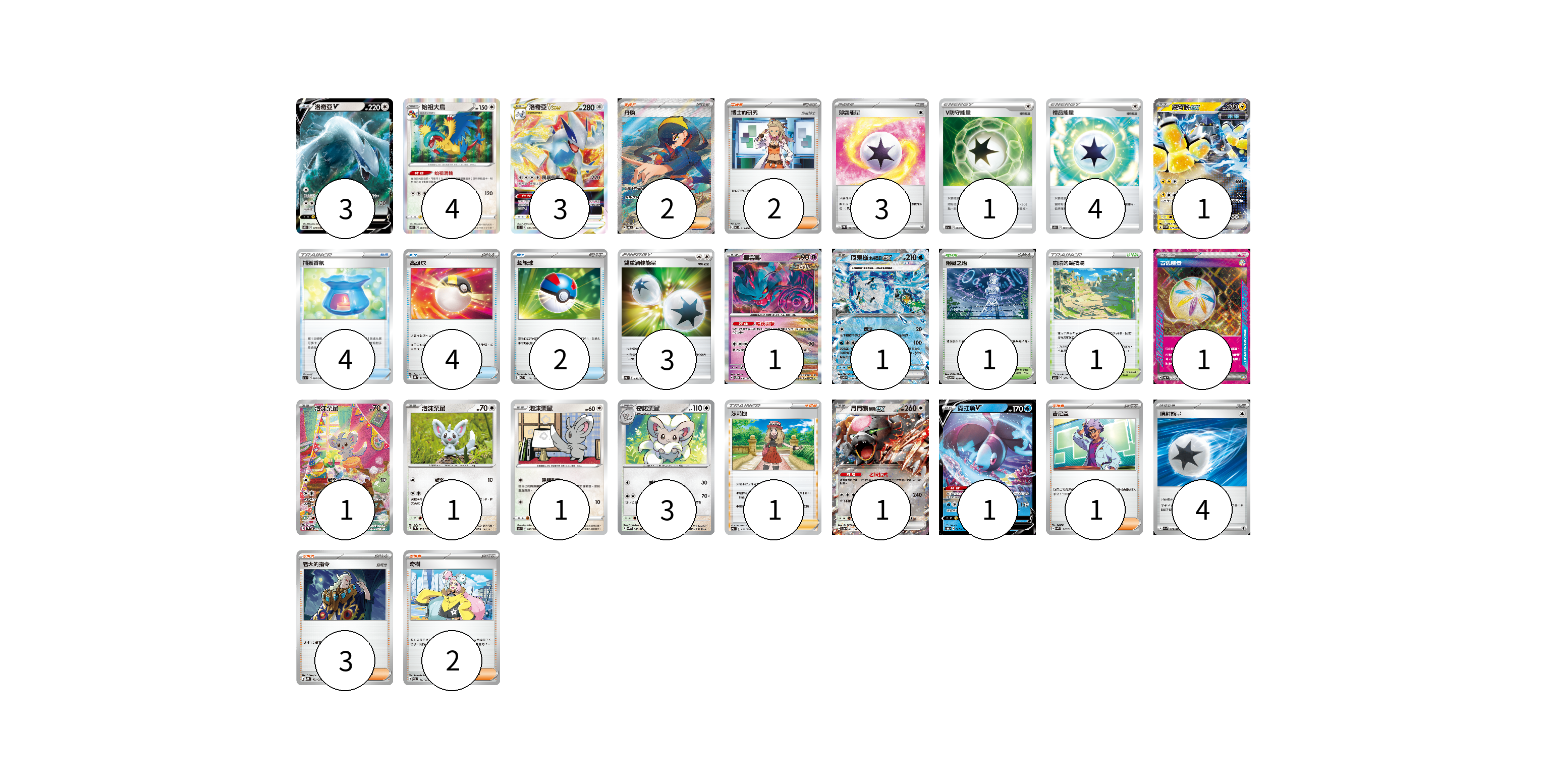 牌組構築方案 以此牌組為基礎新構築牌組 顯示卡面 顯示列表 寶可夢卡(21) 3 4 3 1 1 1 1 1 1 3 1 1 物品卡(10) 4 4 2 支援者卡(11) 2 2 1 1 3 2 競技場卡(2) 1 1 能量卡(16) 3 1 4 3 1 4 寶可夢卡(21) 卡牌名稱 張數 卡牌名稱 張數 洛奇亞V S12 079/098 03 始祖大鳥 S12 083/098 04 洛奇亞VSTAR S12 080/098 03 鐵臂膀ex SV4M 027/066 01 振翼髮 SV5K 033/071 01 厄鬼椪 水井面具ex SV6 038/101 01 泡沫栗鼠 SV5K 082/071 01 泡沫栗鼠 SV5K 059/071 01 泡沫栗鼠 S9 085/100 01 奇諾栗鼠 SV5K 060/071 03 月月熊 赫月 ex SV5a 052/066 01 霓虹魚V SVHM 001/022 01 物品卡(10) 卡牌名稱 張數 卡牌名稱 張數 捕獲香氛 S11a 060/068 04 高級球 SVHK 013/022 04 超級球 SVD 117/139 02 支援者卡(11) 卡牌名稱 張數 卡牌名稱 張數 丹瑜 SV6 123/101 02 博士的研究 SVEL 018/020 02 莎莉娜 SVF 028/038 01 吉尼亞 SVAL 017/021 01 老大的指令 SVHK 022/022 03 奇樹 SVEM 017/020 02 競技場卡(2) 卡牌名稱 張數 卡牌名稱 張數 阻礙之塔 SV6 100/101 01 崩塌的競技場 S12a 167/172 01 能量卡(16) 卡牌名稱 張數 卡牌名稱 張數 薄霧能量 SV5M 071/071 03 V防守能量 S11a 068/068 01 禮品能量 S11 100/100 04 雙重渦輪能量 SVF 038/038 03 古舊能量 SV6 101/101 01 噴射能量 SV1a 072/073 04 以此牌組為基礎新構築牌組 牌組編碼 FCrHvN-Ckhtsc-SIpRbs copy 列印牌組單 牌組編碼已複製 分享至SNS