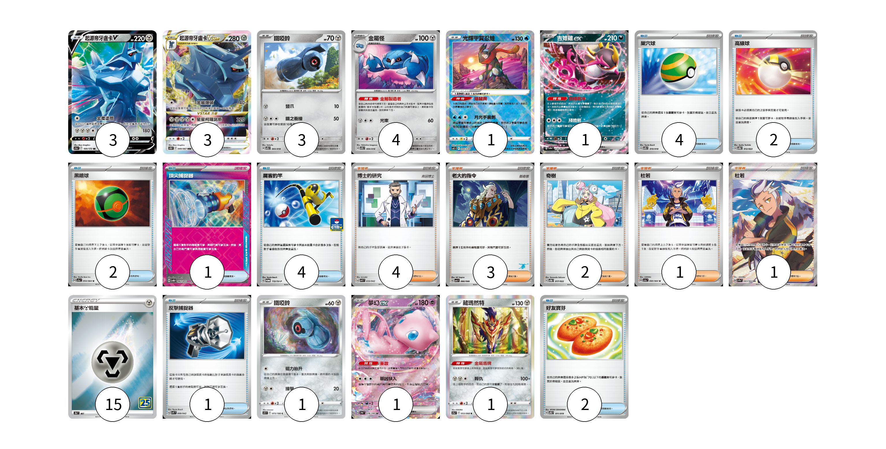牌組構築方案 以此牌組為基礎新構築牌組 顯示卡面 顯示列表 寶可夢卡(18) 3 3 3 4 1 1 1 1 1 物品卡(16) 4 2 2 1 4 1 2 支援者卡(11) 4 3 2 1 1 能量卡(15) 15 寶可夢卡(18) 卡牌名稱 張數 卡牌名稱 張數 起源帝牙盧卡V S12a 100/172 03 起源帝牙盧卡VSTAR S10D 049/067 03 鐵啞鈴 SVTH 003/018 03 金屬怪 SVTH 004/018 04 光輝甲賀忍蛙 SVF 004/038 01 吉雉雞ex SV6a 038/064 01 鐵啞鈴 S11 073/100 01 夢幻ex SV4a 076/190 01 藏瑪然特 S11a 053/068 01 物品卡(16) 卡牌名稱 張數 卡牌名稱 張數 巢穴球 SVTH 010/018 04 高級球 SVTM 012/022 02 黑暗球 SV7a 054/064 02 頂尖捕捉器 SV5M 062/071 01 厲害釣竿 SV-P 112/SV-P 04 反擊捕捉器 SVK 009/042 01 好友寶芬 SVTG 011/019 02 支援者卡(11) 卡牌名稱 張數 卡牌名稱 張數 博士的研究 SVK 033/042 04 老大的指令 SVI 066/066 03 奇樹 SVTM 017/022 02 杜若 SV7a 060/064 01 杜若 SV7a 083/064 01 能量卡(15) 卡牌名稱 張數 卡牌名稱 張數 基本鋼能量 S8a MET 15 以此牌組為基礎新構築牌組 牌組編碼 FDUFmj-mOhFRL-acysGZ copy 列印牌組單 牌組編碼已複製 分享至SNS