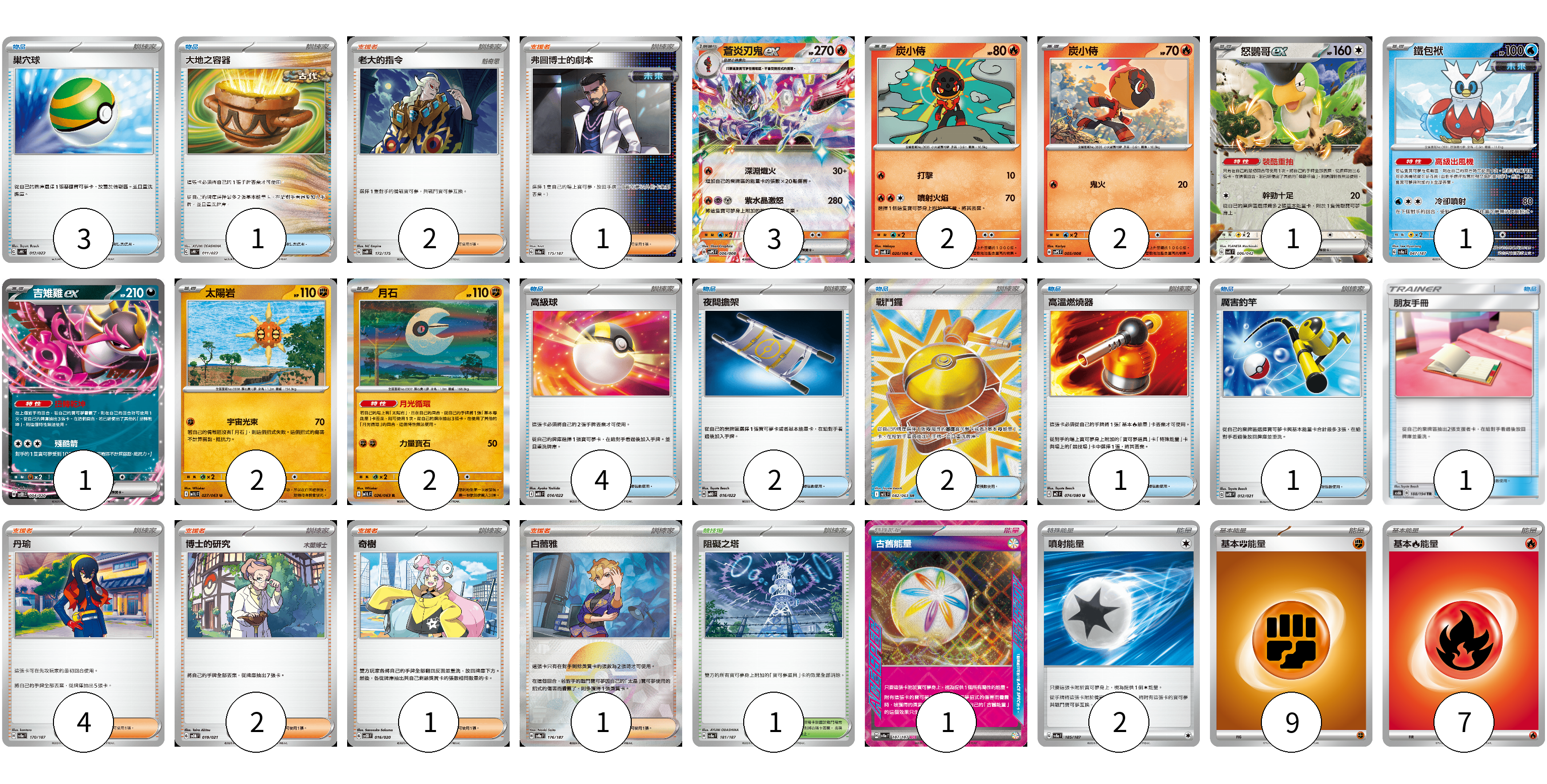 牌組構築方案 以此牌組為基礎新構築牌組 顯示卡面 顯示列表 寶可夢卡(14) 3 2 2 1 1 1 2 2 物品卡(15) 3 1 4 2 2 1 1 1 支援者卡(11) 2 1 4 2 1 1 競技場卡(1) 1 能量卡(19) 1 2 9 7 寶可夢卡(14) 卡牌名稱 張數 卡牌名稱 張數 蒼炎刃鬼ex SVPS 006/008 03 炭小侍 SV8 020/106 02 炭小侍 SVPS 005/008 02 怒鸚哥ex SVK 006/042 01 鐵包袱 SV8a 047/187 01 吉雉雞ex SVOD 004/020 01 太陽岩 M1L 027/063 02 月石 M1L 026/063 02 物品卡(15) 卡牌名稱 張數 卡牌名稱 張數 巢穴球 SVHK 012/022 03 大地之容器 SVHK 011/022 01 高級球 MBD 014/022 04 夜間擔架 MBD 016/022 02 戰鬥鑼 M1L 082/063 02 高溫燃燒器 M2 074/080 01 厲害釣竿 SVTR 012/021 01 朋友手冊 AS6b 188/194 01 支援者卡(11) 卡牌名稱 張數 卡牌名稱 張數 老大的指令 SVM 172/175 02 弗圖博士的劇本 SV8a 175/187 01 丹瑜 SV8a 170/187 04 博士的研究 SVOM 019/021 02 奇樹 SVOD 016/020 01 白蕾雅 SV8a 176/187 01 競技場卡(1) 卡牌名稱 張數 卡牌名稱 張數 阻礙之塔 SV8a 181/187 01 能量卡(19) 卡牌名稱 張數 卡牌名稱 張數 古舊能量 SV8a 187/187 01 噴射能量 SV8a 185/187 02 基本鬥能量 sv-p FIG 09 基本火能量 sv-p FIR 07 以此牌組為基礎新構築牌組 牌組編碼 FDnogw-UDBgbp-AJijWd copy 列印牌組單 牌組編碼已複製 分享至SNS