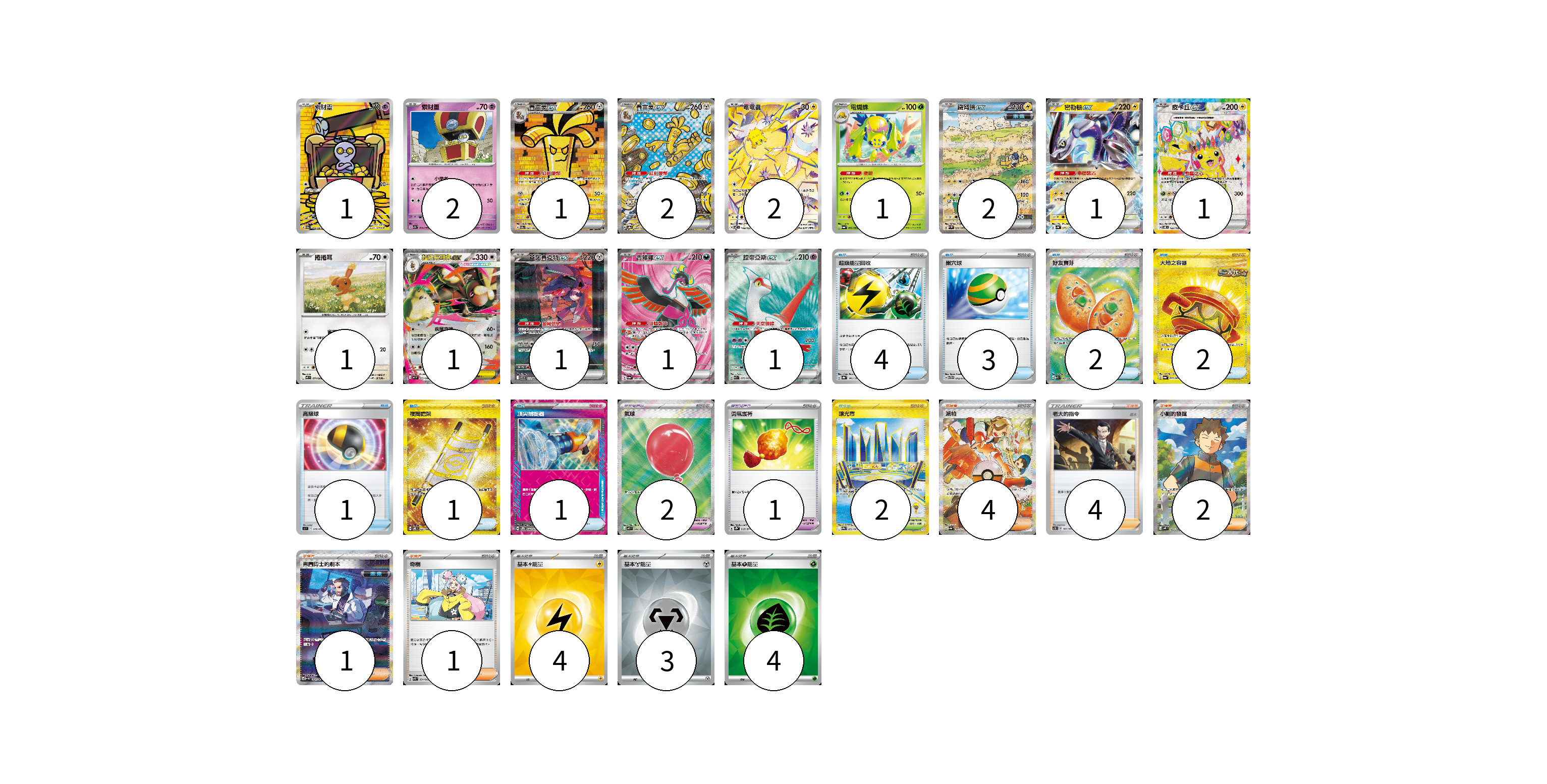 牌組構築方案 以此牌組為基礎新構築牌組 顯示卡面 顯示列表 寶可夢卡(18) 1 2 1 2 2 1 2 1 1 1 1 1 1 1 寶可夢道具(3) 2 1 物品卡(14) 4 3 2 2 1 1 1 支援者卡(12) 4 4 2 1 1 競技場卡(2) 2 能量卡(11) 4 3 4 寶可夢卡(18) 卡牌名稱 張數 卡牌名稱 張數 索財靈 SV3a 068/062 01 索財靈 SV7a 024/064 02 賽富豪ex SV3a 087/062 01 賽富豪ex SV8a 220/187 02 電電蟲 SV7 108/102 02 電蜘蛛 SV6a 002/064 01 鐵臂膀ex SV4M 088/066 02 密勒頓ex SV4a 071/190 01 皮卡丘ex SV8 122/106 01 捲捲耳 M2 071/080 01 超級長耳兔ex M2 072/080 01 蓋諾賽克特ex SV11B 172/086 01 吉雉雞ex SV6a 081/064 01 拉帝亞斯ex SV7a 078/064 01 寶可夢道具(3) 卡牌名稱 張數 卡牌名稱 張數 氣球 M1L 084/063 02 勇氣護符 SV2D 067/071 01 物品卡(14) 卡牌名稱 張數 卡牌名稱 張數 超級能量回收 SV8a 141/187 04 巢穴球 SVTG 012/019 03 好友寶芬 M1S 081/063 02 大地之容器 SV6a 093/064 02 高級球 SI 375/414 01 夜間擔架 SV8 137/106 01 頂尖捕捉器 SV5M 062/071 01 支援者卡(12) 卡牌名稱 張數 卡牌名稱 張數 派帕 SV4a 353/190 04 老大的指令(坂木) SC1D 161/164 04 小剛的發掘 SV9 123/100 02 弗圖博士的劇本 SV4M 091/066 01 奇樹 SVK 031/042 01 競技場卡(2) 卡牌名稱 張數 卡牌名稱 張數 釀光市 SV9a 092/063 02 能量卡(11) 卡牌名稱 張數 卡牌名稱 張數 基本【雷】能量 SVQP LIG 04 基本【鋼】能量 SVOD MET 03 基本【草】能量 SVM GRA 04 以此牌組為基礎新構築牌組 牌組編碼 FELyvE-dgbsRO-lwDaYc copy 列印牌組單 牌組編碼已複製 分享至SNS
