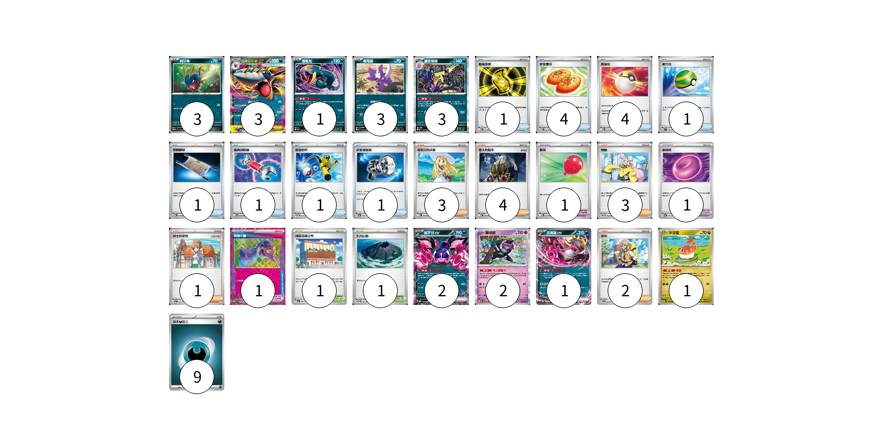 牌組構築方案 以此牌組為基礎新構築牌組 顯示卡面 顯示列表 寶可夢卡(19) 3 3 1 3 3 2 2 1 1 寶可夢道具(3) 1 1 1 物品卡(14) 1 4 4 1 1 1 1 1 支援者卡(13) 3 4 3 1 2 競技場卡(2) 1 1 能量卡(9) 9 寶可夢卡(19) 卡牌名稱 張數 卡牌名稱 張數 利牙魚 M2 050/080 03 超級巨牙鯊ex M2 051/080 03 飯匙蛇 M2 052/080 01 毒電嬰 M2 056/080 03 顫弦蠑螈 M2 057/080 03 桃歹郎ex MBG 009/022 02 願增猿 SV8a 075/187 02 吉雉雞ex SVOM 009/021 01 米立龍 MBD 010/022 01 寶可夢道具(3) 卡牌名稱 張數 卡牌名稱 張數 氣球 MBG 019/022 01 鎖鏈糬 SV8a 154/187 01 英雄斗篷 SV5M 064/071 01 物品卡(14) 卡牌名稱 張數 卡牌名稱 張數 超級信號 MBG 016/022 01 好友寶芬 MBD 013/022 04 高級球 MBD 014/022 04 巢穴球 SVK 016/042 01 夜間擔架 MBD 016/022 01 道具拆除器 SV11W 080/086 01 厲害釣竿 SVOM 011/021 01 反擊捕捉器 SV8a 139/187 01 支援者卡(13) 卡牌名稱 張數 卡牌名稱 張數 莉莉艾的決意 MBD 021/022 03 老大的指令 MBD 020/022 04 奇樹 SVOM 018/021 03 博士的研究 SVM 166/175 01 派帕 SVTL 020/021 02 競技場卡(2) 卡牌名稱 張數 卡牌名稱 張數 城鎮百貨公司 SV4a 183/190 01 引力山岳 SV8 106/106 01 能量卡(9) 卡牌名稱 張數 卡牌名稱 張數 基本惡能量 sv-p DAR 09 以此牌組為基礎新構築牌組 牌組編碼 FEMvMN-mkufUx-KIfoqw copy 列印牌組單 牌組編碼已複製 分享至SNS