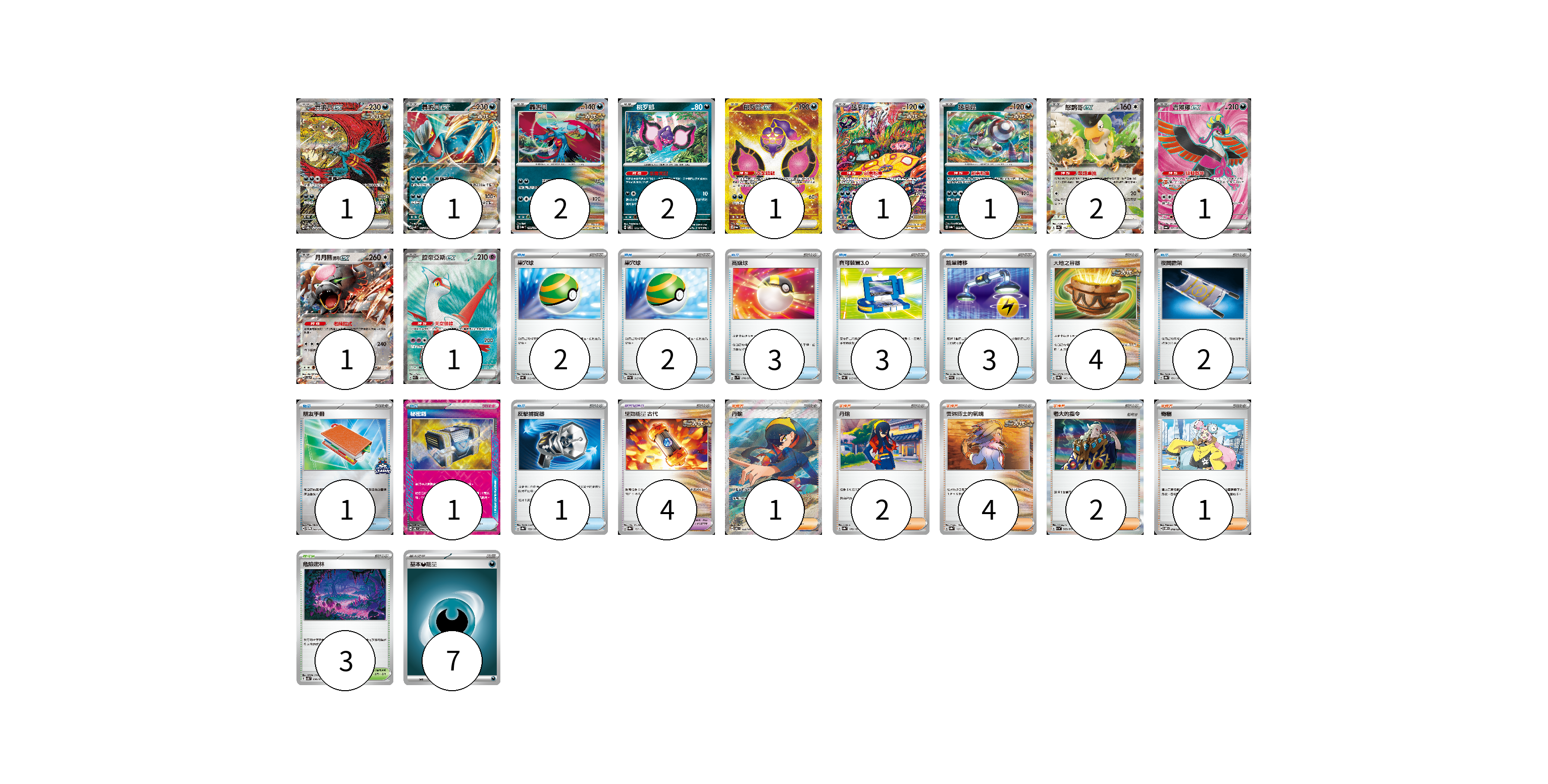 牌組構築方案 以此牌組為基礎新構築牌組 顯示卡面 顯示列表 寶可夢卡(14) 1 1 2 2 1 1 1 2 1 1 1 寶可夢道具(4) 4 物品卡(22) 2 2 3 3 3 4 2 1 1 1 支援者卡(10) 1 2 4 2 1 競技場卡(3) 3 能量卡(7) 7 寶可夢卡(14) 卡牌名稱 張數 卡牌名稱 張數 轟鳴月ex SV8a 218/187 01 轟鳴月ex SV4K 054/066 01 轟鳴月 SV8a 100/187 02 桃歹郎 SV8 075/106 02 桃歹郎ex SV6a 092/064 01 猛惡菇 SV4K 077/066 01 猛惡菇 SV8a 099/187 01 怒鸚哥ex SV4a 154/190 02 吉雉雞ex SV6a 081/064 01 月月熊 赫月 ex SV5a 052/066 01 拉帝亞斯ex SV7a 078/064 01 寶可夢道具(4) 卡牌名稱 張數 卡牌名稱 張數 驅勁能量 古代 SV8a 157/187 04 物品卡(22) 卡牌名稱 張數 卡牌名稱 張數 巢穴球 SVAL 012/021 02 巢穴球 SVAM 015/023 02 高級球 SV1V 070/078 03 寶可裝置3.0 SVAL 015/021 03 能量轉移 SVAM 012/023 03 大地之容器 SV8a 143/187 04 夜間擔架 SV8a 151/187 02 朋友手冊 SV-P 182/SV-P 01 秘密箱 SV6 092/101 01 反擊捕捉器 SV8a 139/187 01 支援者卡(10) 卡牌名稱 張數 卡牌名稱 張數 丹瑜 SV6 123/101 01 丹瑜 SV8a 170/187 02 奧琳博士的氣魄 SV8a 167/187 04 老大的指令 SV1a 069/073 02 奇樹 SVOM 018/021 01 競技場卡(3) 卡牌名稱 張數 卡牌名稱 張數 危險密林 SV5K 070/071 03 能量卡(7) 卡牌名稱 張數 卡牌名稱 張數 基本惡能量 sv-p DAR 07 以此牌組為基礎新構築牌組 牌組編碼 FFOMjY-mqcqQI-IPdukA copy 列印牌組單 牌組編碼已複製 分享至SNS