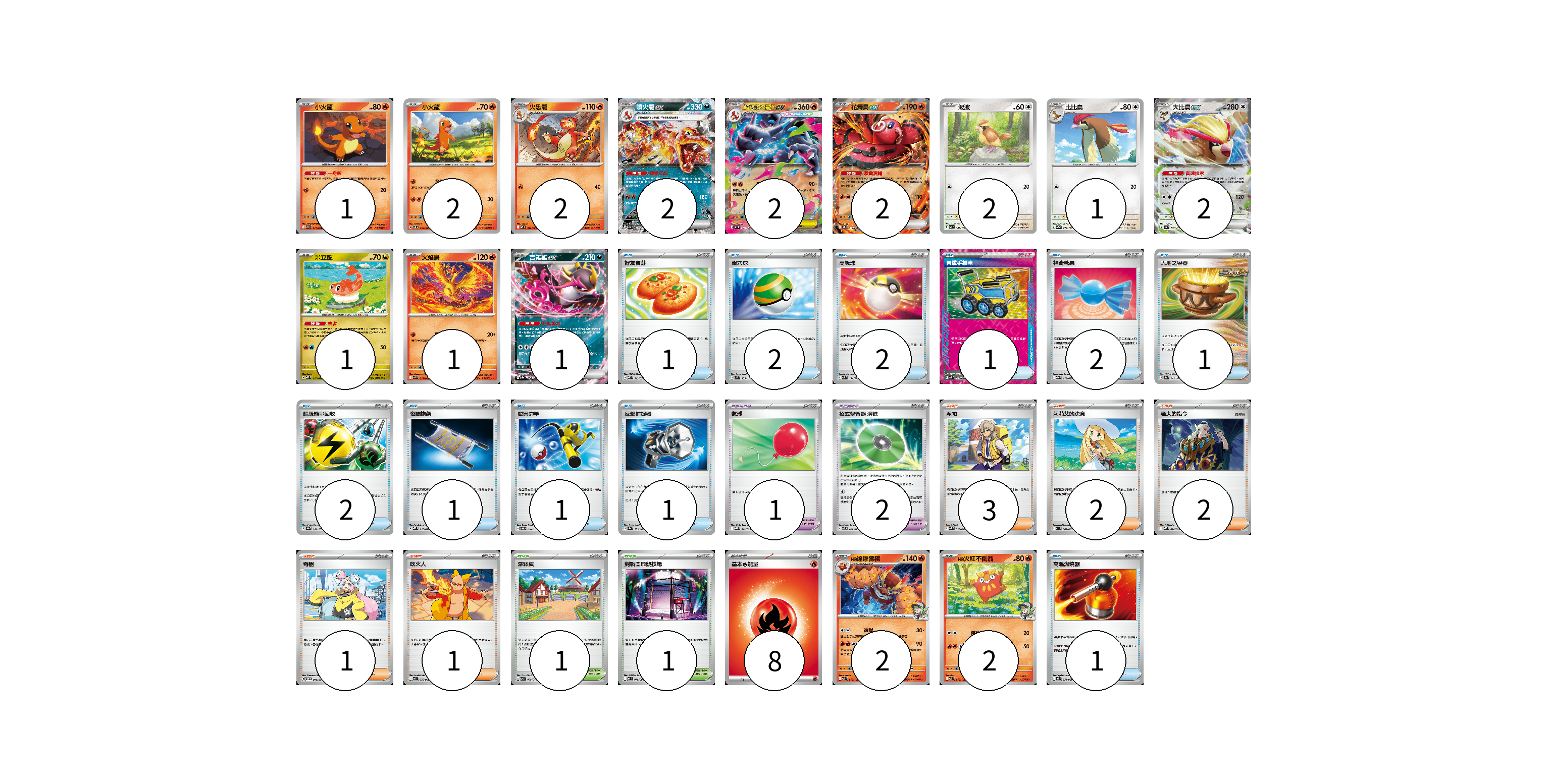 牌組構築方案 以此牌組為基礎新構築牌組 顯示卡面 顯示列表 寶可夢卡(23) 1 2 2 2 2 2 2 1 2 1 1 1 2 2 寶可夢道具(3) 1 2 物品卡(15) 1 2 2 1 2 1 2 1 1 1 1 支援者卡(9) 3 2 2 1 1 競技場卡(2) 1 1 能量卡(8) 8 寶可夢卡(23) 卡牌名稱 張數 卡牌名稱 張數 小火龍 M2 011/080 01 小火龍 SVTL 001/021 02 火恐龍 M2 012/080 02 噴火龍ex SV4a 115/190 02 超級噴火龍Xex M2 013/080 02 花舞鳥ex M2 018/080 02 波波 SV3 087/108 02 比比鳥 SV2a 017/165 01 大比鳥ex SV4a 139/190 02 米立龍 MBD 010/022 01 火焰鳥 M2 014/080 01 吉雉雞ex SV8a 104/187 01 N的達摩狒狒 SV9 016/100 02 N的火紅不倒翁 SV9 015/100 02 寶可夢道具(3) 卡牌名稱 張數 卡牌名稱 張數 氣球 MBG 019/022 01 招式學習器 演進 SVTL 017/021 02 物品卡(15) 卡牌名稱 張數 卡牌名稱 張數 好友寶芬 MBD 013/022 01 巢穴球 SVM 133/175 02 高級球 SVM 134/175 02 貴重手推車 SVK 020/042 01 神奇糖果 MBG 013/022 02 大地之容器 SV8a 143/187 01 超級能量回收 SV8a 141/187 02 夜間擔架 MBD 016/022 01 厲害釣竿 SVOD 010/020 01 反擊捕捉器 SV8a 139/187 01 高溫燃燒器 M2 074/080 01 支援者卡(9) 卡牌名稱 張數 卡牌名稱 張數 派帕 SVK 035/042 03 莉莉艾的決意 M1L 062/063 02 老大的指令 MBD 020/022 02 奇樹 SVOM 018/021 01 吹火人 M2 078/080 01 競技場卡(2) 卡牌名稱 張數 卡牌名稱 張數 深缽鎮 SVK 039/042 01 對戰圓形競技場 M2 079/080 01 能量卡(8) 卡牌名稱 張數 卡牌名稱 張數 基本【火】能量 M-P FIR 08 以此牌組為基礎新構築牌組 牌組編碼 FHgnnA-DDrnru-roFEYz copy 列印牌組單 牌組編碼已複製 分享至SNS