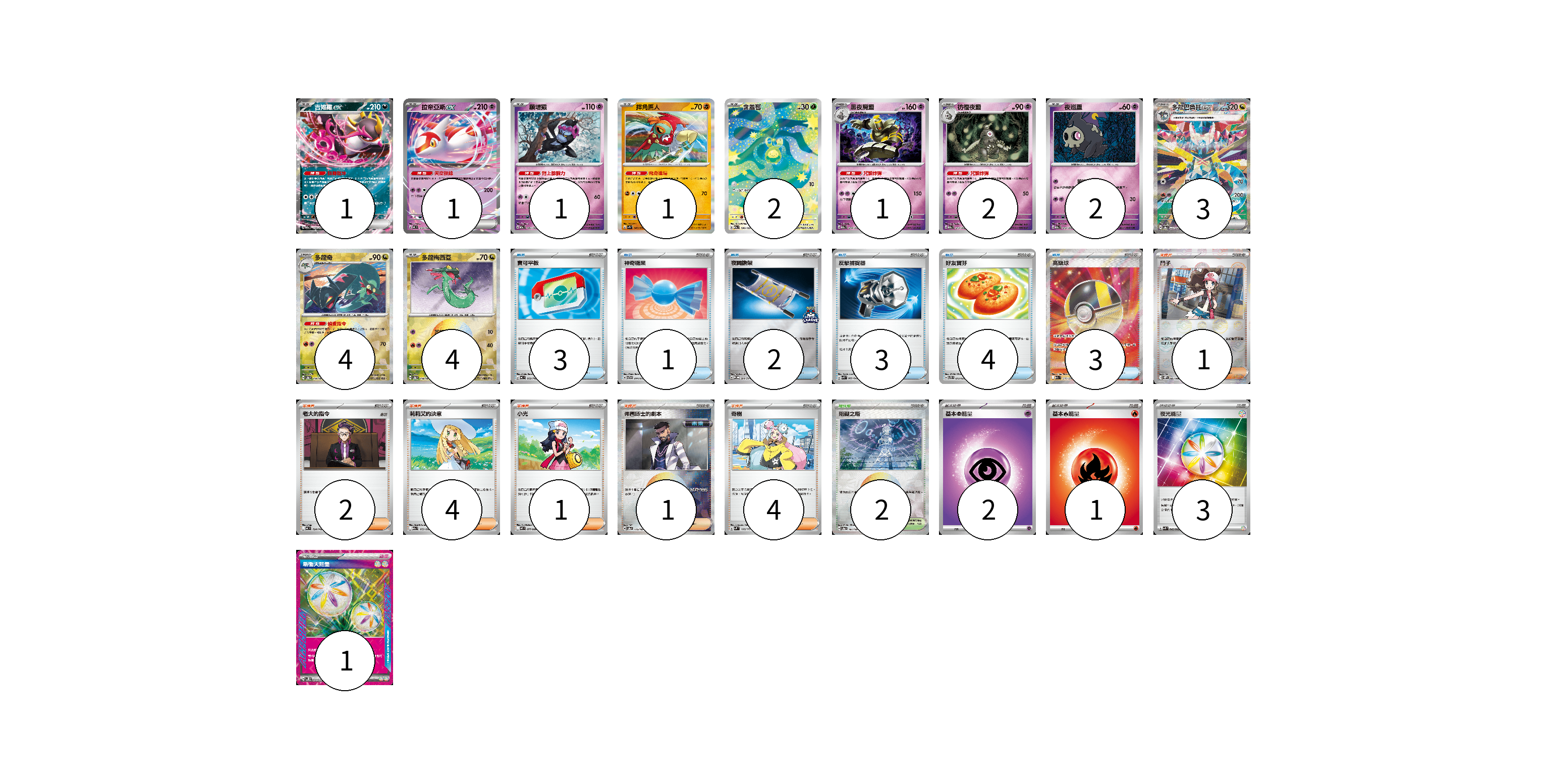 牌組構築方案 以此牌組為基礎新構築牌組 顯示卡面 顯示列表 寶可夢卡(22) 1 1 1 1 2 1 2 2 3 4 4 物品卡(16) 3 1 2 3 4 3 支援者卡(13) 1 2 4 1 1 4 競技場卡(2) 2 能量卡(7) 2 1 3 1 寶可夢卡(22) 卡牌名稱 張數 卡牌名稱 張數 吉雉雞ex M2a 114/193 01 拉帝亞斯ex MC 312/742 01 願增猿 M2a 081/193 01 摔角鷹人 SV1S 045/078 01 含羞苞 M2a 196/193 02 黑夜魔靈 M2a 074/193 01 彷徨夜靈 M2a 073/193 02 夜巡靈 M2a 072/193 02 多龍巴魯托ex SV8a 221/187 03 多龍奇 SV8a 119/187 04 多龍梅西亞 SV8a 118/187 04 物品卡(16) 卡牌名稱 張數 卡牌名稱 張數 寶可平板 MC 662/742 03 神奇糖果 SVTG 014/019 01 夜間擔架 SV-P 204/SV-P 02 反擊捕捉器 SVK 009/042 03 好友寶芬 SVTS 012/022 04 高級球 M2a 216/193 03 支援者卡(13) 卡牌名稱 張數 卡牌名稱 張數 鬥子 SV11W 085/086 01 老大的指令 MC 724/742 02 莉莉艾的決意 M2a 175/193 04 小光 M2 077/080 01 弗圖博士的劇本 SV8a 175/187 01 奇樹 SVM 160/175 04 競技場卡(2) 卡牌名稱 張數 卡牌名稱 張數 阻礙之塔 SV8a 181/187 02 能量卡(7) 卡牌名稱 張數 卡牌名稱 張數 基本【超】能量 MC PSY 02 基本【火】能量 MC FIR 01 夜光能量 SVK 042/042 03 新衝天能量 SV5K 071/071 01 以此牌組為基礎新構築牌組 牌組編碼 FKVCpH-dhcmer-pTXeht copy 列印牌組單 牌組編碼已複製 分享至SNS