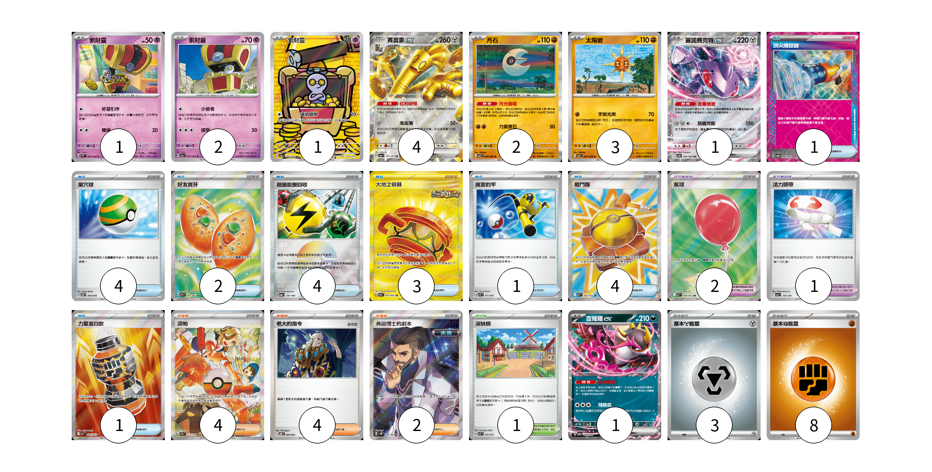 牌組構築方案 以此牌組為基礎新構築牌組 顯示卡面 顯示列表 寶可夢卡(15) 1 2 1 4 2 3 1 1 寶可夢道具(3) 2 1 物品卡(20) 1 4 2 4 3 1 4 1 支援者卡(10) 4 4 2 競技場卡(1) 1 能量卡(11) 3 8 寶可夢卡(15) 卡牌名稱 張數 卡牌名稱 張數 索財靈 SV3a 020/062 01 索財靈 SV7a 024/064 02 索財靈 SV3a 068/062 01 賽富豪ex SV8a 117/187 04 月石 M1L 026/063 02 太陽岩 M1L 027/063 03 蓋諾賽克特ex SV11B 069/086 01 吉雉雞ex SVOD 004/020 01 寶可夢道具(3) 卡牌名稱 張數 卡牌名稱 張數 氣球 M1L 084/063 02 活力頭帶 SVD 125/139 01 物品卡(20) 卡牌名稱 張數 卡牌名稱 張數 頂尖捕捉器 SV5M 062/071 01 巢穴球 SVTH 010/018 04 好友寶芬 M1S 081/063 02 超級能量回收 SV8a 141/187 04 大地之容器 SV6a 093/064 03 厲害釣竿 SVK 011/042 01 戰鬥鑼 M1L 082/063 04 力量蛋白飲 M1L 081/063 01 支援者卡(10) 卡牌名稱 張數 卡牌名稱 張數 派帕 SV4a 353/190 04 老大的指令 MBD 020/022 04 弗圖博士的劇本 SV4M 086/066 02 競技場卡(1) 卡牌名稱 張數 卡牌名稱 張數 深缽鎮 SVK 039/042 01 能量卡(11) 卡牌名稱 張數 卡牌名稱 張數 基本【鋼】能量 M-P MET 03 基本【鬥】能量 M-P FIG 08 以此牌組為基礎新構築牌組 牌組編碼 FLErjb-dGVxQr-RiDbvL copy 列印牌組單 牌組編碼已複製 分享至SNS