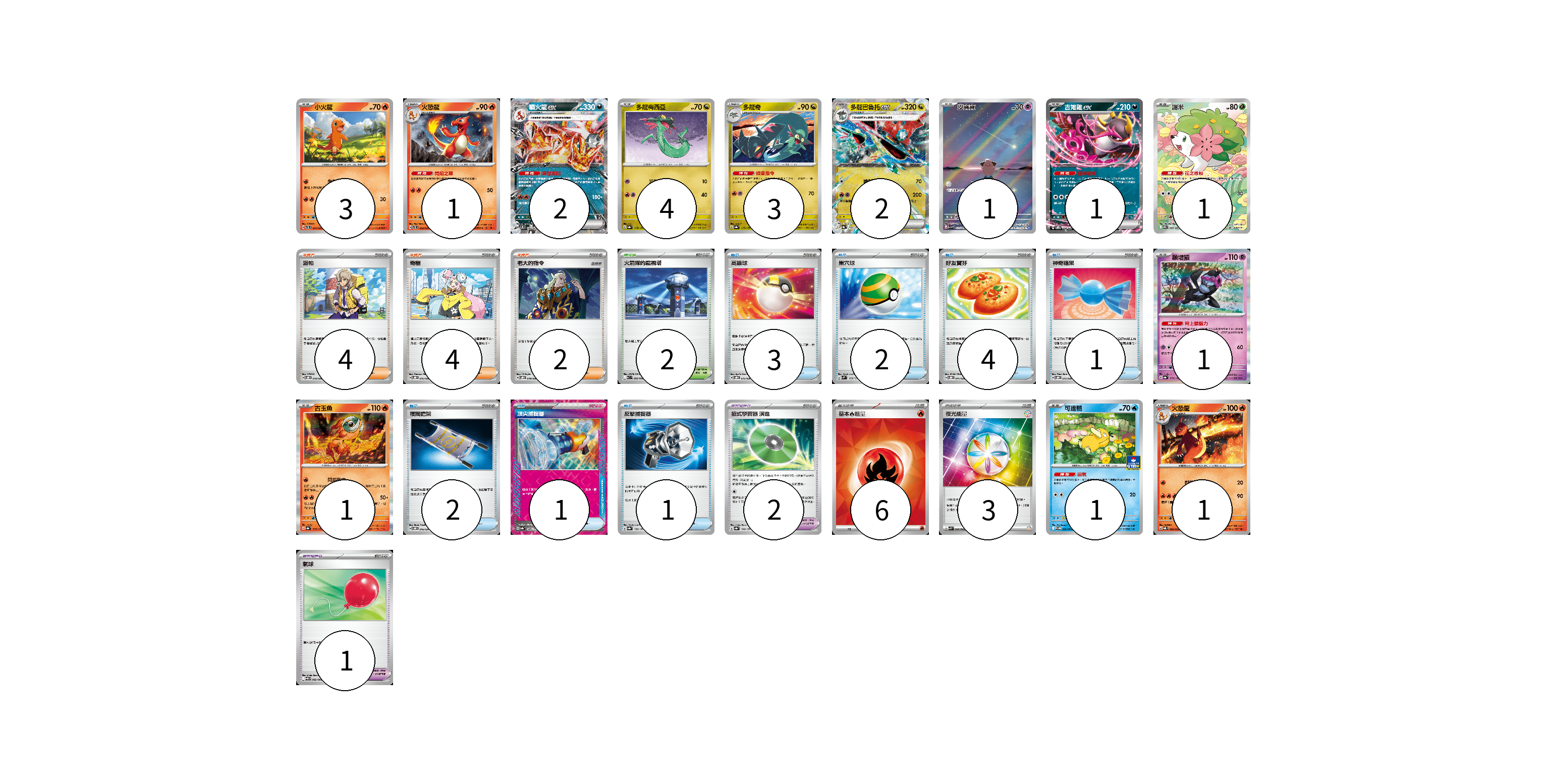 牌組構築方案 以此牌組為基礎新構築牌組 顯示卡面 顯示列表 寶可夢卡(22) 3 1 2 4 3 2 1 1 1 1 1 1 1 寶可夢道具(3) 2 1 物品卡(14) 3 2 4 1 2 1 1 支援者卡(10) 4 4 2 競技場卡(2) 2 能量卡(9) 6 3 寶可夢卡(22) 卡牌名稱 張數 卡牌名稱 張數 小火龍 SVTL 001/021 03 火恐龍 SVTL 002/021 01 噴火龍ex SVTL 006/021 02 多龍梅西亞 SV8a 118/187 04 多龍奇 SV8a 119/187 03 多龍巴魯托ex SV8a 120/187 02 皮寶寶 SV3 113/108 01 吉雉雞ex SVOM 009/021 01 謝米 SV9a 066/063 01 願增猿 SV8a 075/187 01 古玉魚 SV8a 025/187 01 可達鴨 SV-P 220/SV-P 01 火恐龍 SVQL 002/022 01 寶可夢道具(3) 卡牌名稱 張數 卡牌名稱 張數 招式學習器 演進 SV8a 160/187 02 氣球 SV11B 082/086 01 物品卡(14) 卡牌名稱 張數 卡牌名稱 張數 高級球 SVOD 012/020 03 巢穴球 SVM 133/175 02 好友寶芬 SVOD 011/020 04 神奇糖果 SVOD 013/020 01 夜間擔架 SVOM 016/021 02 頂尖捕捉器 SV8a 148/187 01 反擊捕捉器 SV8a 139/187 01 支援者卡(10) 卡牌名稱 張數 卡牌名稱 張數 派帕 SVOD 018/020 04 奇樹 SVOD 016/020 04 老大的指令 SVOD 019/020 02 競技場卡(2) 卡牌名稱 張數 卡牌名稱 張數 火箭隊的監視塔 SV10 096/098 02 能量卡(9) 卡牌名稱 張數 卡牌名稱 張數 基本【火】能量 SVK FIR 06 夜光能量 SVK 042/042 03 以此牌組為基礎新構築牌組 牌組編碼 FLbaCA-LoMeLl-NJZBMj copy 列印牌組單 牌組編碼已複製 分享至SNS