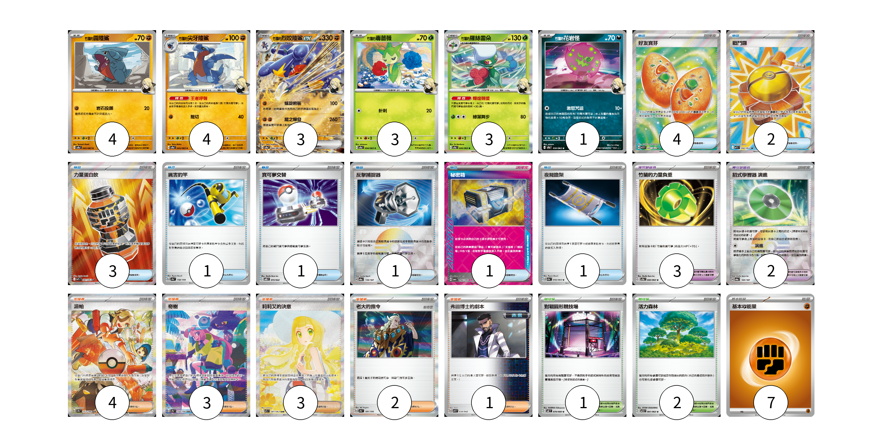 牌組構築方案 以此牌組為基礎新構築牌組 顯示卡面 顯示列表 寶可夢卡(18) 4 4 3 3 3 1 寶可夢道具(5) 3 2 物品卡(14) 4 2 3 1 1 1 1 1 支援者卡(13) 4 3 3 2 1 競技場卡(3) 1 2 能量卡(7) 7 寶可夢卡(18) 卡牌名稱 張數 卡牌名稱 張數 <竹蘭的>圓陸鯊 SV9a 042/063 04 <竹蘭的>尖牙陸鯊 SV9a 043/063 04 <竹蘭的>烈咬陸鯊ex SV9a 044/063 03 <竹蘭的>毒薔薇 SV9a 004/063 03 <竹蘭的>羅絲雷朵 SV9a 005/063 03 <竹蘭的>花岩怪 SV9a 050/063 01 寶可夢道具(5) 卡牌名稱 張數 卡牌名稱 張數 竹蘭的力量負重 SV9a 060/063 03 招式學習器 演進 SV8a 160/187 02 物品卡(14) 卡牌名稱 張數 卡牌名稱 張數 好友寶芬 M1S 081/063 04 戰鬥鑼 M1L 082/063 02 力量蛋白飲 M1L 081/063 03 厲害釣竿 SV4a 158/190 01 寶可夢交替 MBG 015/022 01 反擊捕捉器 SV8a 139/187 01 秘密箱 SV6 092/101 01 夜間擔架 SV6a 056/064 01 支援者卡(13) 卡牌名稱 張數 卡牌名稱 張數 派帕 SV4a 353/190 04 奇樹 SV4a 350/190 03 莉莉艾的決意 M1L 091/063 03 老大的指令 SV4a 181/190 02 弗圖博士的劇本 SVK 034/042 01 競技場卡(3) 卡牌名稱 張數 卡牌名稱 張數 對戰圓形競技場 M2 079/080 01 活力森林 M1S 061/063 02 能量卡(7) 卡牌名稱 張數 卡牌名稱 張數 基本【鬥】能量 SVAM FIG 07 以此牌組為基礎新構築牌組 牌組編碼 FLmAqf-KQzABG-etDntO copy 列印牌組單 牌組編碼已複製 分享至SNS