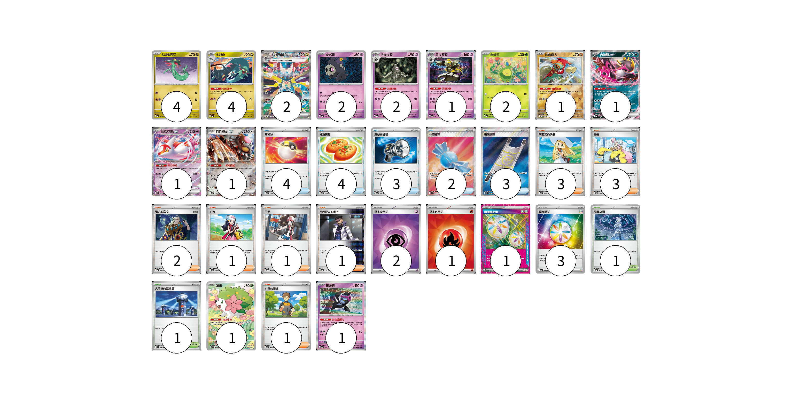 牌組構築方案 以此牌組為基礎新構築牌組 顯示卡面 顯示列表 寶可夢卡(23) 4 4 2 2 2 1 2 1 1 1 1 1 1 物品卡(16) 4 4 3 2 3 支援者卡(12) 3 3 2 1 1 1 1 競技場卡(2) 1 1 能量卡(7) 2 1 1 3 寶可夢卡(23) 卡牌名稱 張數 卡牌名稱 張數 多龍梅西亞 SV8a 118/187 04 多龍奇 SV8a 119/187 04 多龍巴魯托ex SV8a 221/187 02 夜巡靈 SV8a 064/187 02 彷徨夜靈 SV8a 065/187 02 黑夜魔靈 SV8a 066/187 01 含羞苞 SV8a 001/187 02 摔角鷹人 SV8a 084/187 01 吉雉雞ex SV6a 038/064 01 拉帝亞斯ex SV7a 019/064 01 月月熊 赫月ex SV8a 134/187 01 謝米 SV9a 066/063 01 願增猿 M2a 081/193 01 物品卡(16) 卡牌名稱 張數 卡牌名稱 張數 高級球 MBD 014/022 04 好友寶芬 MBD 013/022 04 反擊捕捉器 SV8a 139/187 03 神奇糖果 M1S 082/063 02 夜間擔架 M1L 083/063 03 支援者卡(12) 卡牌名稱 張數 卡牌名稱 張數 莉莉艾的決意 MBD 021/022 03 奇樹 SVOD 016/020 03 老大的指令 MBD 020/022 02 小光 M2 077/080 01 鬥子 SV11W 085/086 01 弗圖博士的劇本 SV8a 175/187 01 小剛的發掘 SV9 096/100 01 競技場卡(2) 卡牌名稱 張數 卡牌名稱 張數 阻礙之塔 SV8a 181/187 01 火箭隊的監視塔 SV10 096/098 01 能量卡(7) 卡牌名稱 張數 卡牌名稱 張數 基本【超】能量 SVK PSY 02 基本【火】能量 SVK FIR 01 新衝天能量 SV5K 071/071 01 夜光能量 SV4a 190/190 03 以此牌組為基礎新構築牌組 牌組編碼 FLmisi-wXQMTR-JFlgWP copy 列印牌組單 牌組編碼已複製 分享至SNS