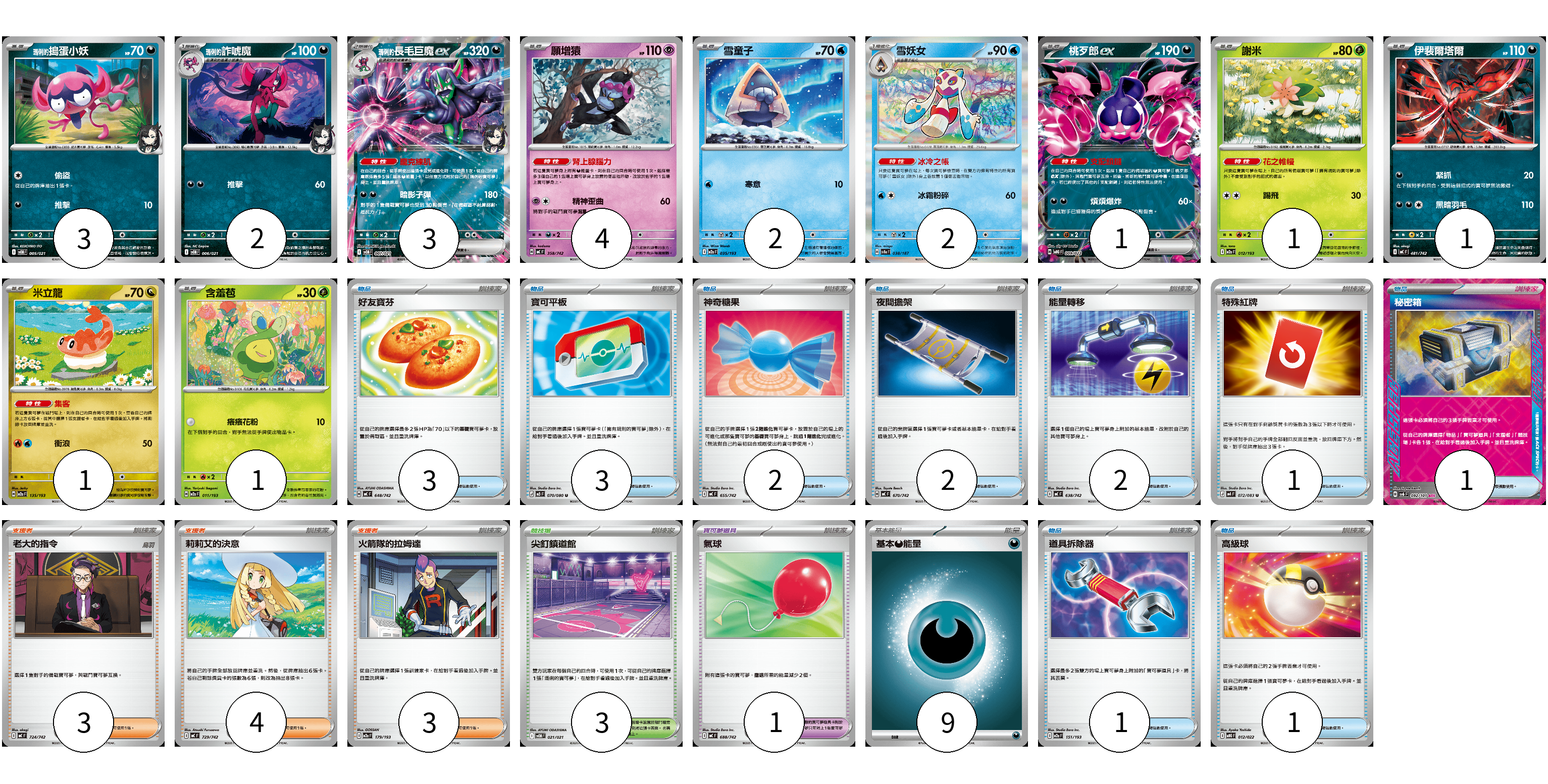 牌組構築方案 以此牌組為基礎新構築牌組 顯示卡面 顯示列表 寶可夢卡(21) 3 2 3 4 2 2 1 1 1 1 1 寶可夢道具(1) 1 物品卡(16) 3 3 2 2 2 1 1 1 1 支援者卡(10) 3 4 3 競技場卡(3) 3 能量卡(9) 9 寶可夢卡(21) 卡牌名稱 張數 卡牌名稱 張數 <瑪俐的>搗蛋小妖 SVOM 005/021 03 <瑪俐的>詐唬魔 SVOM 006/021 02 <瑪俐的>長毛巨魔ex SVOM 007/021 03 願增猿 MC 358/742 04 雪童子 M2a 035/193 02 雪妖女 SV8a 038/187 02 桃歹郎ex MBG 009/022 01 謝米 M2a 012/193 01 伊裴爾塔爾 MC 481/742 01 米立龍 M2a 135/193 01 含羞苞 M2a 011/193 01 寶可夢道具(1) 卡牌名稱 張數 卡牌名稱 張數 氣球 MC 688/742 01 物品卡(16) 卡牌名稱 張數 卡牌名稱 張數 好友寶芬 MC 648/742 03 寶可平板 M3 070/080 03 神奇糖果 MC 655/742 02 夜間擔架 MC 670/742 02 能量轉移 MC 638/742 02 特殊紅牌 M4 072/083 01 秘密箱 SV6 092/101 01 道具拆除器 M2a 151/193 01 高級球 MBG 012/022 01 支援者卡(10) 卡牌名稱 張數 卡牌名稱 張數 老大的指令 MC 724/742 03 莉莉艾的決意 MC 729/742 04 火箭隊的拉姆達 M2a 179/193 03 競技場卡(3) 卡牌名稱 張數 卡牌名稱 張數 尖釘鎮道館 SVOM 021/021 03 能量卡(9) 卡牌名稱 張數 卡牌名稱 張數 基本【惡】能量 MC DAR 09 以此牌組為基礎新構築牌組 牌組編碼 FNQiuf-Hwtumv-fvHdFp copy 列印牌組單 牌組編碼已複製 分享至SNS