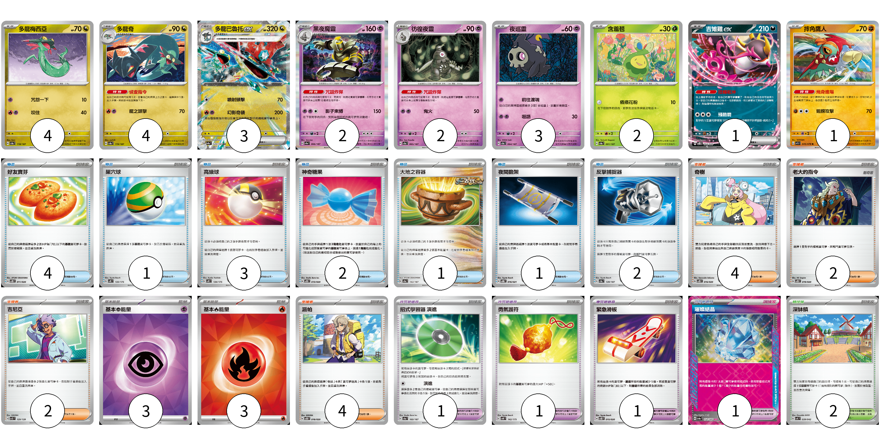 牌組構築方案 以此牌組為基礎新構築牌組 顯示卡面 顯示列表 寶可夢卡(22) 4 4 3 2 2 3 2 1 1 寶可夢道具(4) 1 1 1 1 物品卡(14) 4 1 3 2 1 1 2 支援者卡(12) 4 2 2 4 競技場卡(2) 2 能量卡(6) 3 3 寶可夢卡(22) 卡牌名稱 張數 卡牌名稱 張數 多龍梅西亞 SV8a 118/187 04 多龍奇 SV8a 119/187 04 多龍巴魯托ex SV8a 120/187 03 黑夜魔靈 SV8a 066/187 02 彷徨夜靈 SV8a 065/187 02 夜巡靈 SV8a 064/187 03 含羞苞 SV8a 001/187 02 吉雉雞ex SVOD 004/020 01 摔角鷹人 SV1S 045/078 01 寶可夢道具(4) 卡牌名稱 張數 卡牌名稱 張數 招式學習器 演進 SV8a 160/187 01 勇氣護符 SVM 142/175 01 緊急滑板 SVOD 015/020 01 璀璨結晶 SV8a 152/187 01 物品卡(14) 卡牌名稱 張數 卡牌名稱 張數 好友寶芬 SVOD 011/020 04 巢穴球 SVM 133/175 01 高級球 SVM 134/175 03 神奇糖果 SVOD 013/020 02 大地之容器 SV8a 143/187 01 夜間擔架 SVOM 016/021 01 反擊捕捉器 SV8a 139/187 02 支援者卡(12) 卡牌名稱 張數 卡牌名稱 張數 奇樹 SVOD 016/020 04 老大的指令 SVOD 019/020 02 吉尼亞 SVD 129/139 02 派帕 SVOD 018/020 04 競技場卡(2) 卡牌名稱 張數 卡牌名稱 張數 深缽鎮 SVK 039/042 02 能量卡(6) 卡牌名稱 張數 卡牌名稱 張數 基本【超】能量 SVOD PSY 03 基本【火】能量 SVK FIR 03 以此牌組為基礎新構築牌組 牌組編碼 FOJUGI-uVGoUJ-BJYQHp copy 列印牌組單 牌組編碼已複製 分享至SNS