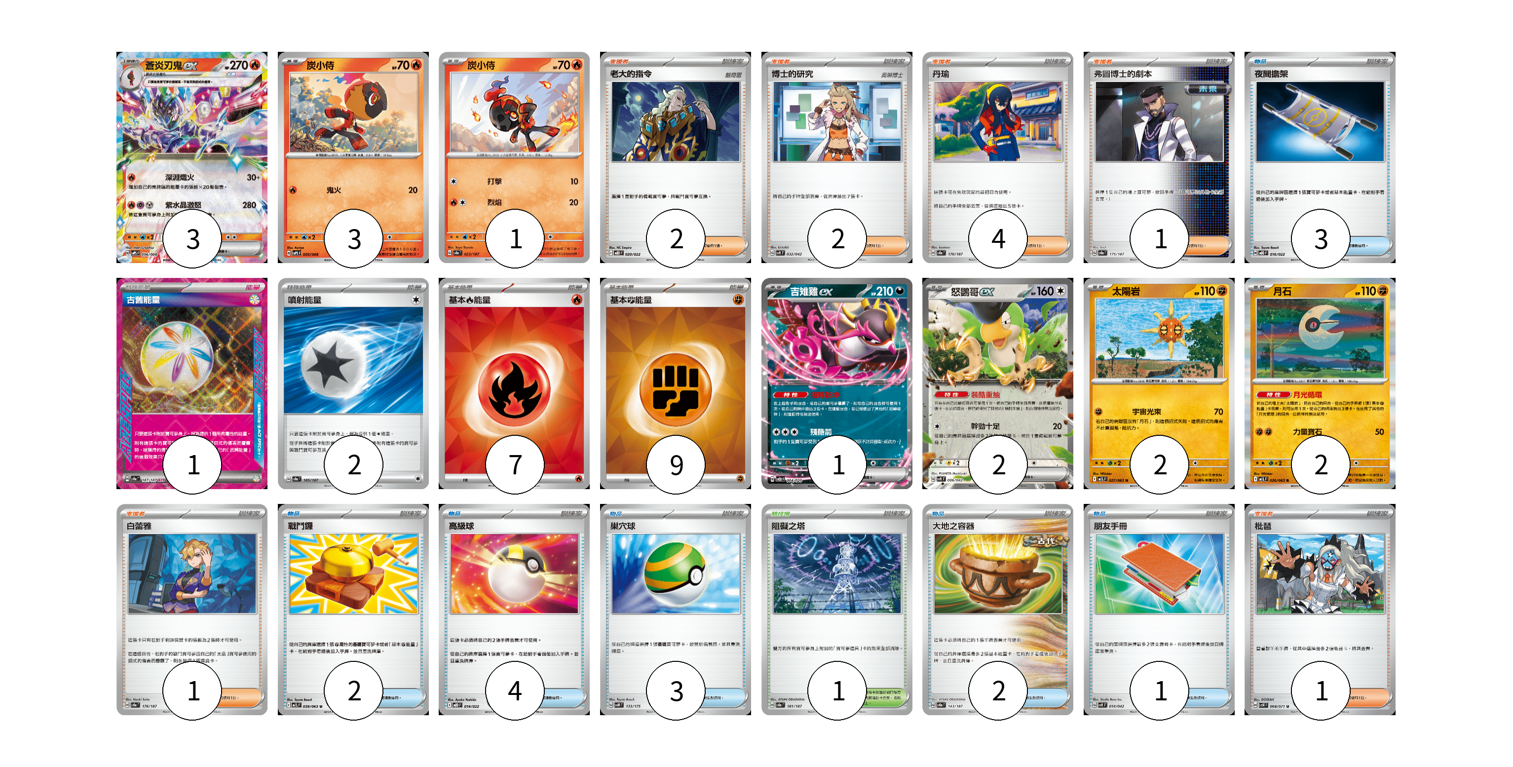 牌組構築方案 以此牌組為基礎新構築牌組 顯示卡面 顯示列表 寶可夢卡(14) 3 3 1 1 2 2 2 物品卡(15) 3 2 4 3 2 1 支援者卡(11) 2 2 4 1 1 1 競技場卡(1) 1 能量卡(19) 1 2 7 9 寶可夢卡(14) 卡牌名稱 張數 卡牌名稱 張數 蒼炎刃鬼ex SVPS 006/008 03 炭小侍 SVPS 005/008 03 炭小侍 SV8a 023/187 01 吉雉雞ex SVOD 004/020 01 怒鸚哥ex SVK 006/042 02 太陽岩 M1L 027/063 02 月石 M1L 026/063 02 物品卡(15) 卡牌名稱 張數 卡牌名稱 張數 夜間擔架 MBD 016/022 03 戰鬥鑼 M1L 059/063 02 高級球 MBD 014/022 04 巢穴球 SVM 133/175 03 大地之容器 SV8a 143/187 02 朋友手冊 SVK 014/042 01 支援者卡(11) 卡牌名稱 張數 卡牌名稱 張數 老大的指令 MBD 020/022 02 博士的研究 SVK 032/042 02 丹瑜 SV8a 170/187 04 弗圖博士的劇本 SV8a 175/187 01 白蕾雅 SV8a 176/187 01 枇琶 SV5K 068/071 01 競技場卡(1) 卡牌名稱 張數 卡牌名稱 張數 阻礙之塔 SV8a 181/187 01 能量卡(19) 卡牌名稱 張數 卡牌名稱 張數 古舊能量 SV8a 187/187 01 噴射能量 SV8a 185/187 02 基本【火】能量 SVQL FIR 07 基本【鬥】能量 SVK FIG 09 以此牌組為基礎新構築牌組 牌組編碼 FQpPUc-kvbfDo-soDART copy 列印牌組單 牌組編碼已複製 分享至SNS