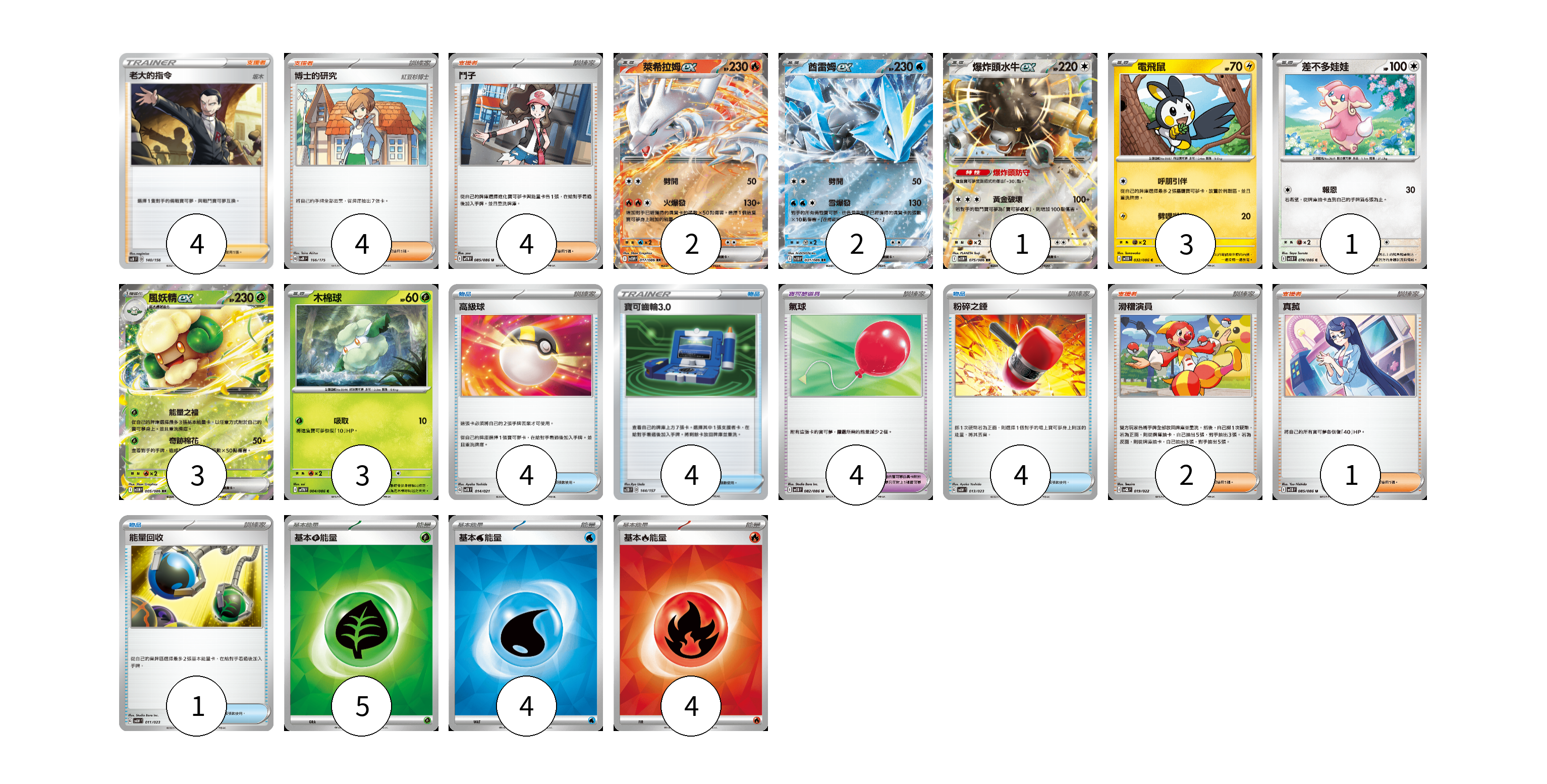 牌組構築方案 以此牌組為基礎新構築牌組 顯示卡面 顯示列表 寶可夢卡(15) 2 2 1 3 1 3 3 寶可夢道具(4) 4 物品卡(13) 4 4 4 1 支援者卡(15) 4 4 4 2 1 能量卡(13) 5 4 4 寶可夢卡(15) 卡牌名稱 張數 卡牌名稱 張數 萊希拉姆ex SV11W 017/086 02 酋雷姆ex SV11B 031/086 02 爆炸頭水牛ex SV11W 075/086 01 電飛鼠 SV11B 032/086 03 差不多娃娃 SV11B 076/086 01 風妖精ex SV11W 005/086 03 木棉球 SV11W 004/086 03 寶可夢道具(4) 卡牌名稱 張數 卡牌名稱 張數 氣球 SV11B 082/086 04 物品卡(13) 卡牌名稱 張數 卡牌名稱 張數 高級球 SVTR 014/021 04 寶可齒輪3.0 SC2D 144/157 04 粉碎之錘 SVAW 013/023 04 能量回收 SVAW 011/023 01 支援者卡(15) 卡牌名稱 張數 卡牌名稱 張數 老大的指令(坂木) SCB 140/156 04 博士的研究 SVM 166/175 04 鬥子 SV11W 085/086 04 滑稽演員 SVQL 019/022 02 真菰 SV11B 085/086 01 能量卡(13) 卡牌名稱 張數 卡牌名稱 張數 基本【草】能量 SVK GRA 05 基本【水】能量 SVK WAT 04 基本【火】能量 SVK FIR 04 以此牌組為基礎新構築牌組 牌組編碼 FREZUB-kfDahF-NyTqiw copy 列印牌組單 牌組編碼已複製 分享至SNS