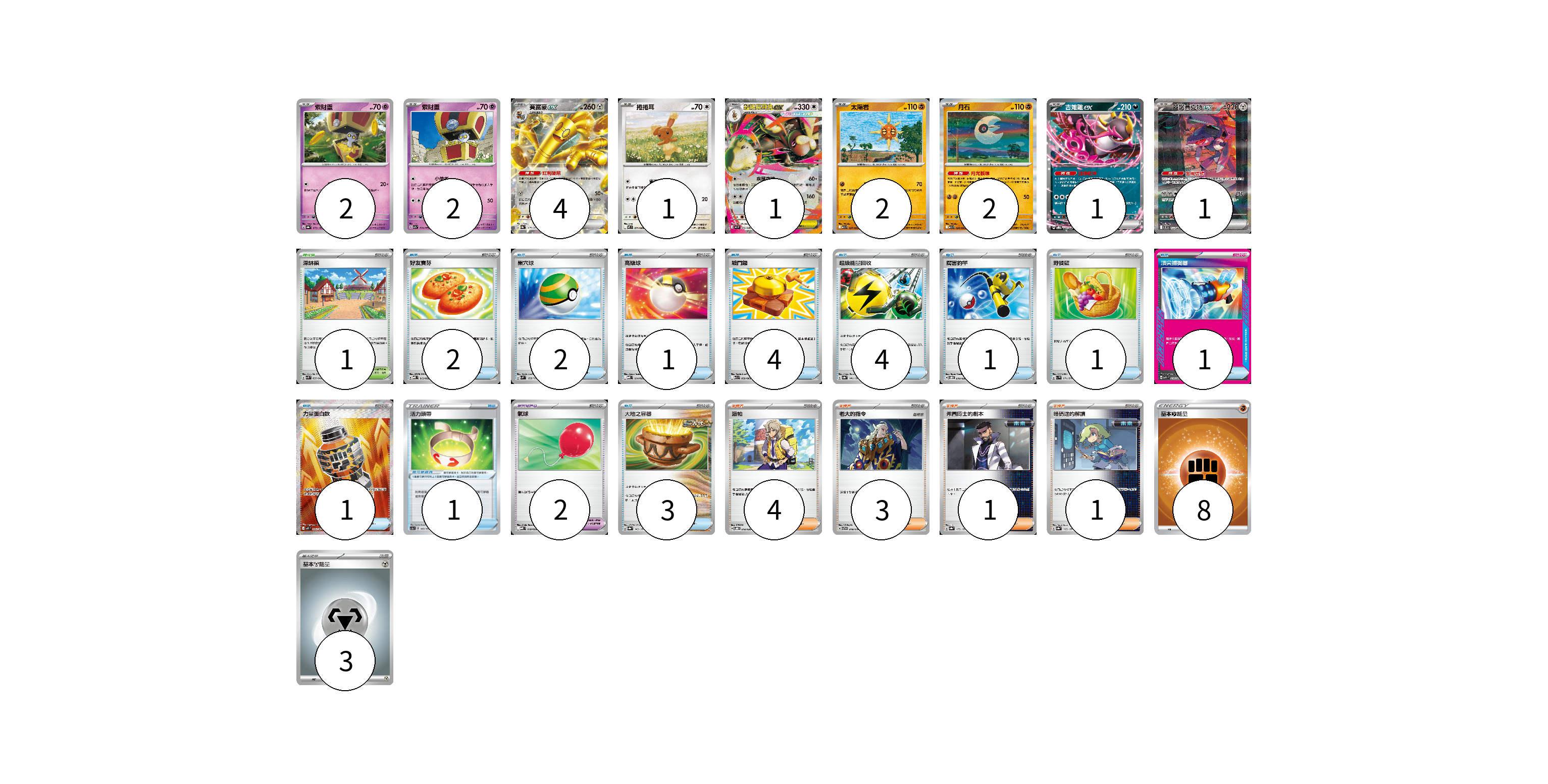 牌組構築方案 以此牌組為基礎新構築牌組 顯示卡面 顯示列表 寶可夢卡(16) 2 2 4 1 1 2 2 1 1 寶可夢道具(3) 1 2 物品卡(20) 2 2 1 4 4 1 1 1 1 3 支援者卡(9) 4 3 1 1 競技場卡(1) 1 能量卡(11) 8 3 寶可夢卡(16) 卡牌名稱 張數 卡牌名稱 張數 索財靈 SV8a 073/187 02 索財靈 SV7a 024/064 02 賽富豪ex SV8a 117/187 04 捲捲耳 M2 071/080 01 超級長耳兔ex M2 072/080 01 太陽岩 M1L 027/063 02 月石 M1L 026/063 02 吉雉雞ex SVOD 004/020 01 蓋諾賽克特ex SV11B 172/086 01 寶可夢道具(3) 卡牌名稱 張數 卡牌名稱 張數 活力頭帶 SC1a 143/154 01 氣球 MBD 018/022 02 物品卡(20) 卡牌名稱 張數 卡牌名稱 張數 好友寶芬 MBD 013/022 02 巢穴球 SVM 133/175 02 高級球 MBD 014/022 01 戰鬥鑼 M1L 059/063 04 超級能量回收 SV8a 141/187 04 厲害釣竿 SVOD 010/020 01 野餐籃 SV1V 071/078 01 頂尖捕捉器 MBG 014/022 01 力量蛋白飲 M1L 081/063 01 大地之容器 SV8a 143/187 03 支援者卡(9) 卡牌名稱 張數 卡牌名稱 張數 派帕 SVOD 018/020 04 老大的指令 SVTG 019/019 03 弗圖博士的劇本 SV8a 175/187 01 暗碼迷的解讀 SV8a 165/187 01 競技場卡(1) 卡牌名稱 張數 卡牌名稱 張數 深缽鎮 SVK 039/042 01 能量卡(11) 卡牌名稱 張數 卡牌名稱 張數 基本鬥能量 SLL FIG 08 基本鋼能量 sv-p MET 03 以此牌組為基礎新構築牌組 牌組編碼 FTYmEv-DATmRR-EBZHSy copy 列印牌組單 牌組編碼已複製 分享至SNS