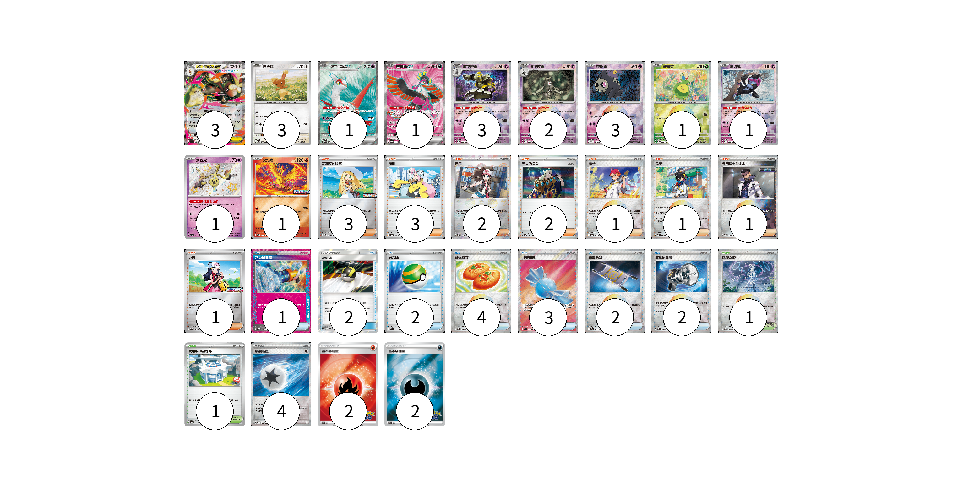 牌組構築方案 以此牌組為基礎新構築牌組 顯示卡面 顯示列表 寶可夢卡(20) 3 3 1 1 3 2 3 1 1 1 1 物品卡(16) 1 2 2 4 3 2 2 支援者卡(14) 3 3 2 2 1 1 1 1 競技場卡(2) 1 1 能量卡(8) 4 2 2 寶可夢卡(20) 卡牌名稱 張數 卡牌名稱 張數 超級長耳兔ex M2 072/080 03 捲捲耳 M2 071/080 03 拉帝亞斯ex SV7a 078/064 01 吉雉雞ex SV6a 081/064 01 黑夜魔靈 SV8a 066/187 03 彷徨夜靈 SV8a 065/187 02 夜巡靈 SV8a 064/187 03 含羞苞 SV8a 001/187 01 願增猿 SV8a 075/187 01 鑰圈兒 SV4a 264/190 01 火焰鳥 M-P 022/M-P 01 物品卡(16) 卡牌名稱 張數 卡牌名稱 張數 頂尖捕捉器 SV5M 062/071 01 高級球 AS5b 178/186 02 巢穴球 SVM 133/175 02 好友寶芬 SV8a 147/187 04 神奇糖果 M1S 082/063 03 夜間擔架 SV8a 151/187 02 反擊捕捉器 SV8a 139/187 02 支援者卡(14) 卡牌名稱 張數 卡牌名稱 張數 莉莉艾的決意 M-P 011/M-P 03 奇樹 SVOD 016/020 03 鬥子 SV11W 085/086 02 老大的指令 SV4a 181/190 02 赤松 SV8a 163/187 01 烏栗 SV8a 169/187 01 弗圖博士的劇本 SV8a 175/187 01 小光 M-P 028/M-P 01 競技場卡(2) 卡牌名稱 張數 卡牌名稱 張數 阻礙之塔 SV8a 181/187 01 寶可夢聯盟總部 SV4a 186/190 01 能量卡(8) 卡牌名稱 張數 卡牌名稱 張數 噴射能量 SV8a 185/187 04 基本火能量 S10b FIR 02 基本惡能量 S10b DAR 02 以此牌組為基礎新構築牌組 牌組編碼 FUCjjv-Yjzkjj-nwjYDf copy 列印牌組單 牌組編碼已複製 分享至SNS