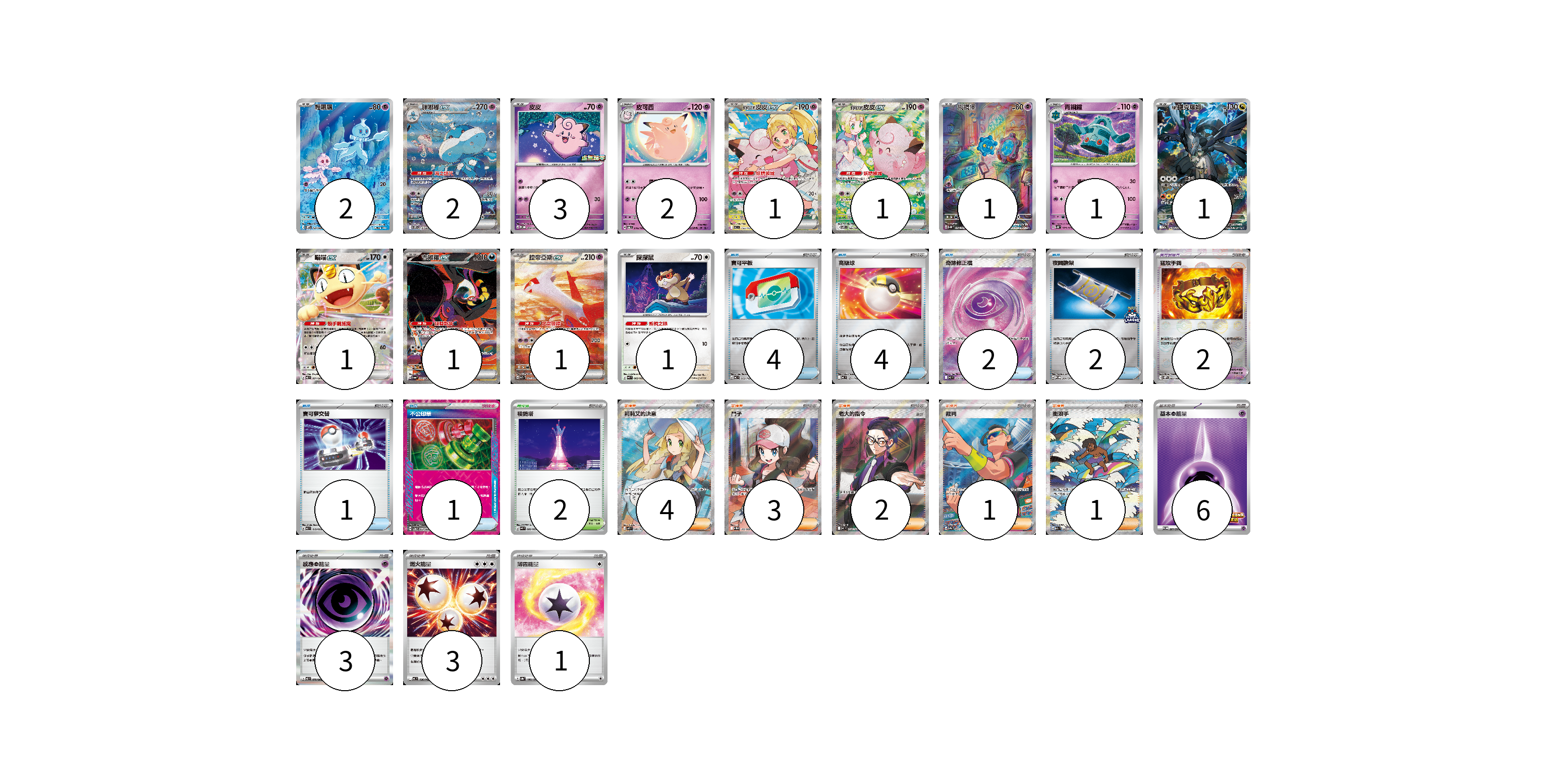 牌組構築方案 以此牌組為基礎新構築牌組 顯示卡面 顯示列表 寶可夢卡(18) 2 2 3 2 1 1 1 1 1 1 1 1 1 寶可夢道具(2) 2 物品卡(14) 4 4 2 2 1 1 支援者卡(11) 4 3 2 1 1 競技場卡(2) 2 能量卡(13) 6 3 3 1 寶可夢卡(18) 卡牌名稱 張數 卡牌名稱 張數 輕飄飄 SV11W 124/086 02 胖嘟嘟ex SV11W 170/086 02 皮皮 M-P 068/M-P 03 皮可西 SV6 046/101 02 莉莉艾的皮皮ex MC 765/742 01 莉莉艾的皮皮ex SV9 126/100 01 銅鏡怪 SV5K 074/071 01 青銅鐘 SV5K 029/071 01 N的捷克羅姆 M2a 210/193 01 喵喵ex M3 061/080 01 吉雉雞ex SV6a 089/064 01 拉帝亞斯ex SV7a 087/064 01 探探鼠 M4 068/083 01 寶可夢道具(2) 卡牌名稱 張數 卡牌名稱 張數 猛攻手鐲 SV11W 082/086 02 物品卡(14) 卡牌名稱 張數 卡牌名稱 張數 寶可平板 MC 662/742 04 高級球 MC 651/742 04 奇跡修正檔 M3 104/080 02 夜間擔架 SV-P 204/SV-P 02 寶可夢交替 MJ 019/022 01 不公印章 SV5a 053/066 01 支援者卡(11) 卡牌名稱 張數 卡牌名稱 張數 莉莉艾的決意 M1L 086/063 04 鬥子 SV11W 166/086 03 老大的指令(烏羽) MC 760/742 02 裁判 SV9a 083/063 01 衝浪手 M2a 249/193 01 競技場卡(2) 卡牌名稱 張數 卡牌名稱 張數 稜鏡塔 M4 080/083 02 能量卡(13) 卡牌名稱 張數 卡牌名稱 張數 基本【超】能量 SV-P 261/SV-P 06 感應【超】能量 M3 079/080 03 燃火能量 MC 736/742 03 薄霧能量 SV8a 186/187 01 以此牌組為基礎新構築牌組 牌組編碼 FUWeCs-ZvDPbu-rjGlTK copy 列印牌組單 牌組編碼已複製 分享至SNS
