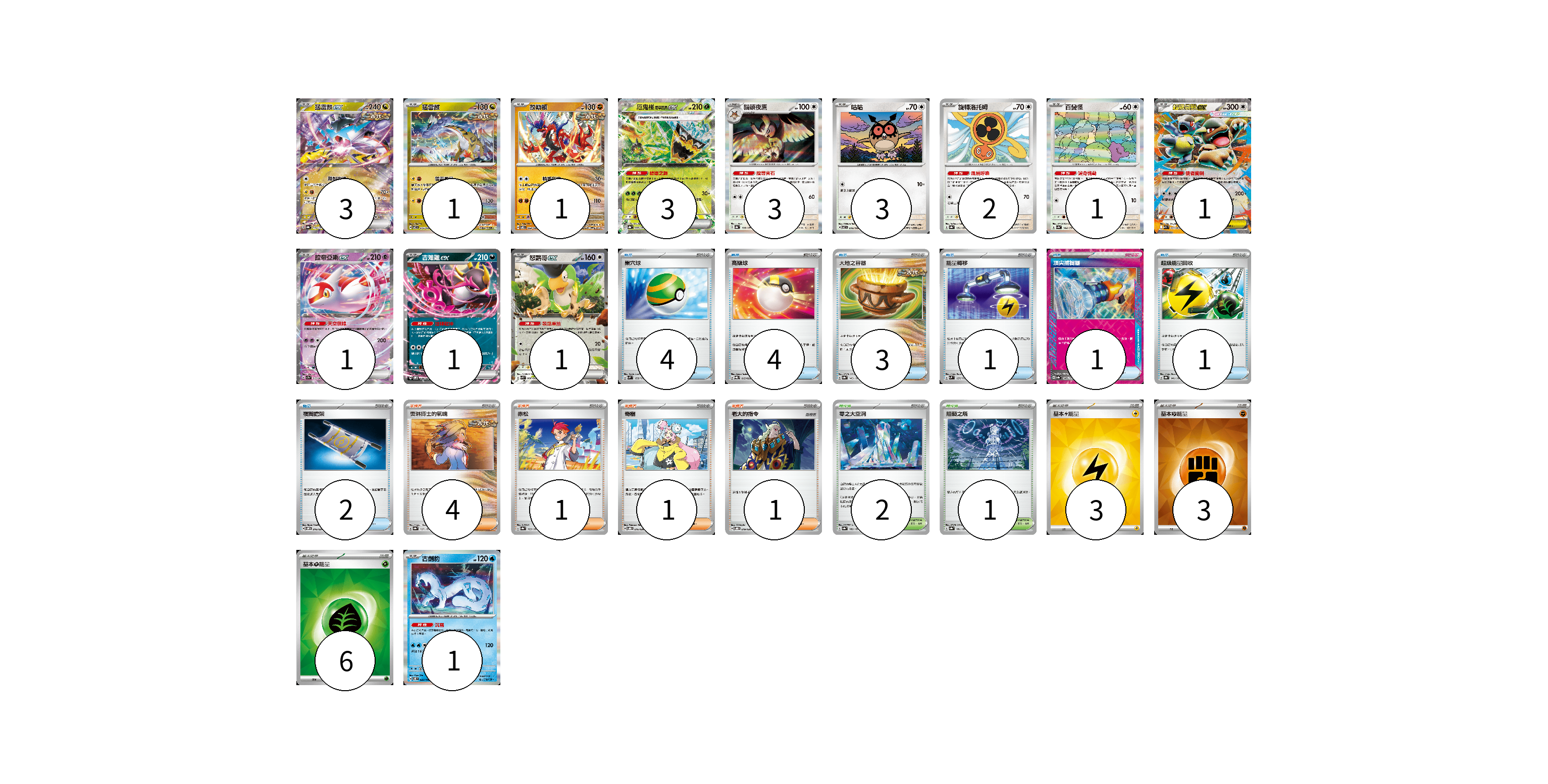 牌組構築方案 以此牌組為基礎新構築牌組 顯示卡面 顯示列表 寶可夢卡(22) 3 1 1 3 3 3 2 1 1 1 1 1 1 物品卡(16) 4 4 3 1 1 1 2 支援者卡(7) 4 1 1 1 競技場卡(3) 2 1 能量卡(12) 3 3 6 寶可夢卡(22) 卡牌名稱 張數 卡牌名稱 張數 猛雷鼓ex SV8a 124/187 03 猛雷鼓 SV7 075/102 01 故勒頓 SV8 069/106 01 厄鬼椪 碧草面具ex SV8a 020/187 03 貓頭夜鷹 SV8a 128/187 03 咕咕 SV7 076/102 03 旋轉洛托姆 SV8a 131/187 02 百變怪 SV4a 144/190 01 超級袋獸ex M1S 051/063 01 拉帝亞斯ex SV7a 019/064 01 吉雉雞ex SVOM 009/021 01 怒鸚哥ex SVK 006/042 01 古劍豹 SV8 032/106 01 物品卡(16) 卡牌名稱 張數 卡牌名稱 張數 巢穴球 SVM 133/175 04 高級球 SVQL 015/022 04 大地之容器 SV8a 143/187 03 能量轉移 SVM 127/175 01 頂尖捕捉器 SV8a 148/187 01 超級能量回收 SV8a 141/187 01 夜間擔架 SVOM 016/021 02 支援者卡(7) 卡牌名稱 張數 卡牌名稱 張數 奧琳博士的氣魄 SV8a 167/187 04 赤松 SV8a 163/187 01 奇樹 SVOD 016/020 01 老大的指令 SVOD 019/020 01 競技場卡(3) 卡牌名稱 張數 卡牌名稱 張數 零之大空洞 SV8a 182/187 02 阻礙之塔 SV8a 181/187 01 能量卡(12) 卡牌名稱 張數 卡牌名稱 張數 基本【雷】能量 SVQP LIG 03 基本【鬥】能量 SVM FIG 03 基本【草】能量 SVM GRA 06 以此牌組為基礎新構築牌組 牌組編碼 FVXQWm-dqwQDo-ewSCeT copy 列印牌組單 牌組編碼已複製 分享至SNS
