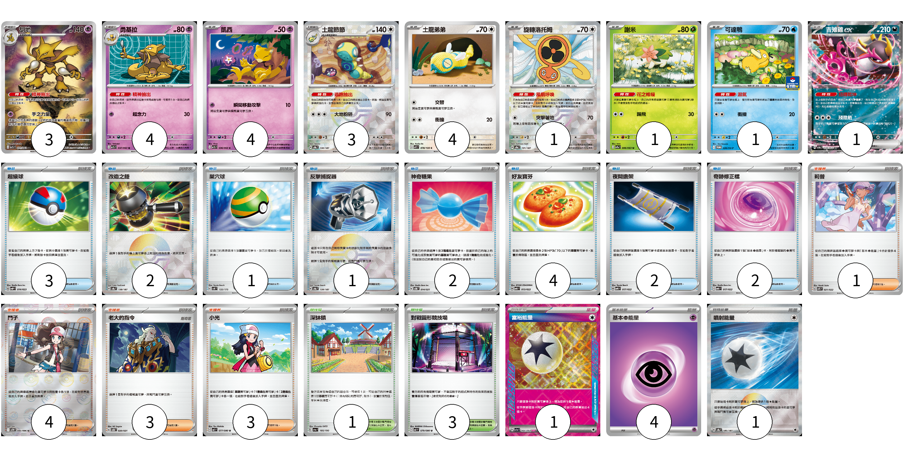 牌組構築方案 以此牌組為基礎新構築牌組 顯示卡面 顯示列表 寶可夢卡(22) 3 4 4 3 4 1 1 1 1 物品卡(17) 3 2 1 1 2 4 2 2 支援者卡(11) 1 4 3 3 競技場卡(4) 1 3 能量卡(6) 1 4 1 寶可夢卡(22) 卡牌名稱 張數 卡牌名稱 張數 胡地 M1S 071/063 03 勇基拉 M1S 037/063 04 凱西 M1S 036/063 04 土龍節節 SV8a 130/187 03 土龍弟弟 SV9 078/100 04 旋轉洛托姆 SV8a 131/187 01 謝米 SV9a 006/063 01 可達鴨 SV-P 220/SV-P 01 吉雉雞ex SV6a 038/064 01 物品卡(17) 卡牌名稱 張數 卡牌名稱 張數 超級球 SVQP 014/023 03 改造之錘 SV8a 138/187 02 巢穴球 SVM 133/175 01 反擊捕捉器 SV8a 139/187 01 神奇糖果 SVOM 014/021 02 好友寶芬 MBD 013/022 04 夜間擔架 MBG 017/022 02 奇跡修正檔 MBD 017/022 02 支援者卡(11) 卡牌名稱 張數 卡牌名稱 張數 莉普 SVTS 021/022 01 鬥子 SV11W 085/086 04 老大的指令 SVOM 020/021 03 小光 M2 077/080 03 競技場卡(4) 卡牌名稱 張數 卡牌名稱 張數 深缽鎮 SV4a 185/190 01 對戰圓形競技場 M2 079/080 03 能量卡(6) 卡牌名稱 張數 卡牌名稱 張數 富裕能量 SV7a 064/064 01 基本超能量 sv-p PSY 04 噴射能量 SV8a 185/187 01 以此牌組為基礎新構築牌組 牌組編碼 FVtkLr-OGsFef-cBUrau copy 列印牌組單 牌組編碼已複製 分享至SNS