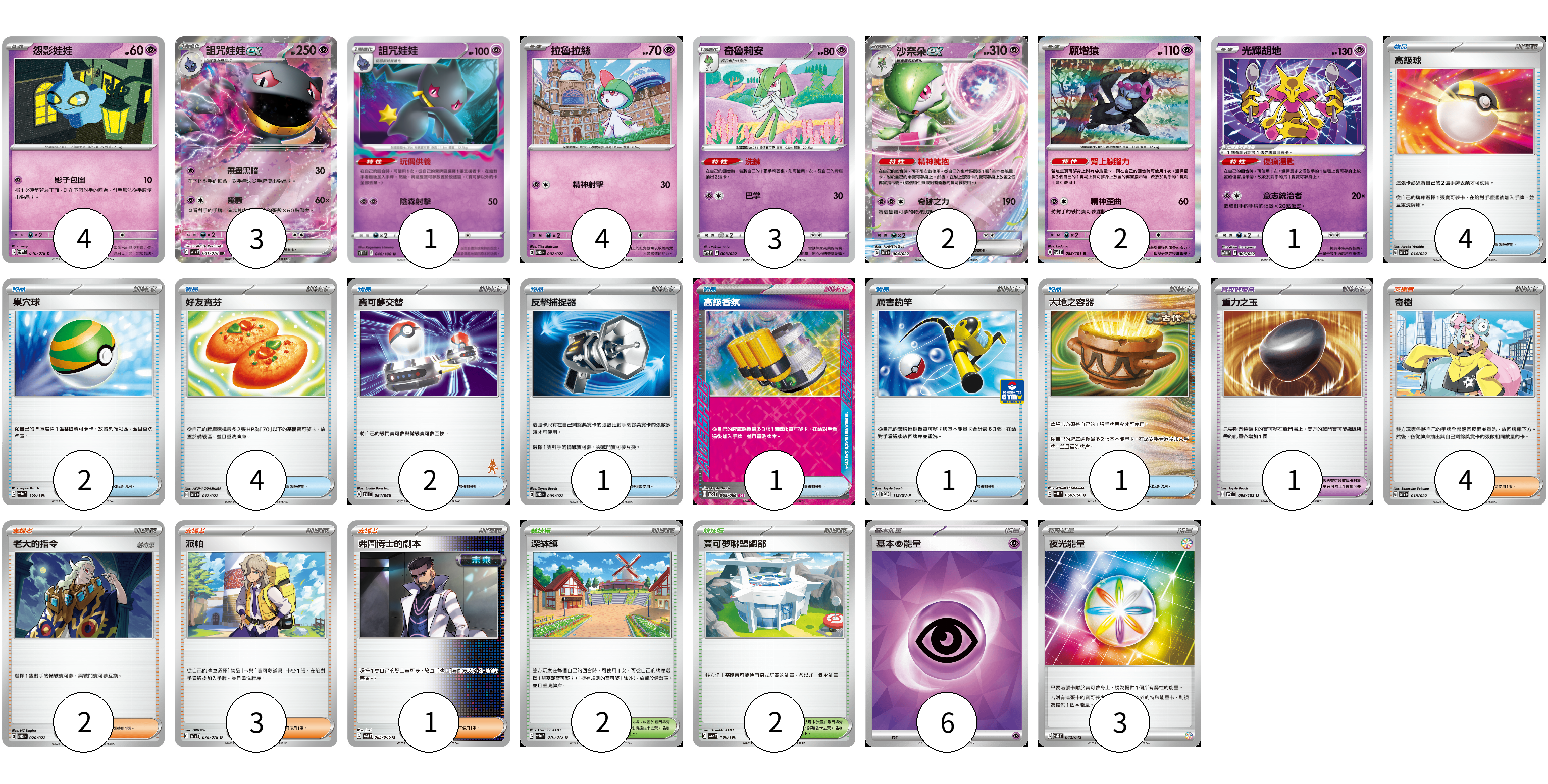 牌組構築方案 以此牌組為基礎新構築牌組 顯示卡面 顯示列表 寶可夢卡(20) 4 3 1 4 3 2 2 1 寶可夢道具(1) 1 物品卡(16) 4 2 4 2 1 1 1 1 支援者卡(10) 4 2 3 1 競技場卡(4) 2 2 能量卡(9) 6 3 寶可夢卡(20) 卡牌名稱 張數 卡牌名稱 張數 怨影娃娃 SV1V 040/078 04 詛咒娃娃ex SV1V 041/078 03 詛咒娃娃 S11 046/100 01 拉魯拉絲 SVTS 002/022 04 奇魯莉安 SVTS 003/022 03 沙奈朵ex SVTS 004/022 02 願增猿 SV6 055/101 02 光輝胡地 SVTM 006/022 01 寶可夢道具(1) 卡牌名稱 張數 卡牌名稱 張數 重力之玉 SV7 095/102 01 物品卡(16) 卡牌名稱 張數 卡牌名稱 張數 高級球 SVTS 014/022 04 巢穴球 SV4a 159/190 02 好友寶芬 SVTS 012/022 04 寶可夢交替 SVI 054/066 02 反擊捕捉器 SVTS 009/022 01 高級香氛 SV5a 055/066 01 厲害釣竿 SV-P 112/SV-P 01 大地之容器 SV4K 060/066 01 支援者卡(10) 卡牌名稱 張數 卡牌名稱 張數 奇樹 SVTS 018/022 04 老大的指令 SVTS 020/022 02 派帕 SV1V 076/078 03 弗圖博士的劇本 SV4M 065/066 01 競技場卡(4) 卡牌名稱 張數 卡牌名稱 張數 深缽鎮 SV1a 070/073 02 寶可夢聯盟總部 SV4a 186/190 02 能量卡(9) 卡牌名稱 張數 卡牌名稱 張數 基本【超】能量 SVK PSY 06 夜光能量 SVK 042/042 03 以此牌組為基礎新構築牌組 牌組編碼 FVvPOz-vFsxKU-QkckhV copy 列印牌組單 牌組編碼已複製 分享至SNS