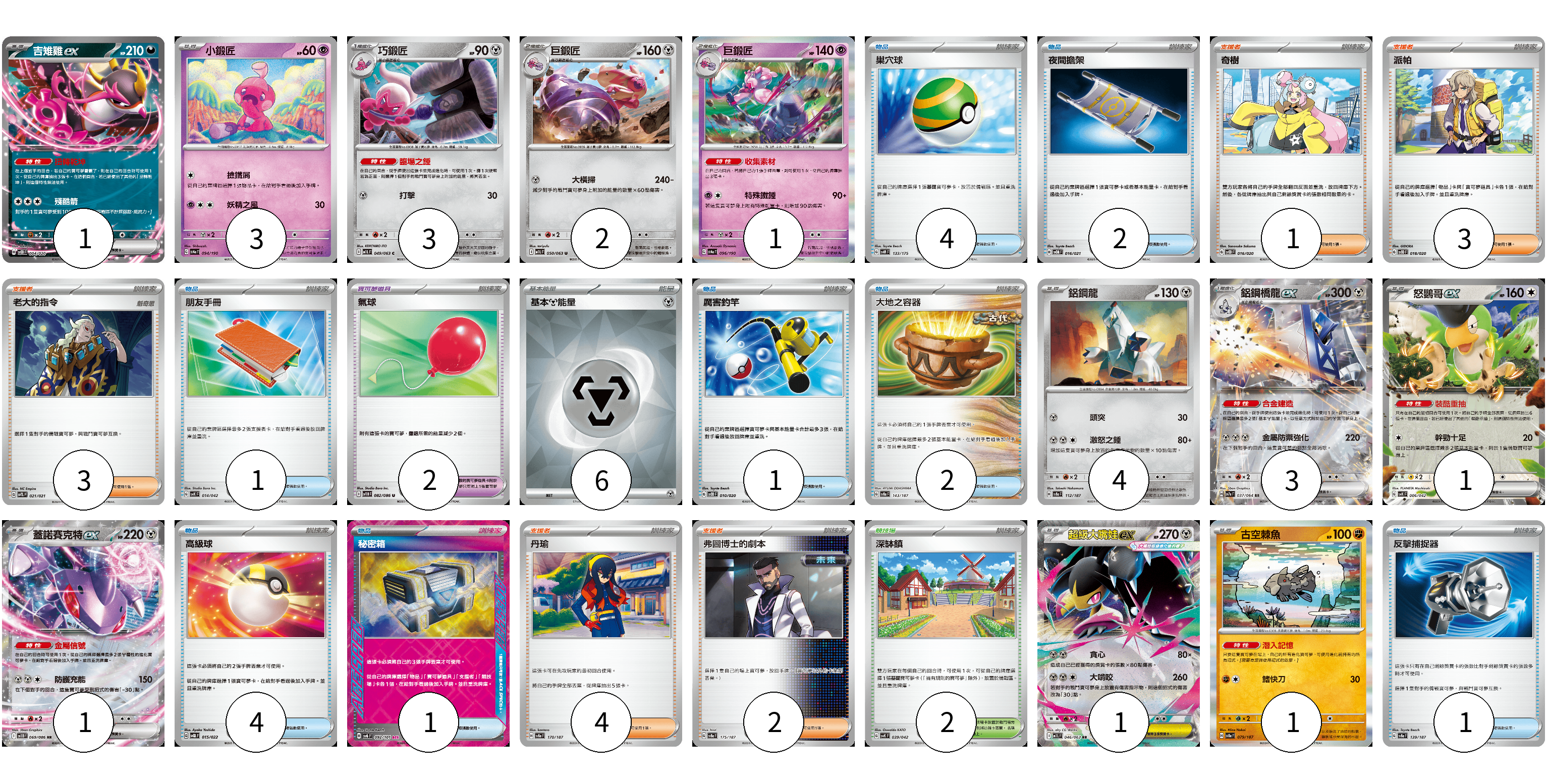 牌組構築方案 以此牌組為基礎新構築牌組 顯示卡面 顯示列表 寶可夢卡(21) 1 3 3 2 1 4 3 1 1 1 1 寶可夢道具(2) 2 物品卡(16) 4 2 1 1 2 4 1 1 支援者卡(13) 1 3 3 4 2 競技場卡(2) 2 能量卡(6) 6 寶可夢卡(21) 卡牌名稱 張數 卡牌名稱 張數 吉雉雞ex SVOD 004/020 01 小鍛匠 SV4a 094/190 03 巧鍛匠 M1L 049/063 03 巨鍛匠 M1L 050/063 02 巨鍛匠 SV4a 096/190 01 鋁鋼龍 SV8a 112/187 04 鋁鋼橋龍ex SV7a 037/064 03 怒鸚哥ex SVK 006/042 01 蓋諾賽克特ex SV11B 069/086 01 超級大嘴娃ex M1L 046/063 01 古空棘魚 SV8a 079/187 01 寶可夢道具(2) 卡牌名稱 張數 卡牌名稱 張數 氣球 SV11B 082/086 02 物品卡(16) 卡牌名稱 張數 卡牌名稱 張數 巢穴球 SVM 133/175 04 夜間擔架 SVOM 016/021 02 朋友手冊 SVK 014/042 01 厲害釣竿 SVOD 010/020 01 大地之容器 SV8a 143/187 02 高級球 SVQL 015/022 04 秘密箱 SV6 092/101 01 反擊捕捉器 SV8a 139/187 01 支援者卡(13) 卡牌名稱 張數 卡牌名稱 張數 奇樹 SVOD 016/020 01 派帕 SVOD 018/020 03 老大的指令 SVTL 021/021 03 丹瑜 SV8a 170/187 04 弗圖博士的劇本 SV8a 175/187 02 競技場卡(2) 卡牌名稱 張數 卡牌名稱 張數 深缽鎮 SVK 039/042 02 能量卡(6) 卡牌名稱 張數 卡牌名稱 張數 基本【鋼】能量 SVOD MET 06 以此牌組為基礎新構築牌組 牌組編碼 FXGYeV-UNWfOx-IKpfMh copy 列印牌組單 牌組編碼已複製 分享至SNS