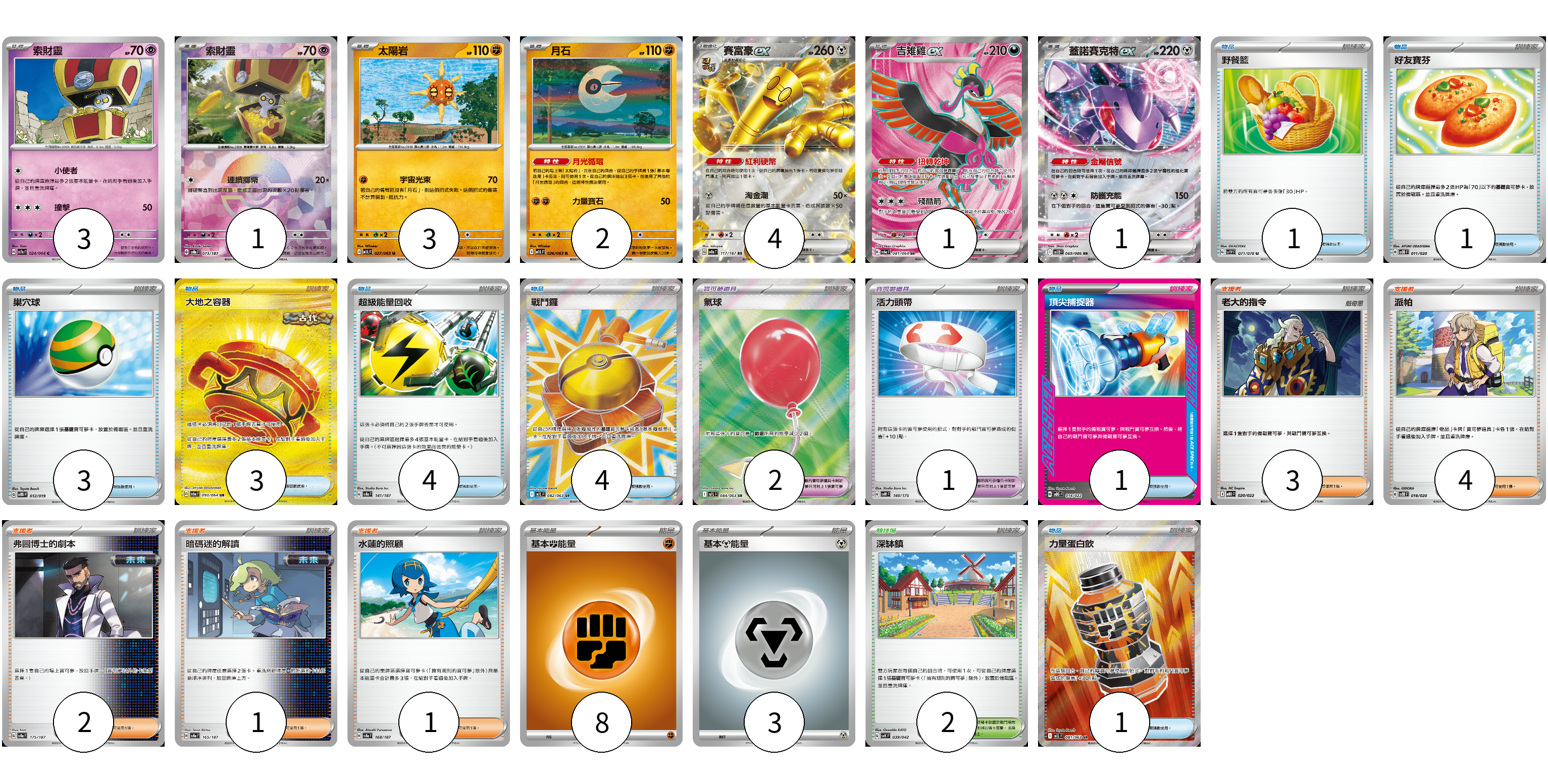 牌組構築方案 以此牌組為基礎新構築牌組 顯示卡面 顯示列表 寶可夢卡(15) 3 1 3 2 4 1 1 寶可夢道具(3) 2 1 物品卡(18) 1 1 3 3 4 4 1 1 支援者卡(11) 3 4 2 1 1 競技場卡(2) 2 能量卡(11) 8 3 寶可夢卡(15) 卡牌名稱 張數 卡牌名稱 張數 索財靈 SV7a 024/064 03 索財靈 SV8a 073/187 01 太陽岩 M1L 027/063 03 月石 M1L 026/063 02 賽富豪ex SV8a 117/187 04 吉雉雞ex SV6a 081/064 01 蓋諾賽克特ex SV11B 069/086 01 寶可夢道具(3) 卡牌名稱 張數 卡牌名稱 張數 氣球 M1L 084/063 02 活力頭帶 SVM 140/175 01 物品卡(18) 卡牌名稱 張數 卡牌名稱 張數 野餐籃 SV1V 071/078 01 好友寶芬 SVOD 011/020 01 巢穴球 SVTG 012/019 03 大地之容器 SV6a 093/064 03 超級能量回收 SV8a 141/187 04 戰鬥鑼 M1L 082/063 04 頂尖捕捉器 MBG 014/022 01 力量蛋白飲 M1L 081/063 01 支援者卡(11) 卡牌名稱 張數 卡牌名稱 張數 老大的指令 MBD 020/022 03 派帕 SVOD 018/020 04 弗圖博士的劇本 SV8a 175/187 02 暗碼迷的解讀 SV8a 165/187 01 水蓮的照顧 SV8a 168/187 01 競技場卡(2) 卡牌名稱 張數 卡牌名稱 張數 深缽鎮 SVK 039/042 02 能量卡(11) 卡牌名稱 張數 卡牌名稱 張數 基本鬥能量 sv-p FIG 08 基本鋼能量 sv-p MET 03 以此牌組為基礎新構築牌組 牌組編碼 FZbBat-WSkIEa-xpPqfM copy 列印牌組單 牌組編碼已複製 分享至SNS