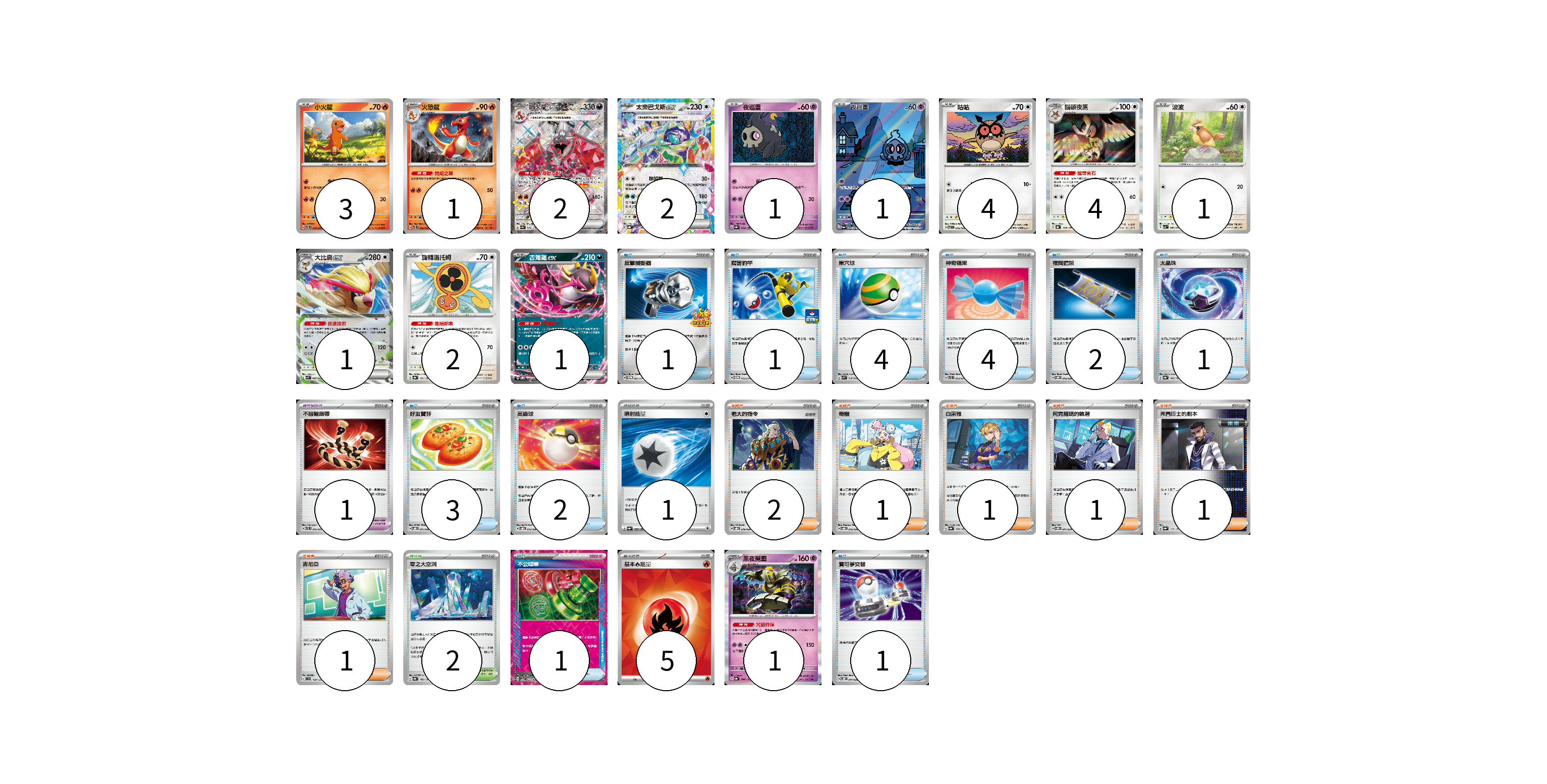 牌組構築方案 以此牌組為基礎新構築牌組 顯示卡面 顯示列表 寶可夢卡(24) 3 1 2 2 1 1 4 4 1 1 2 1 1 寶可夢道具(1) 1 物品卡(20) 1 1 4 4 2 1 3 2 1 1 支援者卡(7) 2 1 1 1 1 1 競技場卡(2) 2 能量卡(6) 1 5 寶可夢卡(24) 卡牌名稱 張數 卡牌名稱 張數 小火龍 SVTL 001/021 03 火恐龍 SVTL 002/021 01 噴火龍ex SV4a 331/190 02 太樂巴戈斯ex SV8a 136/187 02 夜巡靈 SV8a 064/187 01 夜巡靈 SV6a 068/064 01 咕咕 SV7 076/102 04 貓頭夜鷹 SV8a 128/187 04 波波 SV3 087/108 01 大比鳥ex SVK 005/042 01 旋轉洛托姆 SV8a 131/187 02 吉雉雞ex SVOD 004/020 01 黑夜魔靈 SV8a 066/187 01 寶可夢道具(1) 卡牌名稱 張數 卡牌名稱 張數 不服輸頭帶 SVTL 016/021 01 物品卡(20) 卡牌名稱 張數 卡牌名稱 張數 反擊捕捉器 SV-P 083/SV-P 01 厲害釣竿 SV-P 112/SV-P 01 巢穴球 SVK 016/042 04 神奇糖果 SVTL 013/021 04 夜間擔架 SVOM 016/021 02 太晶珠 SV8a 145/187 01 好友寶芬 SVOD 011/020 03 高級球 SVOD 012/020 02 不公印章 SV5a 053/066 01 寶可夢交替 SVOD 014/020 01 支援者卡(7) 卡牌名稱 張數 卡牌名稱 張數 老大的指令 SVOD 019/020 02 奇樹 SVOD 016/020 01 白蕾雅 SV8a 176/187 01 阿克羅瑪的執著 SVOM 017/021 01 弗圖博士的劇本 SV8a 175/187 01 吉尼亞 SVD 129/139 01 競技場卡(2) 卡牌名稱 張數 卡牌名稱 張數 零之大空洞 SV8a 182/187 02 能量卡(6) 卡牌名稱 張數 卡牌名稱 張數 噴射能量 SV8a 185/187 01 基本【火】能量 SVK FIR 05 以此牌組為基礎新構築牌組 牌組編碼 FbFjwL-sMSpIN-cWIZaa copy 列印牌組單 牌組編碼已複製 分享至SNS