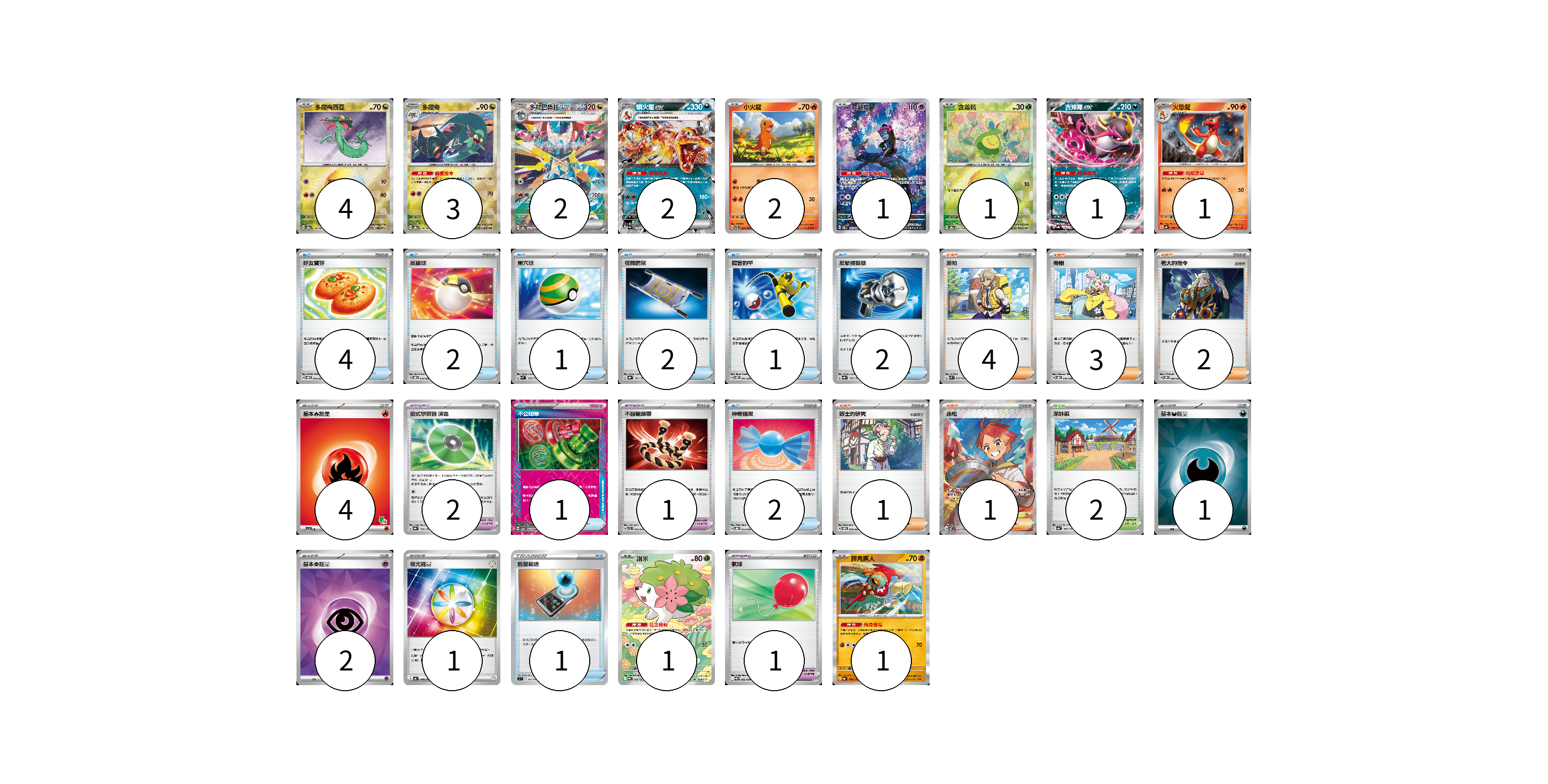 牌組構築方案 以此牌組為基礎新構築牌組 顯示卡面 顯示列表 寶可夢卡(19) 4 3 2 2 2 1 1 1 1 1 1 寶可夢道具(4) 2 1 1 物品卡(16) 4 2 1 2 1 2 1 2 1 支援者卡(11) 4 3 2 1 1 競技場卡(2) 2 能量卡(8) 4 1 2 1 寶可夢卡(19) 卡牌名稱 張數 卡牌名稱 張數 多龍梅西亞 SV8a 118/187 04 多龍奇 SV8a 119/187 03 多龍巴魯托ex SV8a 221/187 02 噴火龍ex SV4a 115/190 02 小火龍 SVTL 001/021 02 願增猿 SV6 107/101 01 含羞苞 SV8a 001/187 01 吉雉雞ex SV8a 104/187 01 火恐龍 SV4a 026/190 01 謝米 SV9a 066/063 01 摔角鷹人 SV8a 084/187 01 寶可夢道具(4) 卡牌名稱 張數 卡牌名稱 張數 招式學習器 演進 SV8a 160/187 02 不服輸頭帶 SVTL 016/021 01 氣球 SV11B 082/086 01 物品卡(16) 卡牌名稱 張數 卡牌名稱 張數 好友寶芬 SVOM 012/021 04 高級球 SVOD 012/020 02 巢穴球 SVM 133/175 01 夜間擔架 SV8a 151/187 02 厲害釣竿 SVOM 011/021 01 反擊捕捉器 SV8a 139/187 02 不公印章 SV5a 053/066 01 神奇糖果 SVOD 013/020 02 能量輸送 SI 367/414 01 支援者卡(11) 卡牌名稱 張數 卡牌名稱 張數 派帕 SVK 035/042 04 奇樹 SVOD 016/020 03 老大的指令 SVOM 020/021 02 博士的研究 SVOM 019/021 01 赤松 SV7 123/102 01 競技場卡(2) 卡牌名稱 張數 卡牌名稱 張數 深缽鎮 SV4a 185/190 02 能量卡(8) 卡牌名稱 張數 卡牌名稱 張數 基本【火】能量 SVI FIR 04 基本【惡】能量 SVK DAR 01 基本【超】能量 SVOD PSY 02 夜光能量 SV4a 190/190 01 以此牌組為基礎新構築牌組 牌組編碼 FbYjQE-sLwzCD-OyIYrC copy 列印牌組單 牌組編碼已複製 分享至SNS