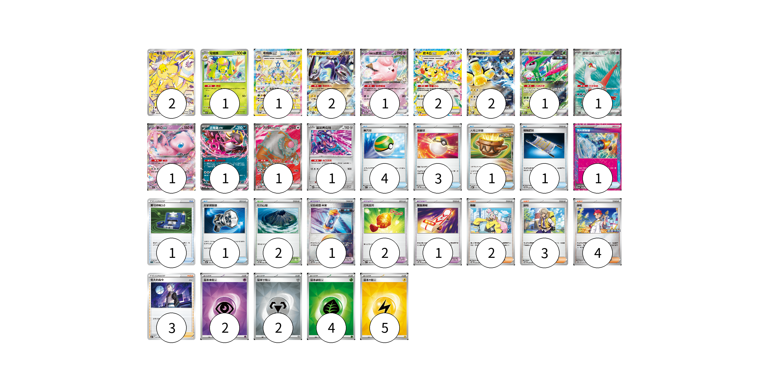牌組構築方案 以此牌組為基礎新構築牌組 顯示卡面 顯示列表 寶可夢卡(17) 2 1 1 2 1 2 2 1 1 1 1 1 1 寶可夢道具(4) 1 2 1 物品卡(12) 4 3 1 1 1 1 1 支援者卡(12) 2 3 4 3 競技場卡(2) 2 能量卡(13) 2 2 4 5 寶可夢卡(17) 卡牌名稱 張數 卡牌名稱 張數 電電蟲 SV7 108/102 02 電蜘蛛 SV6a 002/064 01 電蜘蛛ex SV7 128/102 01 密勒頓ex SV4a 071/190 02 莉莉艾的皮皮ex SV9 033/100 01 皮卡丘ex SV8 033/106 02 鐵臂膀ex SV8a 054/187 02 鐵斑葉ex SV5M 016/071 01 拉帝亞斯ex SV7a 078/064 01 夢幻ex SV4a 076/190 01 吉雉雞ex SVOD 004/020 01 月月熊 赫月 ex SV5a 084/066 01 蓋諾賽克特 SV6a 040/064 01 寶可夢道具(4) 卡牌名稱 張數 卡牌名稱 張數 驅勁能量 未來 SV8a 158/187 01 勇氣護符 SVM 142/175 02 緊急滑板 SVOD 015/020 01 物品卡(12) 卡牌名稱 張數 卡牌名稱 張數 巢穴球 SVM 133/175 04 高級球 SVOD 012/020 03 大地之容器 SV8a 143/187 01 夜間擔架 SVOM 016/021 01 頂尖捕捉器 SV8a 148/187 01 寶可齒輪3.0 SLD 014/020 01 反擊捕捉器 SV8a 139/187 01 支援者卡(12) 卡牌名稱 張數 卡牌名稱 張數 奇樹 SVOD 016/020 02 派帕 SVOD 018/020 03 赤松 SV-P 150/SV-P 04 老大的指令(赤日) SVB 024/028 03 競技場卡(2) 卡牌名稱 張數 卡牌名稱 張數 引力山岳 SV8 106/106 02 能量卡(13) 卡牌名稱 張數 卡牌名稱 張數 基本【超】能量 SVOD PSY 02 基本【鋼】能量 SVOD MET 02 基本【草】能量 SVM GRA 04 基本【雷】能量 SVM LIG 05 以此牌組為基礎新構築牌組 牌組編碼 FbnHAD-oBHhFm-iNzUVJ copy 列印牌組單 牌組編碼已複製 分享至SNS