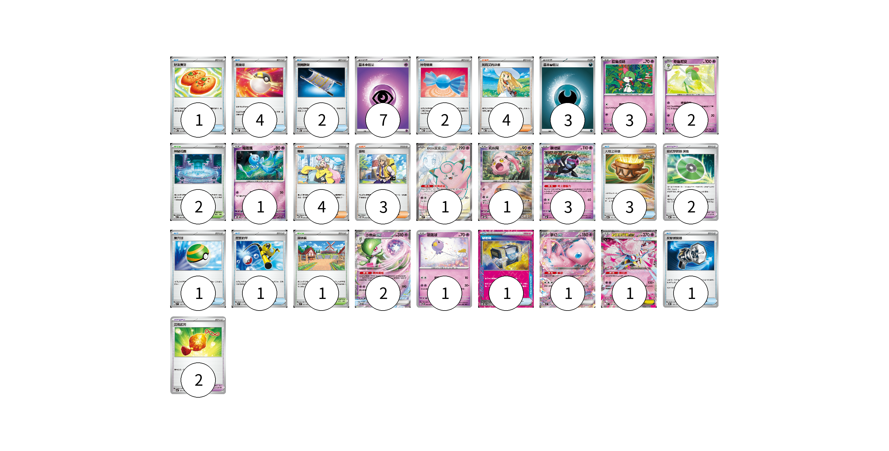 牌組構築方案 以此牌組為基礎新構築牌組 顯示卡面 顯示列表 寶可夢卡(16) 3 2 1 1 1 3 2 1 1 1 寶可夢道具(4) 2 2 物品卡(16) 1 4 2 2 3 1 1 1 1 支援者卡(11) 4 4 3 競技場卡(3) 2 1 能量卡(10) 7 3 寶可夢卡(16) 卡牌名稱 張數 卡牌名稱 張數 拉魯拉絲 M1S 040/063 03 奇魯莉安 M1S 041/063 02 輕飄飄 SV11W 041/086 01 莉莉艾的皮皮ex SV9 115/100 01 吼叫尾 SV8a 071/187 01 願增猿 SV8a 075/187 03 沙奈朵ex SVTS 004/022 02 飄飄球 SVTS 005/022 01 夢幻ex SV4a 076/190 01 超級蒂安希ex MBD 006/022 01 寶可夢道具(4) 卡牌名稱 張數 卡牌名稱 張數 招式學習器 演進 SV8a 160/187 02 勇氣護符 SV4a 169/190 02 物品卡(16) 卡牌名稱 張數 卡牌名稱 張數 好友寶芬 MBD 013/022 01 高級球 MBD 014/022 04 夜間擔架 MBD 016/022 02 神奇糖果 MBG 013/022 02 大地之容器 SV8a 143/187 03 巢穴球 SVM 133/175 01 厲害釣竿 SVK 011/042 01 秘密箱 SV6 092/101 01 反擊捕捉器 SV8a 139/187 01 支援者卡(11) 卡牌名稱 張數 卡牌名稱 張數 莉莉艾的決意 MBG 022/022 04 奇樹 SVOD 016/020 04 派帕 SVOD 018/020 03 競技場卡(3) 卡牌名稱 張數 卡牌名稱 張數 神秘花園 M1S 063/063 02 深缽鎮 SVK 039/042 01 能量卡(10) 卡牌名稱 張數 卡牌名稱 張數 基本【超】能量 MBD PSY 07 基本【惡】能量 MBG DAR 03 以此牌組為基礎新構築牌組 牌組編碼 FbprGy-dhKStX-VLwKGN copy 列印牌組單 牌組編碼已複製 分享至SNS