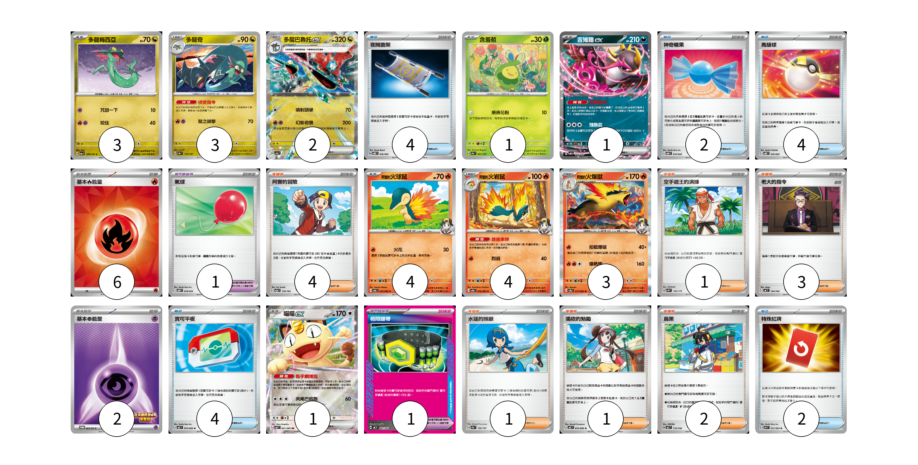 牌組構築方案 以此牌組為基礎新構築牌組 顯示卡面 顯示列表 寶可夢卡(22) 3 3 2 1 1 4 4 3 1 寶可夢道具(2) 1 1 物品卡(16) 4 2 4 4 2 支援者卡(12) 4 1 3 1 1 2 能量卡(8) 6 2 寶可夢卡(22) 卡牌名稱 張數 卡牌名稱 張數 多龍梅西亞 SV6 079/101 03 多龍奇 SV8a 119/187 03 多龍巴魯托ex SV8a 120/187 02 含羞苞 SV8a 001/187 01 吉雉雞ex SVOD 004/020 01 <阿響的>火球鼠 SV9a 015/063 04 <阿響的>火岩鼠 SV9a 016/063 04 <阿響的>火爆獸 SV9a 017/063 03 喵喵ex M3 061/080 01 寶可夢道具(2) 卡牌名稱 張數 卡牌名稱 張數 氣球 MBD 018/022 01 極限腰帶 MC 691/742 01 物品卡(16) 卡牌名稱 張數 卡牌名稱 張數 夜間擔架 MBD 016/022 04 神奇糖果 MBG 013/022 02 高級球 MBD 014/022 04 寶可平板 M3 070/080 04 特殊紅牌 M4 072/083 02 支援者卡(12) 卡牌名稱 張數 卡牌名稱 張數 阿響的冒險 M2a 174/193 04 空手道王的演練 SVM 149/175 01 老大的指令 MC 724/742 03 水蓮的照顧 SV8a 168/187 01 鳴依的勉勵 M3 075/080 01 烏栗 MC 713/742 02 能量卡(8) 卡牌名稱 張數 卡牌名稱 張數 基本【火】能量 SVQL FIR 06 基本【超】能量 SV-P 261/SV-P 02 以此牌組為基礎新構築牌組 牌組編碼 FewdtO-NCdEVX-hFloPl copy 列印牌組單 牌組編碼已複製 分享至SNS