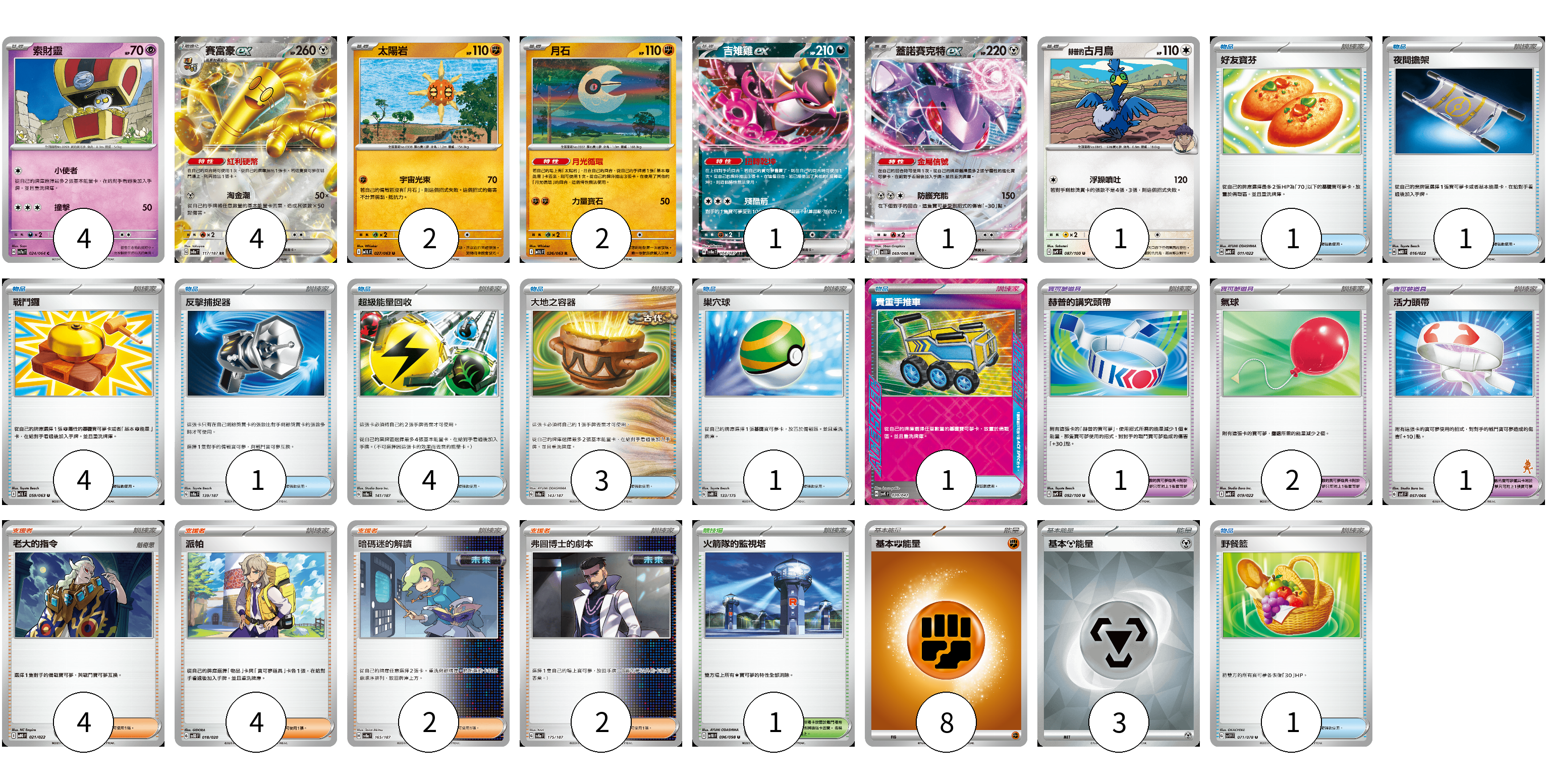牌組構築方案 以此牌組為基礎新構築牌組 顯示卡面 顯示列表 寶可夢卡(15) 4 4 2 2 1 1 1 寶可夢道具(4) 1 2 1 物品卡(17) 1 1 4 1 4 3 1 1 1 支援者卡(12) 4 4 2 2 競技場卡(1) 1 能量卡(11) 8 3 寶可夢卡(15) 卡牌名稱 張數 卡牌名稱 張數 索財靈 SV7a 024/064 04 賽富豪ex SV8a 117/187 04 太陽岩 M1L 027/063 02 月石 M1L 026/063 02 吉雉雞ex SV8a 104/187 01 蓋諾賽克特ex SV11B 069/086 01 赫普的古月鳥 SV9 087/100 01 寶可夢道具(4) 卡牌名稱 張數 卡牌名稱 張數 赫普的講究頭帶 SV9 092/100 01 氣球 MBG 019/022 02 活力頭帶 SVI 057/066 01 物品卡(17) 卡牌名稱 張數 卡牌名稱 張數 好友寶芬 MBG 011/022 01 夜間擔架 MBD 016/022 01 戰鬥鑼 M1L 059/063 04 反擊捕捉器 SV8a 139/187 01 超級能量回收 SV8a 141/187 04 大地之容器 SV8a 143/187 03 巢穴球 SVM 133/175 01 貴重手推車 SVK 020/042 01 野餐籃 SV1V 071/078 01 支援者卡(12) 卡牌名稱 張數 卡牌名稱 張數 老大的指令 MBG 021/022 04 派帕 SVOD 018/020 04 暗碼迷的解讀 SV8a 165/187 02 弗圖博士的劇本 SV8a 175/187 02 競技場卡(1) 卡牌名稱 張數 卡牌名稱 張數 火箭隊的監視塔 SV10 096/098 01 能量卡(11) 卡牌名稱 張數 卡牌名稱 張數 基本【鬥】能量 M-P FIG 08 基本【鋼】能量 SVOD MET 03 以此牌組為基礎新構築牌組 牌組編碼 FfIOgZ-vqNCmz-YCVLuR copy 列印牌組單 牌組編碼已複製 分享至SNS