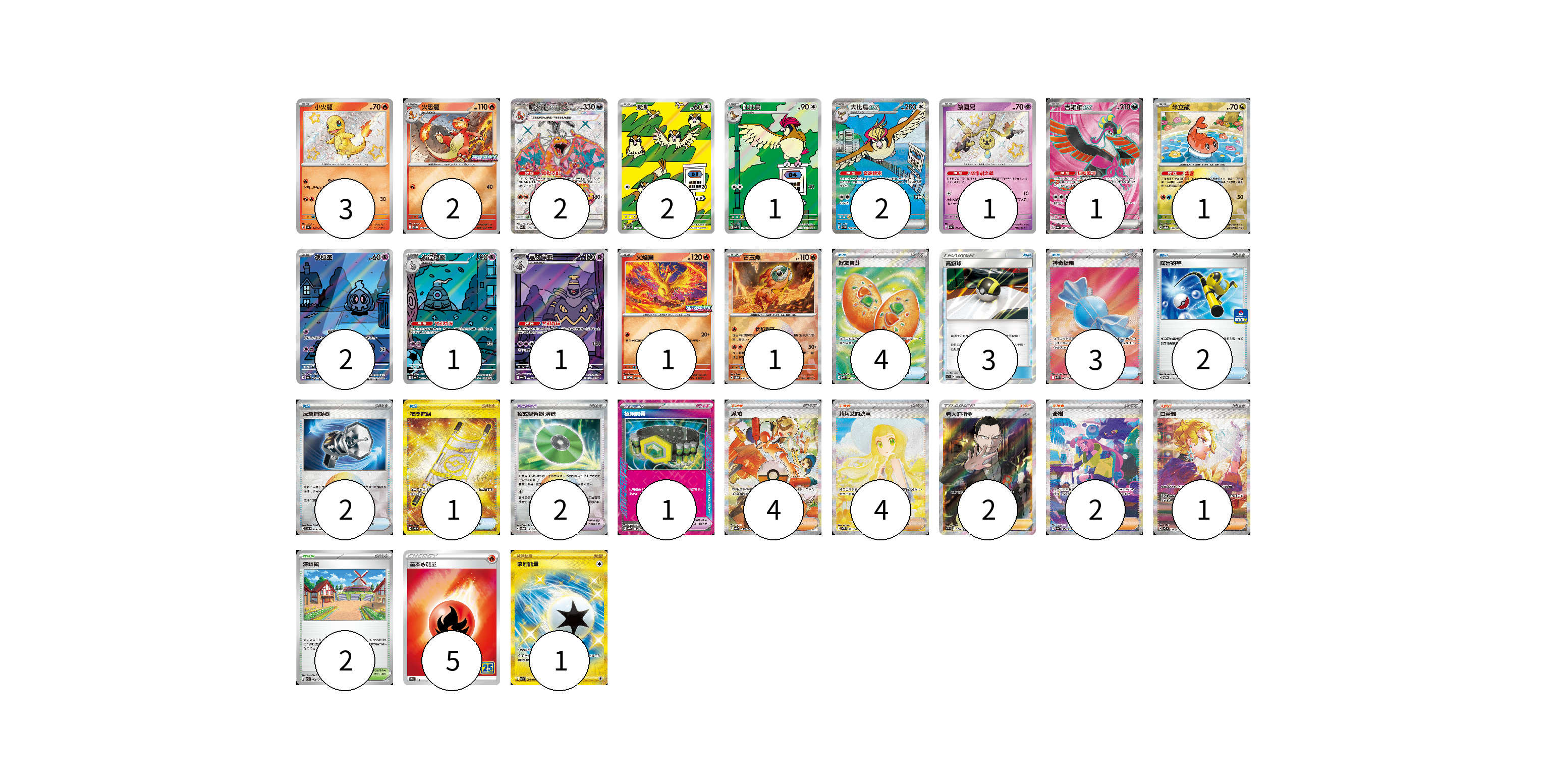 牌組構築方案 以此牌組為基礎新構築牌組 顯示卡面 顯示列表 寶可夢卡(21) 3 2 2 2 1 2 1 1 1 2 1 1 1 1 寶可夢道具(3) 2 1 物品卡(15) 4 3 3 2 2 1 支援者卡(13) 4 4 2 2 1 競技場卡(2) 2 能量卡(6) 5 1 寶可夢卡(21) 卡牌名稱 張數 卡牌名稱 張數 小火龍 SV4a 210/190 03 火恐龍 M-P 021/M-P 02 噴火龍ex SV3 125/108 02 波波 SV3 118/108 02 比比鳥 SV3 119/108 01 大比鳥ex SV3 136/108 02 鑰圈兒 SV4a 264/190 01 吉雉雞ex SV6a 081/064 01 米立龍 SV8a 121/187 01 夜巡靈 SV6a 068/064 02 彷徨夜靈 SV6a 069/064 01 黑夜魔靈 SV6a 070/064 01 火焰鳥 M-P 022/M-P 01 古玉魚 SV8a 025/187 01 寶可夢道具(3) 卡牌名稱 張數 卡牌名稱 張數 招式學習器 演進 SV8a 160/187 02 極限腰帶 SV8a 159/187 01 物品卡(15) 卡牌名稱 張數 卡牌名稱 張數 好友寶芬 M1S 081/063 04 高級球 AS5b 178/186 03 神奇糖果 M1S 082/063 03 厲害釣竿 SV-P 112/SV-P 02 反擊捕捉器 SV8a 139/187 02 夜間擔架 SV8 137/106 01 支援者卡(13) 卡牌名稱 張數 卡牌名稱 張數 派帕 SV4a 353/190 04 莉莉艾的決意 M1L 091/063 04 老大的指令(坂木) SC1b 170/153 02 奇樹 SV4a 350/190 02 白蕾雅 SV7 132/102 01 競技場卡(2) 卡牌名稱 張數 卡牌名稱 張數 深缽鎮 SVK 039/042 02 能量卡(6) 卡牌名稱 張數 卡牌名稱 張數 基本火能量 S8a FIR 05 噴射能量 SV7a 094/064 01 以此牌組為基礎新構築牌組 牌組編碼 FfhhyE-AJBndt-URnUpo copy 列印牌組單 牌組編碼已複製 分享至SNS
