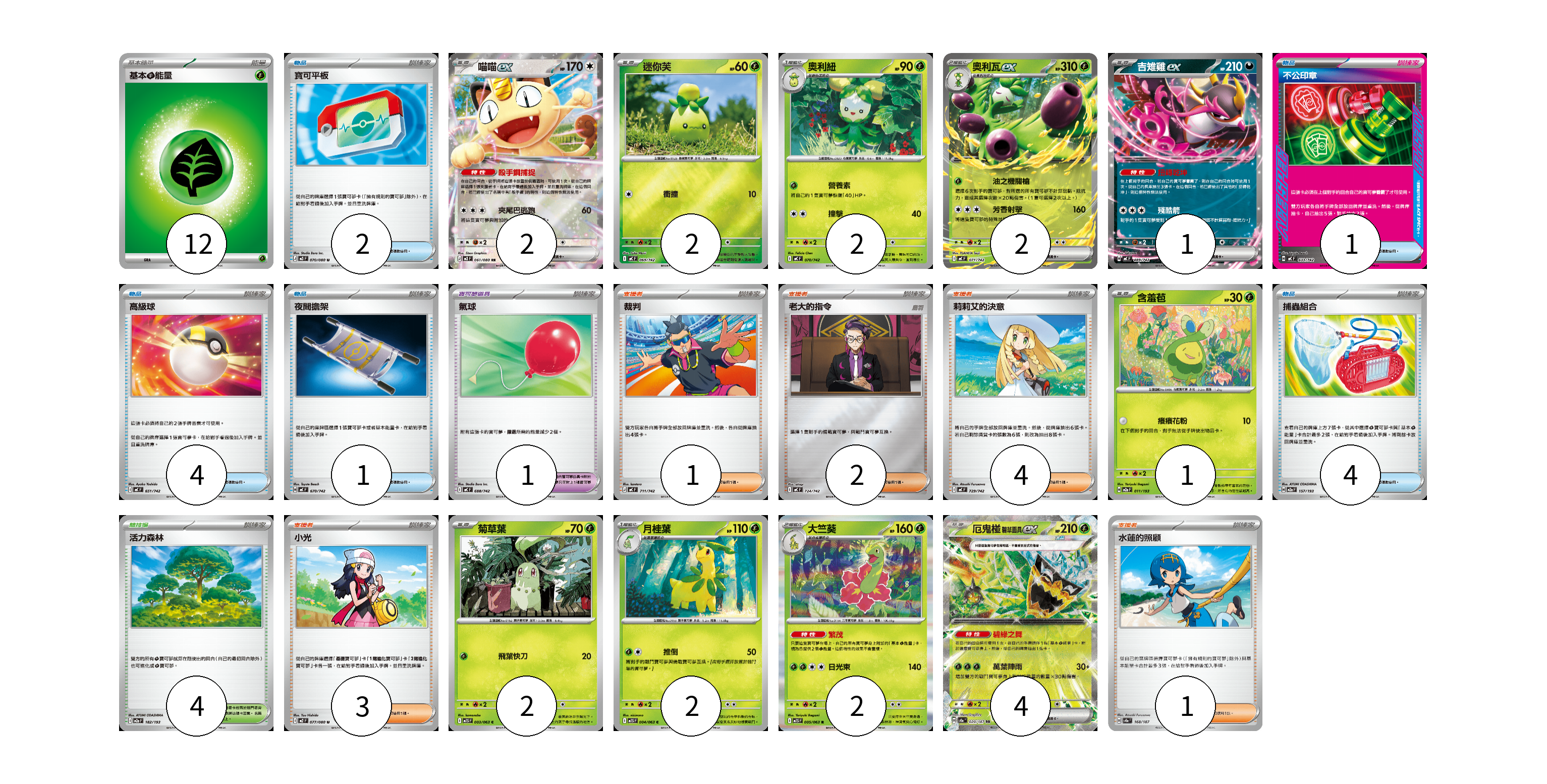 牌組構築方案 以此牌組為基礎新構築牌組 顯示卡面 顯示列表 寶可夢卡(20) 2 2 2 2 1 1 2 2 2 4 寶可夢道具(1) 1 物品卡(12) 2 1 4 1 4 支援者卡(11) 1 2 4 3 1 競技場卡(4) 4 能量卡(12) 12 寶可夢卡(20) 卡牌名稱 張數 卡牌名稱 張數 喵喵ex M3 061/080 02 迷你芙 MC 069/742 02 奧利紐 MC 070/742 02 奧利瓦ex MC 071/742 02 吉雉雞ex MC 489/742 01 含羞苞 M2a 011/193 01 菊草葉 M1S 003/063 02 月桂葉 M1S 004/063 02 大竺葵 M1S 005/063 02 厄鬼椪 碧草面具ex SV8a 020/187 04 寶可夢道具(1) 卡牌名稱 張數 卡牌名稱 張數 氣球 MC 688/742 01 物品卡(12) 卡牌名稱 張數 卡牌名稱 張數 寶可平板 M3 070/080 02 不公印章 MC 633/742 01 高級球 MC 651/742 04 夜間擔架 MC 670/742 01 捕蟲組合 M2a 157/193 04 支援者卡(11) 卡牌名稱 張數 卡牌名稱 張數 裁判 MC 711/742 01 老大的指令 MC 724/742 02 莉莉艾的決意 MC 729/742 04 小光 M2 077/080 03 水蓮的照顧 SV8a 168/187 01 競技場卡(4) 卡牌名稱 張數 卡牌名稱 張數 活力森林 M2a 182/193 04 能量卡(12) 卡牌名稱 張數 卡牌名稱 張數 基本【草】能量 MJ GRA 12 以此牌組為基礎新構築牌組 牌組編碼 FgAaIe-emTRXD-pUkUpw copy 列印牌組單 牌組編碼已複製 分享至SNS