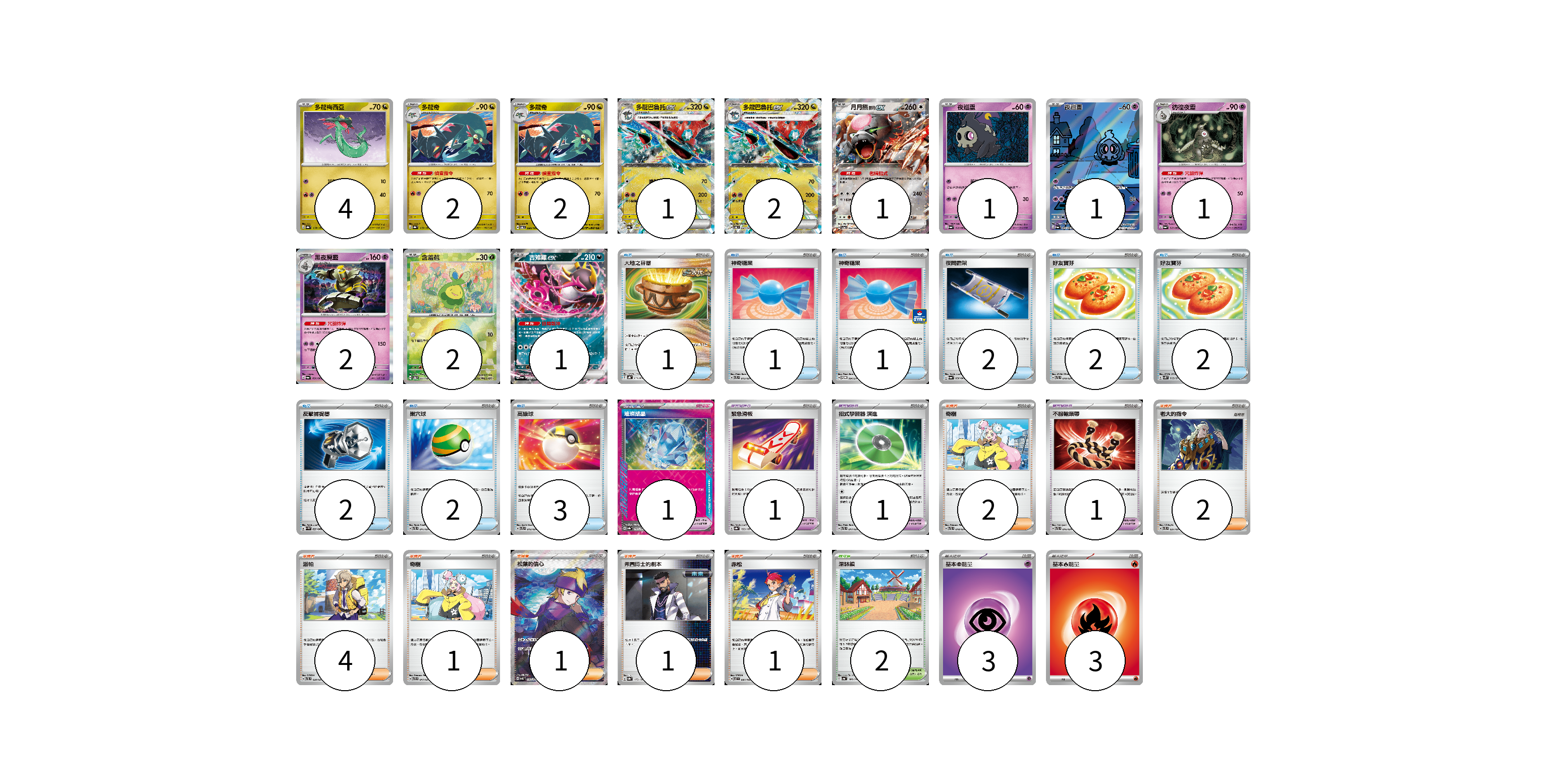 牌組構築方案 以此牌組為基礎新構築牌組 顯示卡面 顯示列表 寶可夢卡(20) 4 2 2 1 2 1 1 1 1 2 2 1 寶可夢道具(6) 1 1 1 2 1 物品卡(16) 1 1 1 2 2 2 2 2 3 支援者卡(10) 2 4 1 1 1 1 競技場卡(2) 2 能量卡(6) 3 3 寶可夢卡(20) 卡牌名稱 張數 卡牌名稱 張數 多龍梅西亞 SV8a 118/187 04 多龍奇 SV8a 119/187 02 多龍奇 SV6 080/101 02 多龍巴魯托ex SV8a 120/187 01 多龍巴魯托ex SV6 081/101 02 月月熊 赫月 ex SV5a 052/066 01 夜巡靈 SV6a 018/064 01 夜巡靈 SV6a 068/064 01 彷徨夜靈 SV6a 019/064 01 黑夜魔靈 SV6a 020/064 02 含羞苞 SV8a 001/187 02 吉雉雞ex SV6a 038/064 01 寶可夢道具(6) 卡牌名稱 張數 卡牌名稱 張數 璀璨結晶 SV8a 152/187 01 緊急滑板 SV8a 153/187 01 招式學習器 演進 SVTL 017/021 01 奇樹 SVTL 018/021 02 不服輸頭帶 SVTL 016/021 01 物品卡(16) 卡牌名稱 張數 卡牌名稱 張數 大地之容器 SVHK 011/022 01 神奇糖果 SVTL 013/021 01 神奇糖果 SV-P 104/SV-P 01 夜間擔架 SV6a 056/064 02 好友寶芬 SVTL 010/021 02 好友寶芬 SV5K 063/071 02 反擊捕捉器 SV4M 059/066 02 巢穴球 SVTL 011/021 02 高級球 SVTL 012/021 03 支援者卡(10) 卡牌名稱 張數 卡牌名稱 張數 老大的指令 SVTL 021/021 02 派帕 SVTL 020/021 04 奇樹 SVTR 017/021 01 松葉的信心 SV5K 092/071 01 弗圖博士的劇本 SV8a 175/187 01 赤松 SV7 097/102 01 競技場卡(2) 卡牌名稱 張數 卡牌名稱 張數 深缽鎮 SV4a 185/190 02 能量卡(6) 卡牌名稱 張數 卡牌名稱 張數 基本超能量 sv-p PSY 03 基本火能量 sv-p FIR 03 以此牌組為基礎新構築牌組 牌組編碼 FgMlRh-oZGrgB-QzQVvx copy 列印牌組單 牌組編碼已複製 分享至SNS