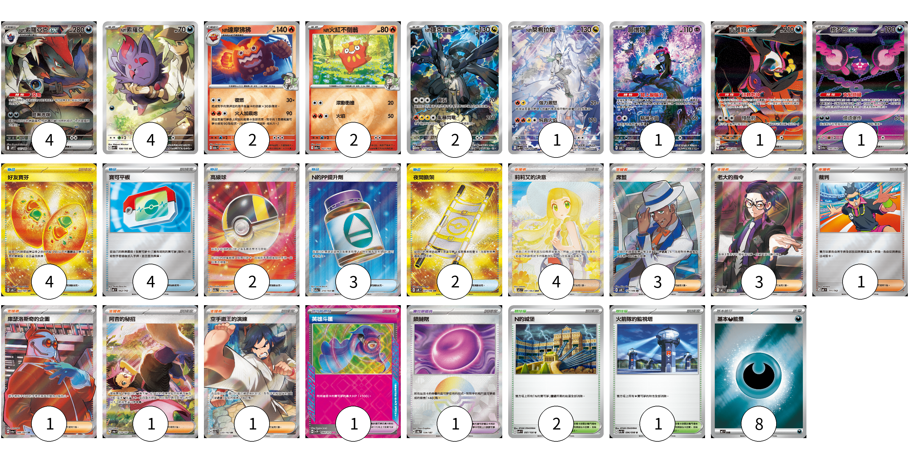 牌組構築方案 以此牌組為基礎新構築牌組 顯示卡面 顯示列表 寶可夢卡(18) 4 4 2 2 2 1 1 1 1 寶可夢道具(2) 1 1 物品卡(15) 4 4 2 3 2 支援者卡(14) 4 3 3 1 1 1 1 競技場卡(3) 2 1 能量卡(8) 8 寶可夢卡(18) 卡牌名稱 張數 卡牌名稱 張數 N的索羅亞克ex SV9 127/100 04 N的索羅亞 SV9 108/100 04 N的達摩狒狒 M2a 028/193 02 N的火紅不倒翁 M2a 027/193 02 N的捷克羅姆 M2a 210/193 02 N的萊希拉姆 SV9 109/100 01 願增猿 SV6 107/101 01 吉雉雞ex SV6a 089/064 01 桃歹郎ex SV6a 090/064 01 寶可夢道具(2) 卡牌名稱 張數 卡牌名稱 張數 英雄斗篷 SV5M 064/071 01 鎖鏈糬 SV8a 154/187 01 物品卡(15) 卡牌名稱 張數 卡牌名稱 張數 好友寶芬 SV6 133/101 04 寶可平板 MC 662/742 04 高級球 M2a 216/193 02 N的PP提升劑 M2a 214/193 03 夜間擔架 SV8 137/106 02 支援者卡(14) 卡牌名稱 張數 卡牌名稱 張數 莉莉艾的決意 M1L 091/063 04 席藍 SV8 127/106 03 老大的指令(烏羽) MC 760/742 03 裁判 MC 711/742 01 庫瑟洛斯奇的企圖 SV6a 086/064 01 阿杏的秘招 SV8a 228/187 01 空手道王的演練 M2a 220/193 01 競技場卡(3) 卡牌名稱 張數 卡牌名稱 張數 N的城堡 SV9 097/100 02 火箭隊的監視塔 SV10 096/098 01 能量卡(8) 卡牌名稱 張數 卡牌名稱 張數 基本【惡】能量 MC DAR 08 以此牌組為基礎新構築牌組 牌組編碼 FlcHkU-jQoYYM-DNdlPZ copy 列印牌組單 牌組編碼已複製 分享至SNS