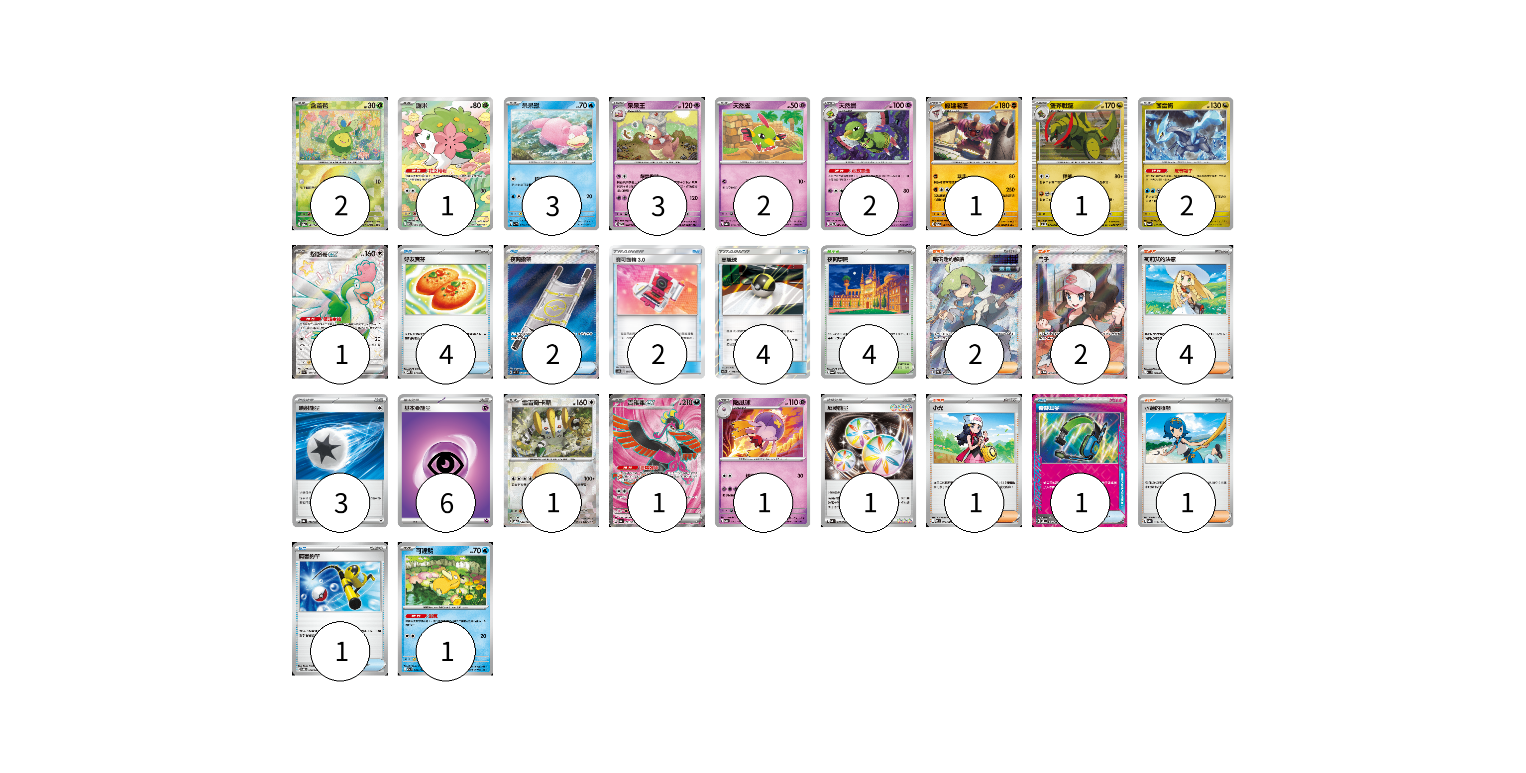 牌組構築方案 以此牌組為基礎新構築牌組 顯示卡面 顯示列表 寶可夢卡(22) 2 1 3 3 2 2 1 1 2 1 1 1 1 1 物品卡(14) 4 2 2 4 1 1 支援者卡(10) 2 2 4 1 1 競技場卡(4) 4 能量卡(10) 3 6 1 寶可夢卡(22) 卡牌名稱 張數 卡牌名稱 張數 含羞苞 SV8a 001/187 02 謝米 SV9a 066/063 01 呆呆獸 SV1V 019/078 03 呆呆王 SV7 039/102 03 天然雀 SV8a 060/187 02 天然鳥 SVEM 005/020 02 修建老匠 SV6 061/101 01 雙斧戰龍 SV11B 072/086 01 酋雷姆 SV6a 047/064 02 怒鸚哥ex SV4a 337/190 01 雷吉奇卡斯 SV8a 132/187 01 吉雉雞ex SV6a 081/064 01 隨風球 SV4a 084/190 01 可達鴨 M2a 032/193 01 物品卡(14) 卡牌名稱 張數 卡牌名稱 張數 好友寶芬 MBD 013/022 04 夜間擔架 M1L 083/063 02 寶可齒輪3.0 AS6b 190/194 02 高級球 AS5b 178/186 04 奇跡耳麥 SV8 097/106 01 厲害釣竿 SVOD 010/020 01 支援者卡(10) 卡牌名稱 張數 卡牌名稱 張數 暗碼迷的解讀 SV5M 090/071 02 鬥子 SV11W 166/086 02 莉莉艾的決意 M1L 062/063 04 小光 M2 077/080 01 水蓮的照顧 SV8a 168/187 01 競技場卡(4) 卡牌名稱 張數 卡牌名稱 張數 夜間學院 SV6a 064/064 04 能量卡(10) 卡牌名稱 張數 卡牌名稱 張數 噴射能量 SV8a 185/187 03 基本超能量 sv-p PSY 06 反轉能量 SVK 041/042 01 以此牌組為基礎新構築牌組 牌組編碼 FlhhPK-GNazfF-sBLXjk copy 列印牌組單 牌組編碼已複製 分享至SNS