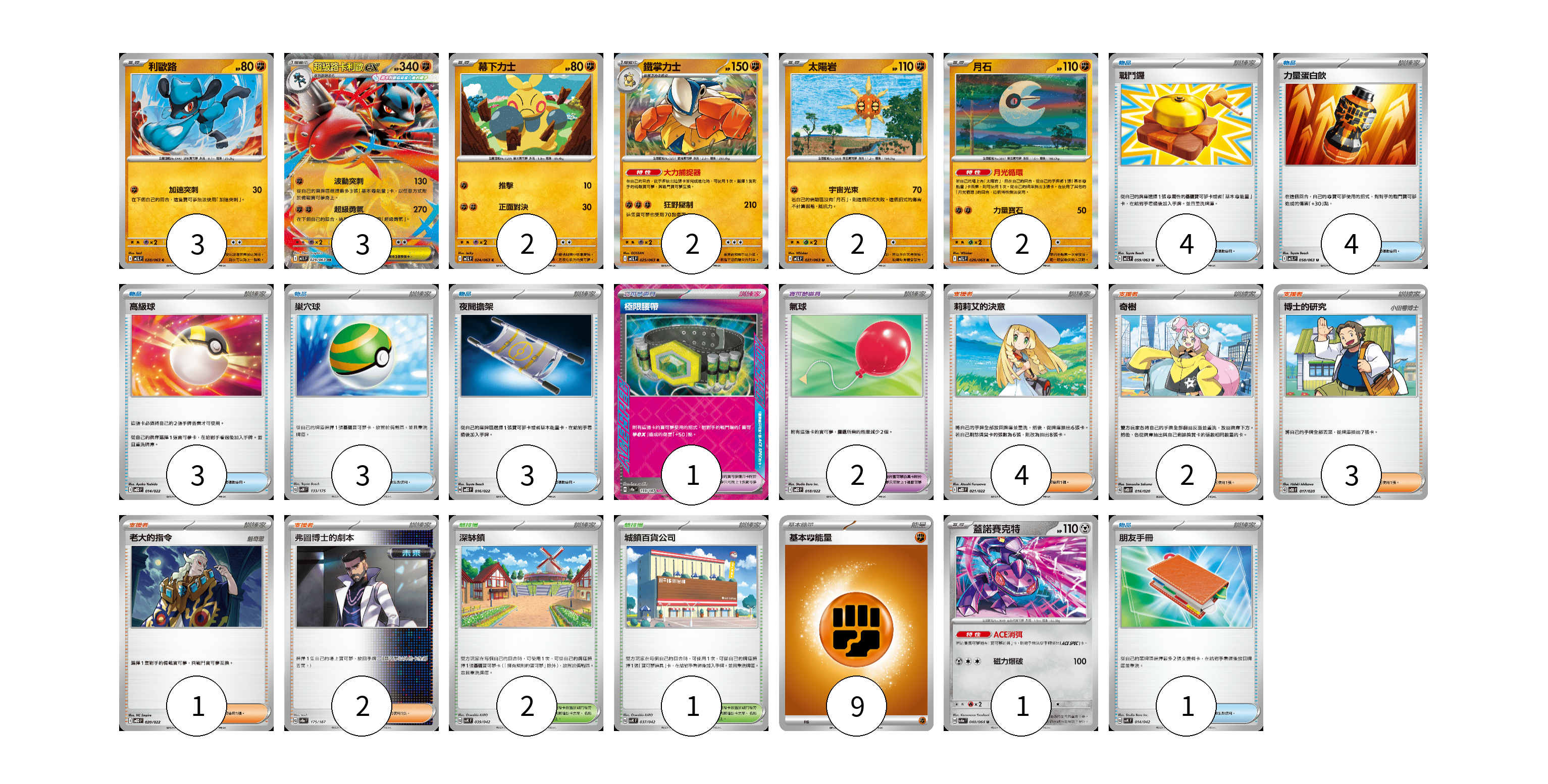 牌組構築方案 以此牌組為基礎新構築牌組 顯示卡面 顯示列表 寶可夢卡(15) 3 3 2 2 2 2 1 寶可夢道具(3) 1 2 物品卡(18) 4 4 3 3 3 1 支援者卡(12) 4 2 3 1 2 競技場卡(3) 2 1 能量卡(9) 9 寶可夢卡(15) 卡牌名稱 張數 卡牌名稱 張數 利歐路 M1L 028/063 03 超級路卡利歐ex M1L 029/063 03 幕下力士 M1L 024/063 02 鐵掌力士 M1L 025/063 02 太陽岩 M1L 027/063 02 月石 M1L 026/063 02 蓋諾賽克特 SV6a 040/064 01 寶可夢道具(3) 卡牌名稱 張數 卡牌名稱 張數 極限腰帶 SV8a 159/187 01 氣球 MBD 018/022 02 物品卡(18) 卡牌名稱 張數 卡牌名稱 張數 戰鬥鑼 M1L 059/063 04 力量蛋白飲 M1L 058/063 04 高級球 MBD 014/022 03 巢穴球 SVM 133/175 03 夜間擔架 MBD 016/022 03 朋友手冊 SVK 014/042 01 支援者卡(12) 卡牌名稱 張數 卡牌名稱 張數 莉莉艾的決意 MBD 021/022 04 奇樹 SVOD 016/020 02 博士的研究 SVOD 017/020 03 老大的指令 MBD 020/022 01 弗圖博士的劇本 SV8a 175/187 02 競技場卡(3) 卡牌名稱 張數 卡牌名稱 張數 深缽鎮 SVK 039/042 02 城鎮百貨公司 SVK 037/042 01 能量卡(9) 卡牌名稱 張數 卡牌名稱 張數 基本【鬥】能量 M-P FIG 09 以此牌組為基礎新構築牌組 牌組編碼 FnWjyu-oyTelT-owhbDy copy 列印牌組單 牌組編碼已複製 分享至SNS
