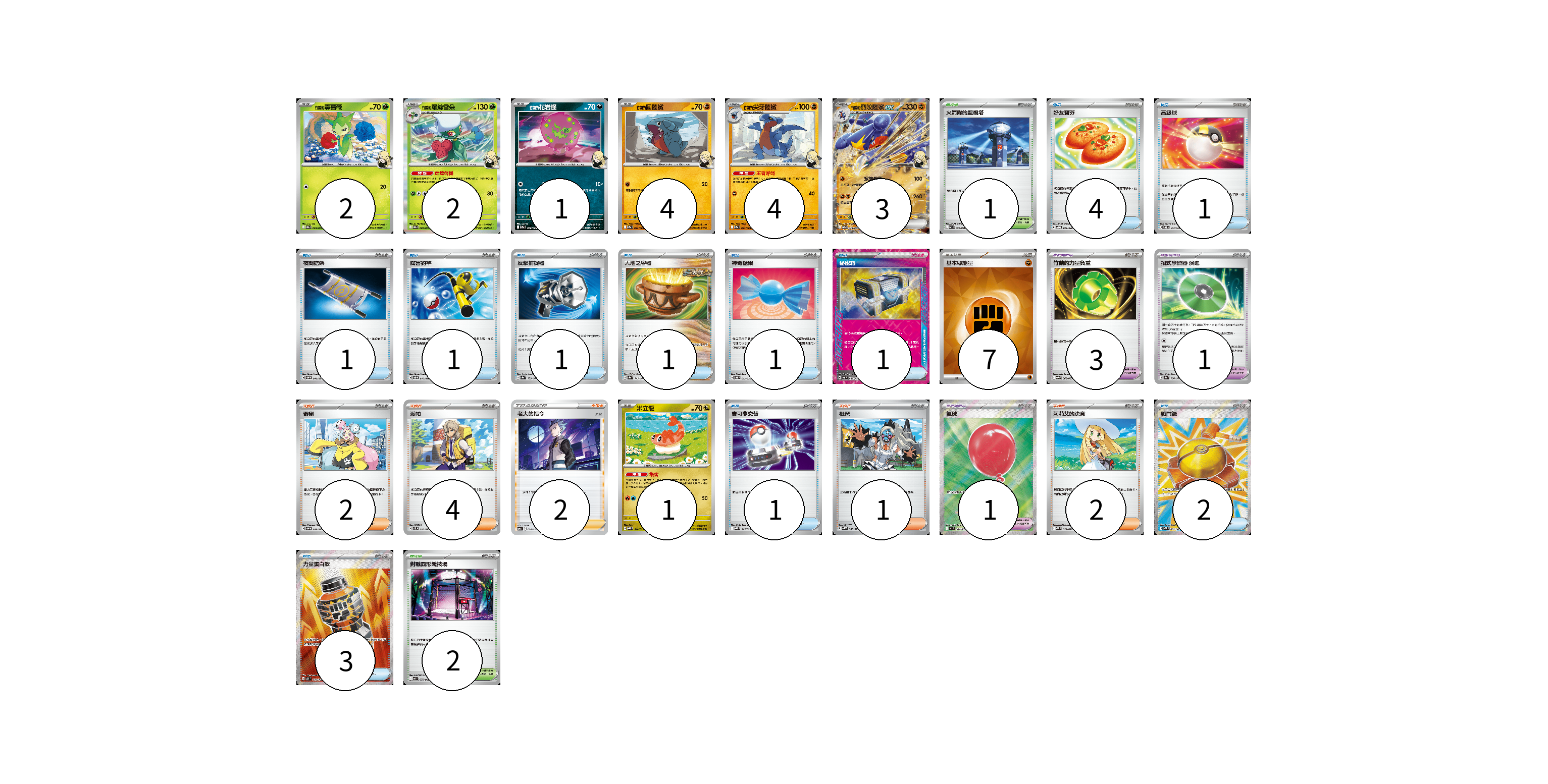 牌組構築方案 以此牌組為基礎新構築牌組 顯示卡面 顯示列表 寶可夢卡(17) 2 2 1 4 4 3 1 寶可夢道具(5) 3 1 1 物品卡(17) 4 1 1 1 1 1 1 1 1 2 3 支援者卡(11) 2 4 2 1 2 競技場卡(3) 1 2 能量卡(7) 7 寶可夢卡(17) 卡牌名稱 張數 卡牌名稱 張數 <竹蘭的>毒薔薇 SV9a 004/063 02 <竹蘭的>羅絲雷朵 SV9a 005/063 02 <竹蘭的>花岩怪 SV9a 050/063 01 <竹蘭的>圓陸鯊 SV9a 042/063 04 <竹蘭的>尖牙陸鯊 SV9a 043/063 04 <竹蘭的>烈咬陸鯊ex SV9a 044/063 03 米立龍 MBG 010/022 01 寶可夢道具(5) 卡牌名稱 張數 卡牌名稱 張數 竹蘭的力量負重 SV9a 060/063 03 招式學習器 演進 SV8a 160/187 01 氣球 M1L 084/063 01 物品卡(17) 卡牌名稱 張數 卡牌名稱 張數 好友寶芬 SVOD 011/020 04 高級球 SVOD 012/020 01 夜間擔架 SVOM 016/021 01 厲害釣竿 SVOD 010/020 01 反擊捕捉器 SV8a 139/187 01 大地之容器 SV8a 143/187 01 神奇糖果 SVOD 013/020 01 秘密箱 SV6 092/101 01 寶可夢交替 MBG 015/022 01 戰鬥鑼 M1L 082/063 02 力量蛋白飲 M1L 081/063 03 支援者卡(11) 卡牌名稱 張數 卡牌名稱 張數 奇樹 SVOM 018/021 02 派帕 SVTL 020/021 04 老大的指令(赤日) SVB 024/028 02 枇琶 SV5K 068/071 01 莉莉艾的決意 MBD 021/022 02 競技場卡(3) 卡牌名稱 張數 卡牌名稱 張數 火箭隊的監視塔 SV10 096/098 01 對戰圓形競技場 M2 079/080 02 能量卡(7) 卡牌名稱 張數 卡牌名稱 張數 基本【鬥】能量 SVM FIG 07 以此牌組為基礎新構築牌組 牌組編碼 Fnwcis-ZjtgeM-HeedKe copy 列印牌組單 牌組編碼已複製 分享至SNS