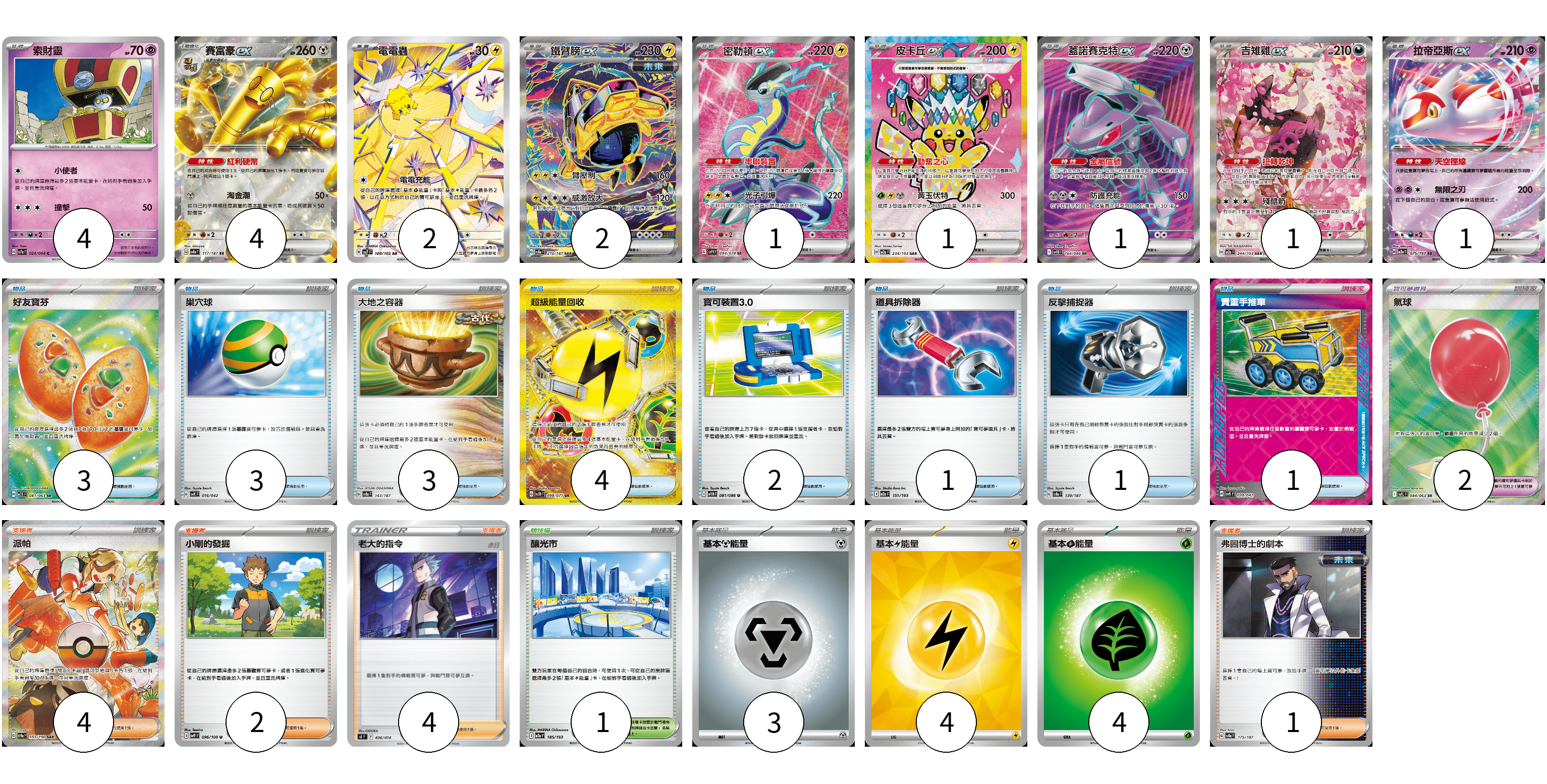 牌組構築方案 以此牌組為基礎新構築牌組 顯示卡面 顯示列表 寶可夢卡(17) 4 4 2 2 1 1 1 1 1 寶可夢道具(2) 2 物品卡(18) 3 3 3 4 2 1 1 1 支援者卡(11) 4 2 4 1 競技場卡(1) 1 能量卡(11) 3 4 4 寶可夢卡(17) 卡牌名稱 張數 卡牌名稱 張數 索財靈 SV7a 024/064 04 賽富豪ex SV8a 117/187 04 電電蟲 SV7 108/102 02 鐵臂膀ex SV8a 210/187 02 密勒頓ex SV1V 094/078 01 皮卡丘ex M2a 234/193 01 蓋諾賽克特ex SV11B 164/086 01 吉雉雞ex M2a 244/193 01 拉帝亞斯ex M2a 075/193 01 寶可夢道具(2) 卡牌名稱 張數 卡牌名稱 張數 氣球 M1L 084/063 02 物品卡(18) 卡牌名稱 張數 卡牌名稱 張數 好友寶芬 M1S 081/063 03 巢穴球 SVK 016/042 03 大地之容器 SV8a 143/187 03 超級能量回收 SV2D 098/071 04 寶可裝置3.0 SV11B 081/086 02 道具拆除器 M2a 151/193 01 反擊捕捉器 SV8a 139/187 01 貴重手推車 SVK 020/042 01 支援者卡(11) 卡牌名稱 張數 卡牌名稱 張數 派帕 SV4a 353/190 04 小剛的發掘 SV9 096/100 02 老大的指令(赤日) SI 406/414 04 弗圖博士的劇本 SV8a 175/187 01 競技場卡(1) 卡牌名稱 張數 卡牌名稱 張數 釀光市 M2a 185/193 01 能量卡(11) 卡牌名稱 張數 卡牌名稱 張數 基本【鋼】能量 M-P MET 03 基本【雷】能量 SVQP LIG 04 基本【草】能量 M-P GRA 04 以此牌組為基礎新構築牌組 牌組編碼 FoBoJe-mUIOfV-YFEsbG copy 列印牌組單 牌組編碼已複製 分享至SNS
