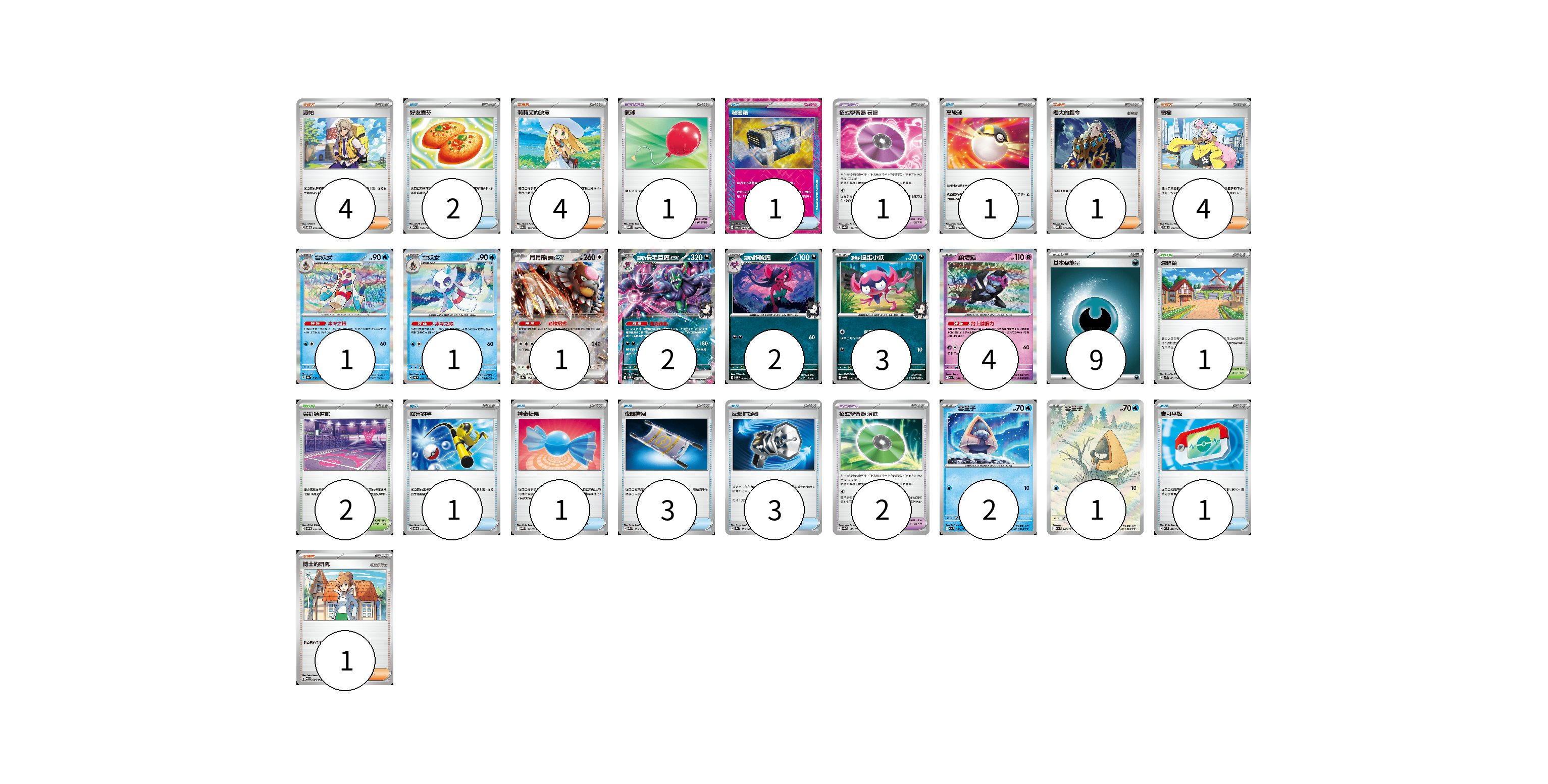 牌組構築方案 以此牌組為基礎新構築牌組 顯示卡面 顯示列表 寶可夢卡(17) 1 1 1 2 2 3 4 2 1 寶可夢道具(4) 1 1 2 物品卡(13) 2 1 1 1 1 3 3 1 支援者卡(14) 4 4 1 4 1 競技場卡(3) 1 2 能量卡(9) 9 寶可夢卡(17) 卡牌名稱 張數 卡牌名稱 張數 雪妖女 SV8a 038/187 01 雪妖女 SV6 033/101 01 月月熊 赫月ex SV8a 134/187 01 <瑪俐的>長毛巨魔ex SVOM 007/021 02 <瑪俐的>詐唬魔 SVOM 006/021 02 <瑪俐的>搗蛋小妖 SVOM 005/021 03 願增猿 M2a 081/193 04 雪童子 M2a 035/193 02 雪童子 M2a 200/193 01 寶可夢道具(4) 卡牌名稱 張數 卡牌名稱 張數 氣球 MBD 018/022 01 招式學習器 衰退 SV8a 161/187 01 招式學習器 演進 SV8a 160/187 02 物品卡(13) 卡牌名稱 張數 卡牌名稱 張數 好友寶芬 M2a 153/193 02 秘密箱 SV6 092/101 01 高級球 MBG 012/022 01 厲害釣竿 SVOD 010/020 01 神奇糖果 MBG 013/022 01 夜間擔架 M2a 159/193 03 反擊捕捉器 SV8a 139/187 03 寶可平板 M3 070/080 01 支援者卡(14) 卡牌名稱 張數 卡牌名稱 張數 派帕 SVOD 018/020 04 莉莉艾的決意 M2a 175/193 04 老大的指令 MBD 020/022 01 奇樹 SVOD 016/020 04 博士的研究 SV11B 084/086 01 競技場卡(3) 卡牌名稱 張數 卡牌名稱 張數 深缽鎮 SVK 039/042 01 尖釘鎮道館 SVOM 021/021 02 能量卡(9) 卡牌名稱 張數 卡牌名稱 張數 基本【惡】能量 MBG DAR 09 以此牌組為基礎新構築牌組 牌組編碼 FoVztV-pScLtA-TCUcpI copy 列印牌組單 牌組編碼已複製 分享至SNS