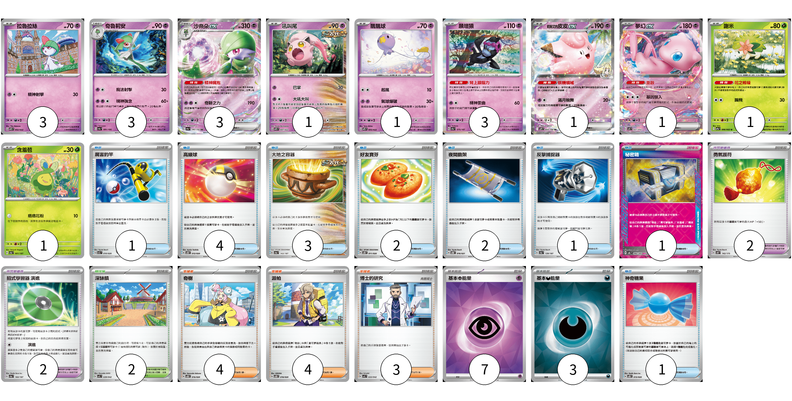 牌組構築方案 以此牌組為基礎新構築牌組 顯示卡面 顯示列表 寶可夢卡(19) 3 3 3 1 1 3 1 1 1 1 1 寶可夢道具(4) 2 2 物品卡(14) 4 3 2 2 1 1 1 支援者卡(11) 4 4 3 競技場卡(2) 2 能量卡(10) 7 3 寶可夢卡(19) 卡牌名稱 張數 卡牌名稱 張數 拉魯拉絲 SVTS 002/022 03 奇魯莉安 SV4a 081/190 03 沙奈朵ex SV4a 082/190 03 吼叫尾 SVTS 007/022 01 飄飄球 SVTS 005/022 01 願增猿 SV8a 075/187 03 莉莉艾的皮皮ex SV9 033/100 01 夢幻ex SVK 001/042 01 謝米 SV9a 006/063 01 含羞苞 SV8a 001/187 01 厲害釣竿 SVEL 010/020 01 寶可夢道具(4) 卡牌名稱 張數 卡牌名稱 張數 勇氣護符 SVM 142/175 02 招式學習器 演進 SV8a 160/187 02 物品卡(14) 卡牌名稱 張數 卡牌名稱 張數 高級球 SVOD 012/020 04 大地之容器 SV8a 143/187 03 好友寶芬 SVOD 011/020 02 夜間擔架 SVOM 016/021 02 反擊捕捉器 SV8a 139/187 01 秘密箱 SV6 092/101 01 神奇糖果 SVOD 013/020 01 支援者卡(11) 卡牌名稱 張數 卡牌名稱 張數 奇樹 SVOD 016/020 04 派帕 SVOD 018/020 04 博士的研究 SVK 033/042 03 競技場卡(2) 卡牌名稱 張數 卡牌名稱 張數 深缽鎮 SVK 039/042 02 能量卡(10) 卡牌名稱 張數 卡牌名稱 張數 基本【超】能量 SVOD PSY 07 基本【惡】能量 SVOM DAR 03 以此牌組為基礎新構築牌組 牌組編碼 FoirQO-SDuwjG-DTavCv copy 列印牌組單 牌組編碼已複製 分享至SNS