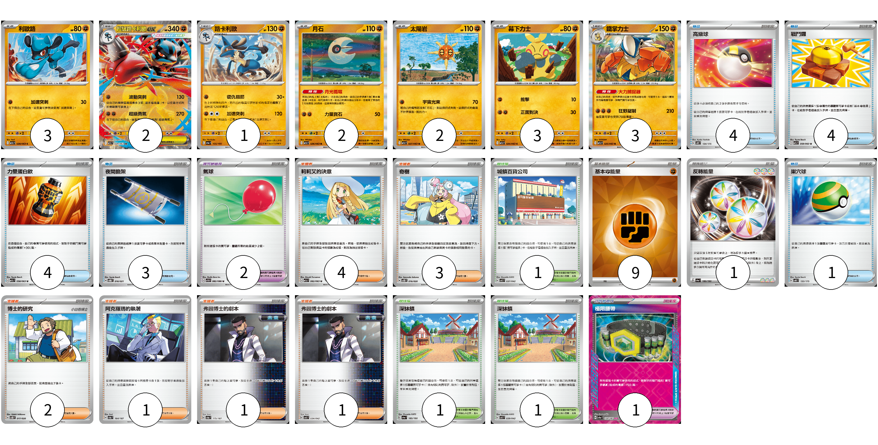 牌組構築方案 以此牌組為基礎新構築牌組 顯示卡面 顯示列表 寶可夢卡(16) 3 2 1 2 2 3 3 寶可夢道具(3) 2 1 物品卡(16) 4 4 4 3 1 支援者卡(12) 4 3 2 1 1 1 競技場卡(3) 1 1 1 能量卡(10) 9 1 寶可夢卡(16) 卡牌名稱 張數 卡牌名稱 張數 利歐路 M1L 028/063 03 超級路卡利歐ex M1L 029/063 02 路卡利歐 SV4a 105/190 01 月石 M1L 026/063 02 太陽岩 M1L 027/063 02 幕下力士 M1L 024/063 03 鐵掌力士 M1L 025/063 03 寶可夢道具(3) 卡牌名稱 張數 卡牌名稱 張數 氣球 SV11B 082/086 02 極限腰帶 SV8a 159/187 01 物品卡(16) 卡牌名稱 張數 卡牌名稱 張數 高級球 SVM 134/175 04 戰鬥鑼 M1L 059/063 04 力量蛋白飲 M1L 058/063 04 夜間擔架 SVOM 016/021 03 巢穴球 SVM 133/175 01 支援者卡(12) 卡牌名稱 張數 卡牌名稱 張數 莉莉艾的決意 M1L 062/063 04 奇樹 SVOD 016/020 03 博士的研究 SVOD 017/020 02 阿克羅瑪的執著 SV8a 164/187 01 弗圖博士的劇本 SV8a 175/187 01 弗圖博士的劇本 SVK 034/042 01 競技場卡(3) 卡牌名稱 張數 卡牌名稱 張數 城鎮百貨公司 SVK 037/042 01 深缽鎮 SV4a 185/190 01 深缽鎮 SVK 039/042 01 能量卡(10) 卡牌名稱 張數 卡牌名稱 張數 基本【鬥】能量 SVM FIG 09 反轉能量 SV4a 189/190 01 以此牌組為基礎新構築牌組 牌組編碼 FtpALT-dHOGMi-ClFkTh copy 列印牌組單 牌組編碼已複製 分享至SNS