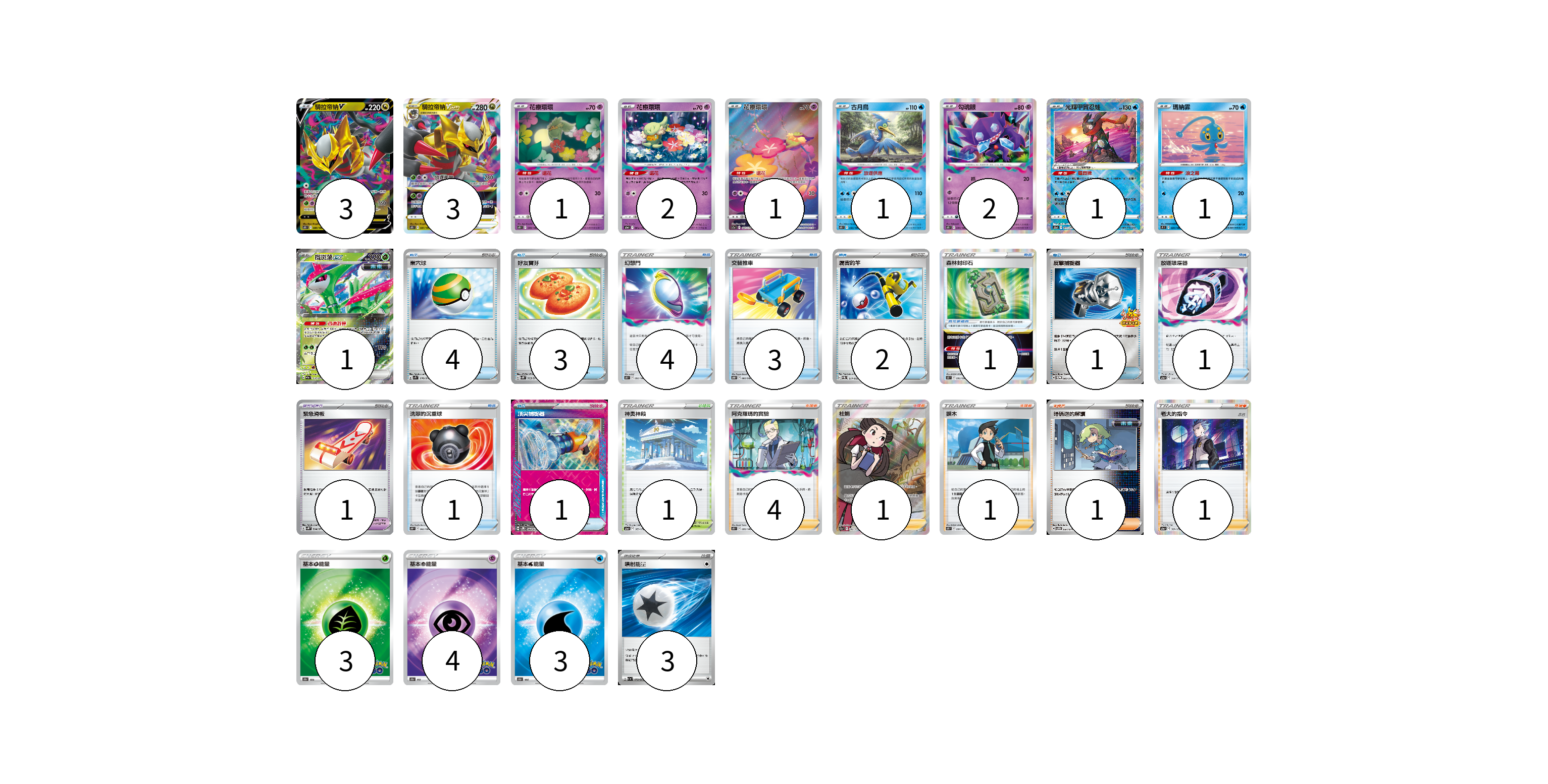 牌組構築方案 以此牌組為基礎新構築牌組 顯示卡面 顯示列表 寶可夢卡(16) 3 3 1 2 1 1 2 1 1 1 寶可夢道具(2) 1 1 物品卡(20) 4 3 4 3 2 1 1 1 1 支援者卡(8) 4 1 1 1 1 競技場卡(1) 1 能量卡(13) 3 4 3 3 寶可夢卡(16) 卡牌名稱 張數 卡牌名稱 張數 騎拉帝納V S11 080/100 03 騎拉帝納VSTAR S11 081/100 03 花療環環 S11 049/100 01 花療環環 S12a 064/172 02 花療環環 S12a 187/172 01 古月鳥 S11 033/100 01 勾魂眼 S11 044/100 02 光輝甲賀忍蛙 S12a 033/172 01 瑪納霏 S9 031/100 01 鐵斑葉ex SV5M 016/071 01 寶可夢道具(2) 卡牌名稱 張數 卡牌名稱 張數 森林封印石 S12 092/098 01 緊急滑板 SV5K 064/071 01 物品卡(20) 卡牌名稱 張數 卡牌名稱 張數 巢穴球 SV1S 070/078 04 好友寶芬 SV5K 063/071 03 幻想門 S11 092/100 04 交替推車 S10D 060/067 03 厲害釣竿 SVEM 011/020 02 反擊捕捉器 SV-P 083/SV-P 01 放逐吸塵器 S12a 144/172 01 洗翠的沉重球 S10P 062/067 01 頂尖捕捉器 SV5M 062/071 01 支援者卡(8) 卡牌名稱 張數 卡牌名稱 張數 阿克羅瑪的實驗 S11 095/100 04 杜娟 S12a 242/172 01 捩木 S11 097/100 01 暗碼迷的解讀 SV5M 067/071 01 老大的指令(赤日) S12a 161/172 01 競技場卡(1) 卡牌名稱 張數 卡牌名稱 張數 神奧神殿 S12a 169/172 01 能量卡(13) 卡牌名稱 張數 卡牌名稱 張數 基本草能量 S10b GRA 03 基本超能量 S10b PSY 04 基本水能量 S10b WAT 03 噴射能量 SV1a 072/073 03 以此牌組為基礎新構築牌組 牌組編碼 FuQRtm-gbZDMJ-NlXKvu copy 列印牌組單 牌組編碼已複製 分享至SNS
