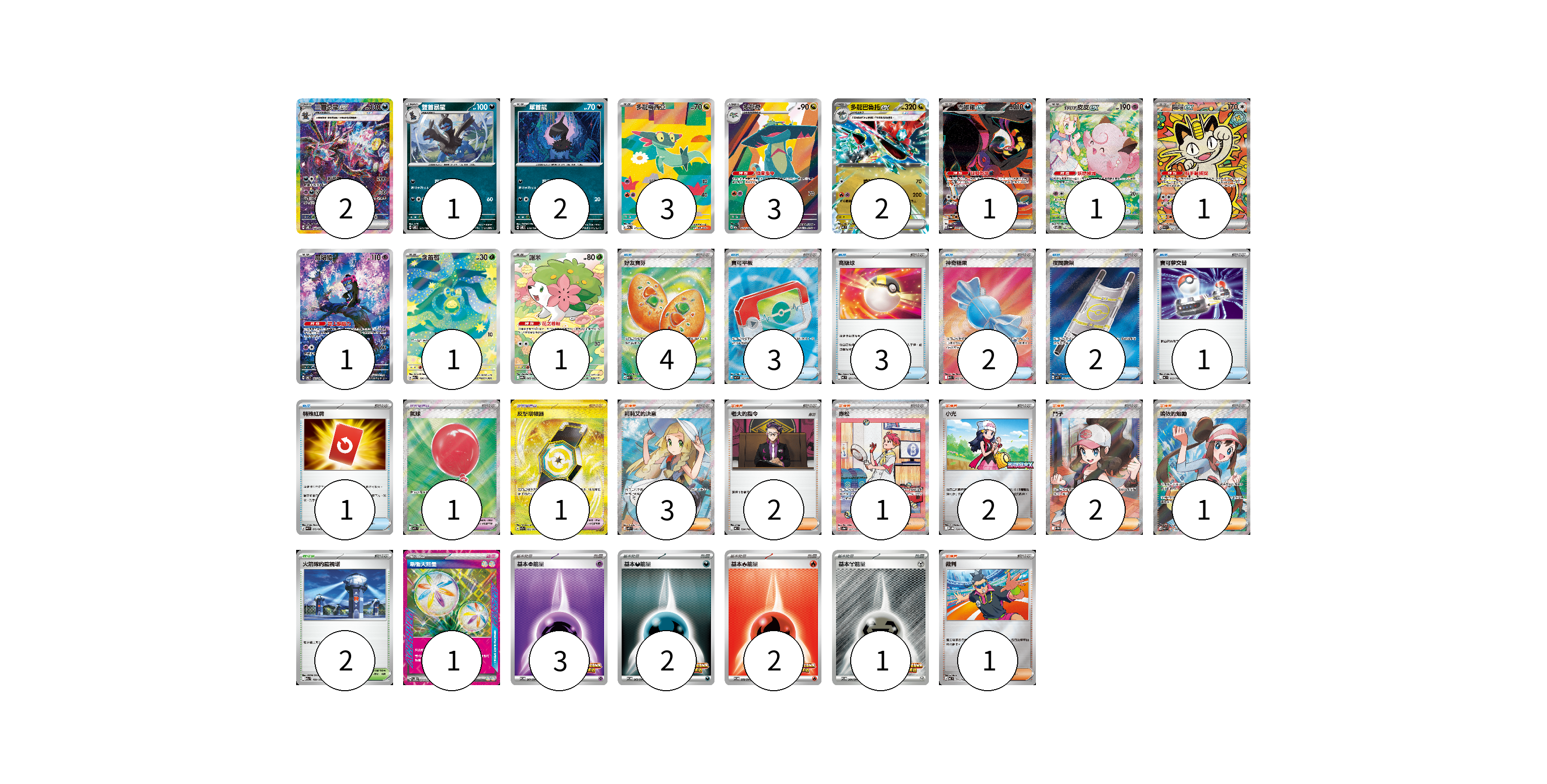 牌組構築方案 以此牌組為基礎新構築牌組 顯示卡面 顯示列表 寶可夢卡(19) 2 1 2 3 3 2 1 1 1 1 1 1 寶可夢道具(2) 1 1 物品卡(16) 4 3 3 2 2 1 1 支援者卡(12) 3 2 1 2 2 1 1 競技場卡(2) 2 能量卡(9) 1 3 2 2 1 寶可夢卡(19) 卡牌名稱 張數 卡牌名稱 張數 三首惡龍ex SV8 133/106 02 雙首暴龍 SV8 071/106 01 單首龍 SV8 070/106 02 多龍梅西亞 M2a 211/193 03 多龍奇 M2a 212/193 03 多龍巴魯托ex MC 548/742 02 吉雉雞ex SV6a 089/064 01 莉莉艾的皮皮ex SV9 126/100 01 喵喵ex M3 114/080 01 願增猿 SV6 107/101 01 含羞苞 M2a 196/193 01 謝米 SV9a 066/063 01 寶可夢道具(2) 卡牌名稱 張數 卡牌名稱 張數 氣球 M1L 084/063 01 反擊增幅器 SV7a 093/064 01 物品卡(16) 卡牌名稱 張數 卡牌名稱 張數 好友寶芬 M1S 081/063 04 寶可平板 M3 103/080 03 高級球 MC 651/742 03 神奇糖果 M1S 082/063 02 夜間擔架 M1L 083/063 02 寶可夢交替 MC 663/742 01 特殊紅牌 M4 072/083 01 支援者卡(12) 卡牌名稱 張數 卡牌名稱 張數 莉莉艾的決意 M1L 086/063 03 老大的指令 MC 724/742 02 赤松 SV8a 227/187 01 小光 M-P 028/M-P 02 鬥子 SV11W 166/086 02 鳴依的勉勵 M3 107/080 01 裁判 MC 711/742 01 競技場卡(2) 卡牌名稱 張數 卡牌名稱 張數 火箭隊的監視塔 M2a 189/193 02 能量卡(9) 卡牌名稱 張數 卡牌名稱 張數 新衝天能量 SV5K 071/071 01 基本【超】能量 SV-P 261/SV-P 03 基本【惡】能量 SV-P 263/SV-P 02 基本【火】能量 SV-P 258/SV-P 02 基本【鋼】能量 SV-P 264/SV-P 01 以此牌組為基礎新構築牌組 牌組編碼 Fugzlg-AEgxdN-gjfUAC copy 列印牌組單 牌組編碼已複製 分享至SNS