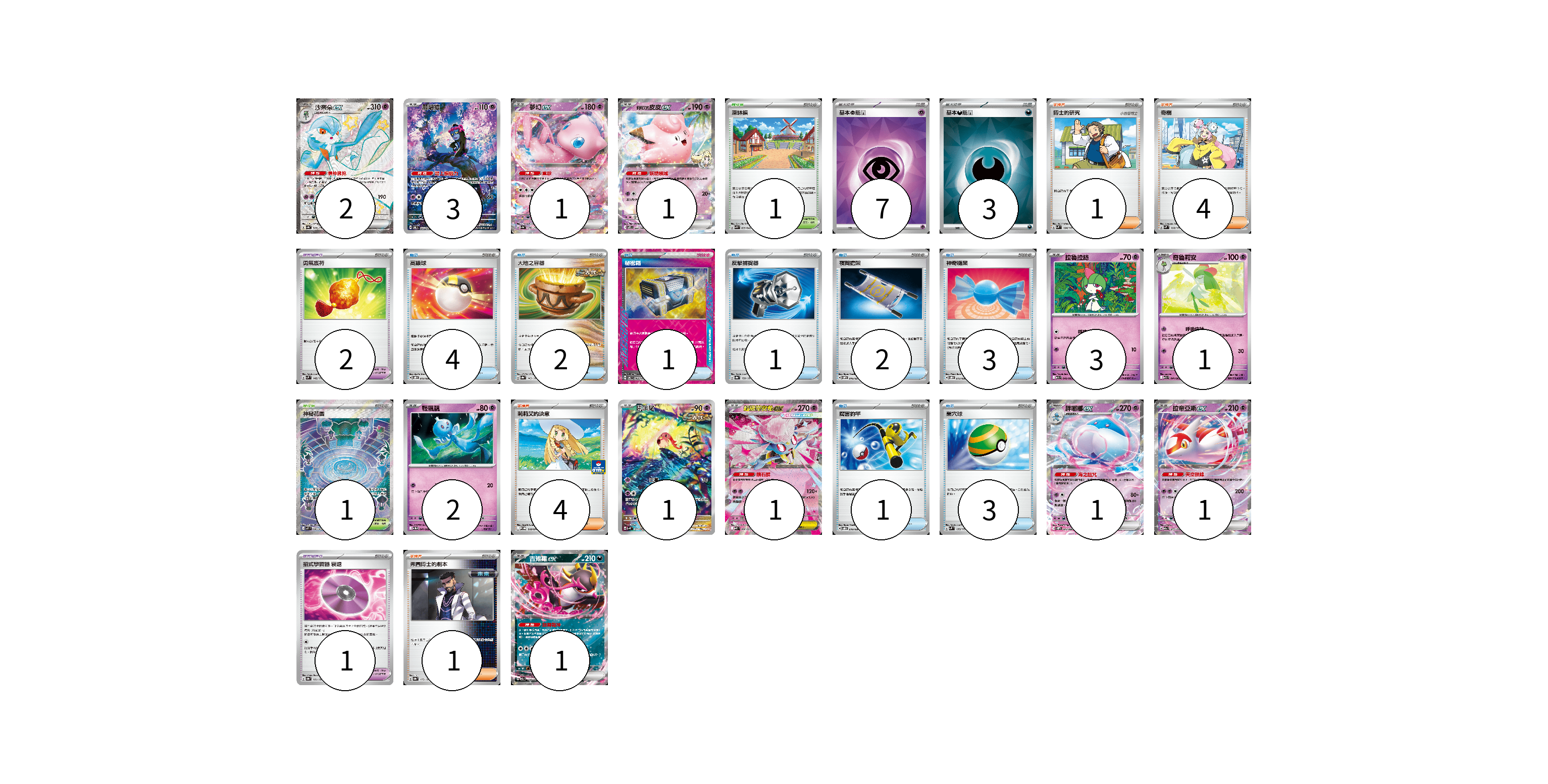 牌組構築方案 以此牌組為基礎新構築牌組 顯示卡面 顯示列表 寶可夢卡(18) 2 3 1 1 3 1 2 1 1 1 1 1 寶可夢道具(3) 2 1 物品卡(17) 4 2 1 1 2 3 1 3 支援者卡(10) 1 4 4 1 競技場卡(2) 1 1 能量卡(10) 7 3 寶可夢卡(18) 卡牌名稱 張數 卡牌名稱 張數 沙奈朵ex SV4a 328/190 02 願增猿 SV6 107/101 03 夢幻ex SV4a 076/190 01 莉莉艾的皮皮ex SV9 033/100 01 拉魯拉絲 M1S 040/063 03 奇魯莉安 M1S 041/063 01 輕飄飄 SV11W 041/086 02 吼叫尾 SV4K 071/066 01 超級蒂安希ex MBD 006/022 01 胖嘟嘟ex SV11W 042/086 01 拉帝亞斯ex M2a 075/193 01 吉雉雞ex M2a 114/193 01 寶可夢道具(3) 卡牌名稱 張數 卡牌名稱 張數 勇氣護符 SVM 142/175 02 招式學習器 衰退 SV8a 161/187 01 物品卡(17) 卡牌名稱 張數 卡牌名稱 張數 高級球 SVOD 012/020 04 大地之容器 SV8a 143/187 02 秘密箱 SV6 092/101 01 反擊捕捉器 SV8a 139/187 01 夜間擔架 SVOM 016/021 02 神奇糖果 SVOD 013/020 03 厲害釣竿 SVOD 010/020 01 巢穴球 SVM 133/175 03 支援者卡(10) 卡牌名稱 張數 卡牌名稱 張數 博士的研究 SVM 164/175 01 奇樹 SVM 160/175 04 莉莉艾的決意 M-P 018/M-P 04 弗圖博士的劇本 SV8a 175/187 01 競技場卡(2) 卡牌名稱 張數 卡牌名稱 張數 深缽鎮 SVK 039/042 01 神秘花園 M1S 086/063 01 能量卡(10) 卡牌名稱 張數 卡牌名稱 張數 基本【超】能量 SVOD PSY 07 基本【惡】能量 SVOM DAR 03 以此牌組為基礎新構築牌組 牌組編碼 FukXtQ-kLcZzW-sfbCOr copy 列印牌組單 牌組編碼已複製 分享至SNS