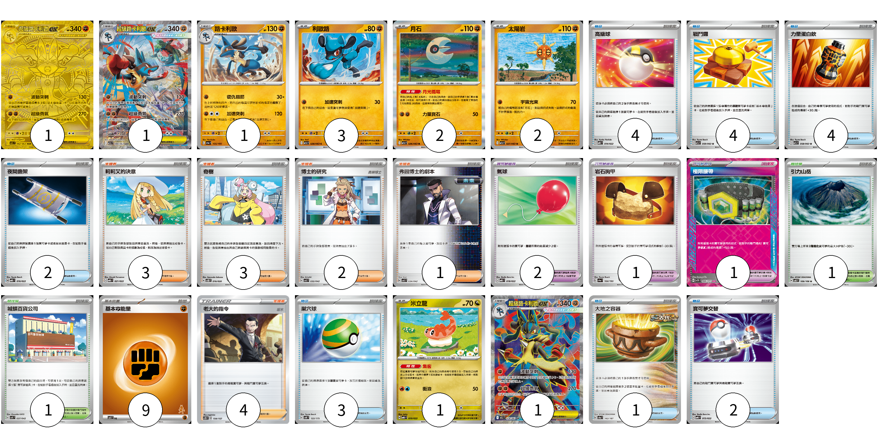 牌組構築方案 以此牌組為基礎新構築牌組 顯示卡面 顯示列表 寶可夢卡(12) 1 1 1 3 2 2 1 1 寶可夢道具(4) 2 1 1 物品卡(20) 4 4 4 2 3 1 2 支援者卡(13) 3 3 2 1 4 競技場卡(2) 1 1 能量卡(9) 9 寶可夢卡(12) 卡牌名稱 張數 卡牌名稱 張數 超級路卡利歐ex M1L 092/063 01 超級路卡利歐ex M1L 088/063 01 路卡利歐 SV4a 105/190 01 利歐路 M1L 028/063 03 月石 M1L 026/063 02 太陽岩 M1L 027/063 02 米立龍 MBD 010/022 01 超級路卡利歐ex M1L 078/063 01 寶可夢道具(4) 卡牌名稱 張數 卡牌名稱 張數 氣球 MBD 018/022 02 岩石胸甲 SV4a 164/190 01 極限腰帶 SV5K 066/071 01 物品卡(20) 卡牌名稱 張數 卡牌名稱 張數 高級球 MBD 014/022 04 戰鬥鑼 M1L 059/063 04 力量蛋白飲 M1L 058/063 04 夜間擔架 MBD 016/022 02 巢穴球 SVM 133/175 03 大地之容器 SV8a 143/187 01 寶可夢交替 MBG 015/022 02 支援者卡(13) 卡牌名稱 張數 卡牌名稱 張數 莉莉艾的決意 MBD 021/022 03 奇樹 SVOD 016/020 03 博士的研究 SVK 032/042 02 弗圖博士的劇本 SVK 034/042 01 老大的指令(坂木) SC2D 154/157 04 競技場卡(2) 卡牌名稱 張數 卡牌名稱 張數 引力山岳 SV8 106/106 01 城鎮百貨公司 SVK 037/042 01 能量卡(9) 卡牌名稱 張數 卡牌名稱 張數 基本【鬥】能量 SVI FIG 09 以此牌組為基礎新構築牌組 牌組編碼 FvVbBG-TUPwGS-IvPaWv copy 列印牌組單 牌組編碼已複製 分享至SNS