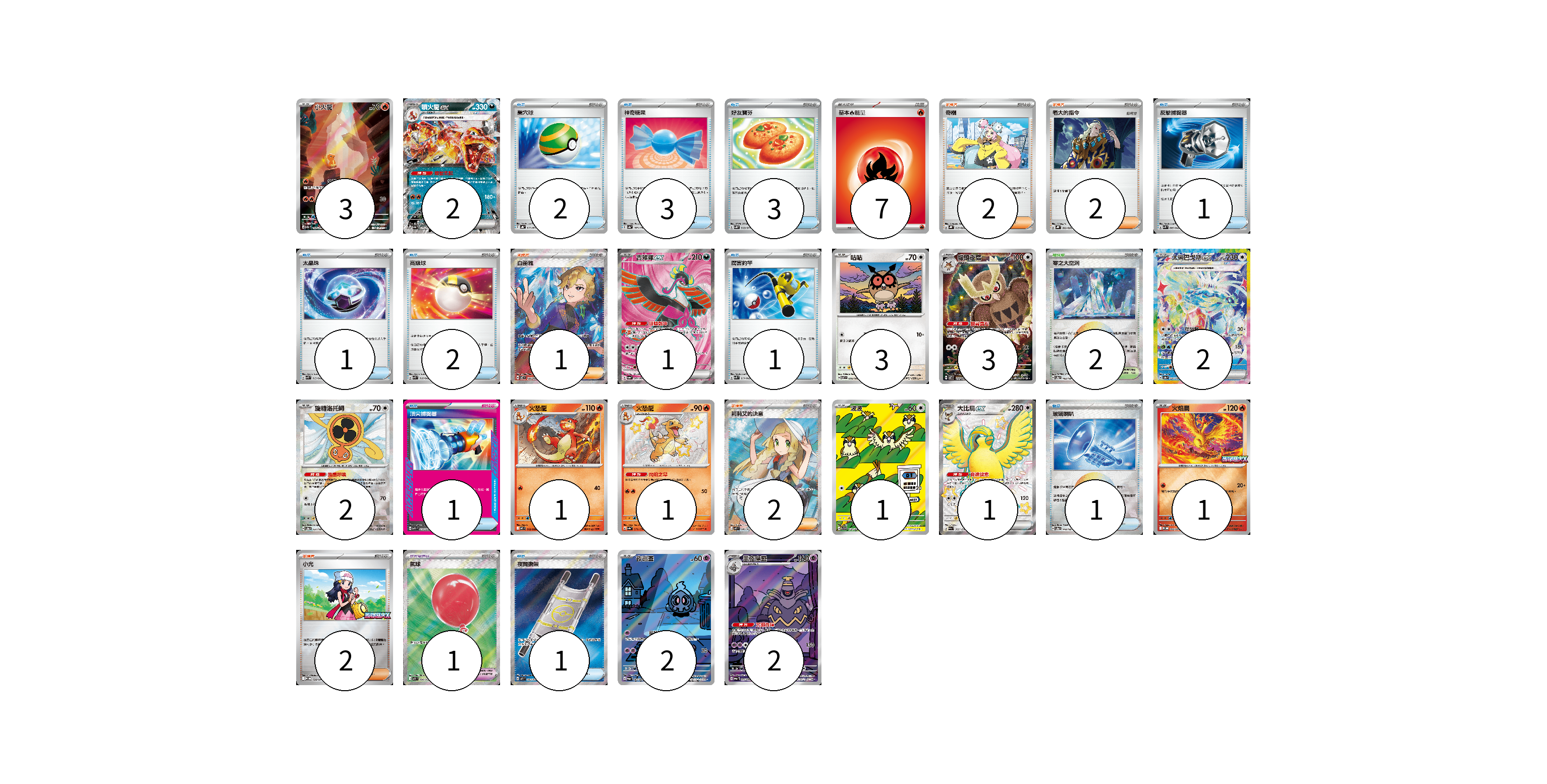 牌組構築方案 以此牌組為基礎新構築牌組 顯示卡面 顯示列表 寶可夢卡(25) 3 2 1 3 3 2 2 1 1 1 1 1 2 2 寶可夢道具(1) 1 物品卡(16) 2 3 3 1 1 2 1 1 1 1 支援者卡(9) 2 2 1 2 2 競技場卡(2) 2 能量卡(7) 7 寶可夢卡(25) 卡牌名稱 張數 卡牌名稱 張數 小火龍 SV2a 168/165 03 噴火龍ex SV4a 115/190 02 吉雉雞ex SV6a 081/064 01 咕咕 SV7 076/102 03 貓頭夜鷹 SV7 114/102 03 太樂巴戈斯ex SV8a 226/187 02 旋轉洛托姆 SV8a 131/187 02 火恐龍 M2 012/080 01 火恐龍 SV4a 211/190 01 波波 SV3 118/108 01 大比鳥ex SV4a 335/190 01 火焰鳥 M-P 022/M-P 01 夜巡靈 SV6a 068/064 02 黑夜魔靈 SV6a 070/064 02 寶可夢道具(1) 卡牌名稱 張數 卡牌名稱 張數 氣球 M1L 084/063 01 物品卡(16) 卡牌名稱 張數 卡牌名稱 張數 巢穴球 SVHK 012/022 02 神奇糖果 SV4a 163/190 03 好友寶芬 SV5K 063/071 03 反擊捕捉器 SVK 009/042 01 太晶珠 SVK 013/042 01 高級球 SVK 018/042 02 厲害釣竿 SVK 011/042 01 頂尖捕捉器 MBG 014/022 01 玻璃喇叭 SV8a 140/187 01 夜間擔架 M1L 083/063 01 支援者卡(9) 卡牌名稱 張數 卡牌名稱 張數 奇樹 SVHK 019/022 02 老大的指令 SVHK 022/022 02 白蕾雅 SV7 126/102 01 莉莉艾的決意 M1L 086/063 02 小光 M-P 028/M-P 02 競技場卡(2) 卡牌名稱 張數 卡牌名稱 張數 零之大空洞 SV8a 182/187 02 能量卡(7) 卡牌名稱 張數 卡牌名稱 張數 基本火能量 sv-p FIR 07 以此牌組為基礎新構築牌組 牌組編碼 Fvokqn-FnjTKg-yXVrii copy 列印牌組單 牌組編碼已複製 分享至SNS