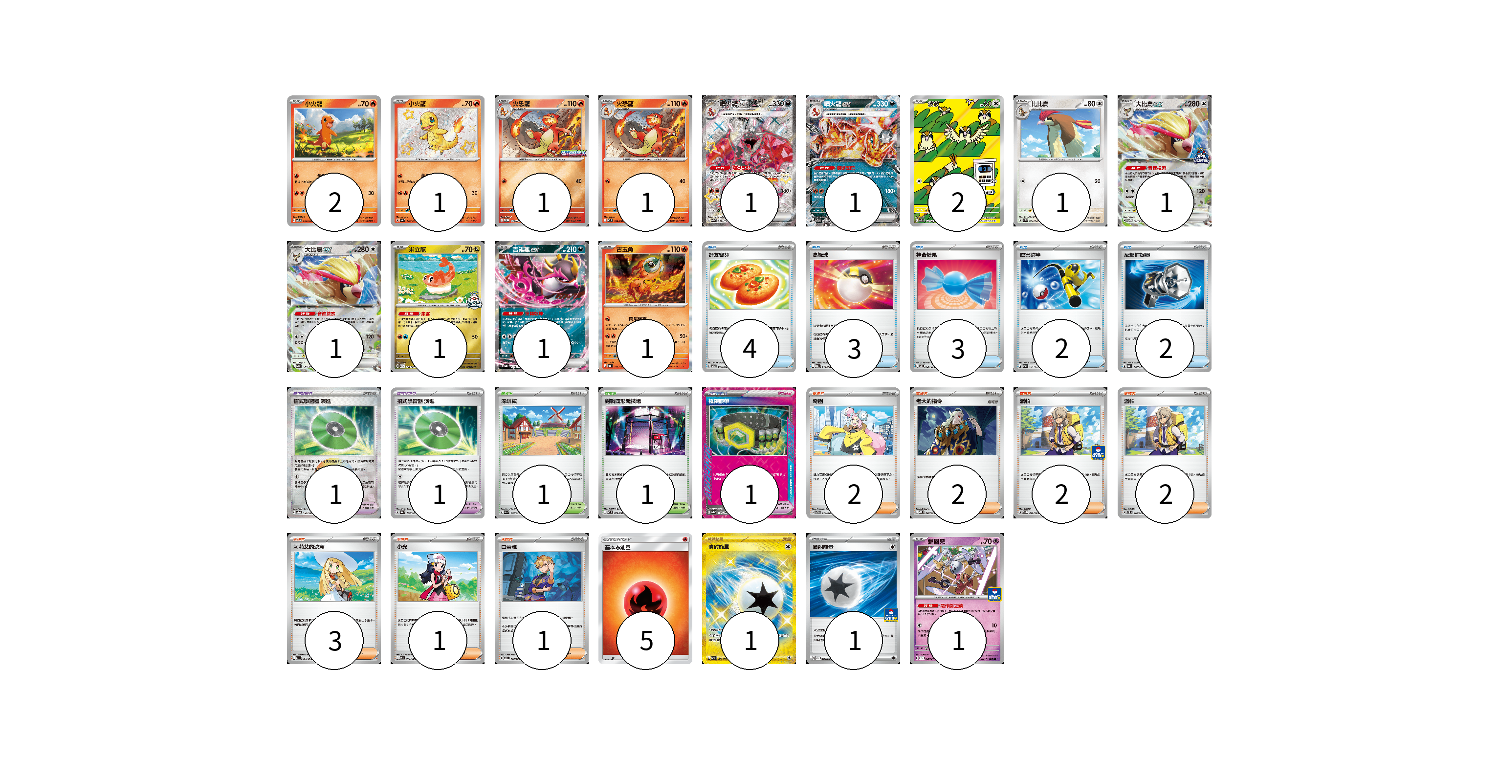 牌組構築方案 以此牌組為基礎新構築牌組 顯示卡面 顯示列表 寶可夢卡(16) 2 1 1 1 1 1 2 1 1 1 1 1 1 1 寶可夢道具(3) 1 1 1 物品卡(14) 4 3 3 2 2 支援者卡(13) 2 2 2 2 3 1 1 競技場卡(2) 1 1 能量卡(7) 5 1 1 寶可夢卡(16) 卡牌名稱 張數 卡牌名稱 張數 小火龍 SVTL 001/021 02 小火龍 SV4a 210/190 01 火恐龍 M-P 021/M-P 01 火恐龍 M2 012/080 01 噴火龍ex SV4a 331/190 01 噴火龍ex SVTL 006/021 01 波波 SV3 118/108 02 比比鳥 SVK 004/042 01 大比鳥ex SV-P 183/SV-P 01 大比鳥ex SV4a 139/190 01 米立龍 SV-P 186/SV-P 01 吉雉雞ex SV8a 104/187 01 古玉魚 SV8a 025/187 01 鑰圈兒 SV-P 089/SV-P 01 寶可夢道具(3) 卡牌名稱 張數 卡牌名稱 張數 招式學習器 演進 SV8a 160/187 01 招式學習器 演進 SV8a 160/187 01 極限腰帶 SV8a 159/187 01 物品卡(14) 卡牌名稱 張數 卡牌名稱 張數 好友寶芬 SVTS 012/022 04 高級球 MBD 014/022 03 神奇糖果 SVF 020/038 03 厲害釣竿 SVK 011/042 02 反擊捕捉器 SV8a 139/187 02 支援者卡(13) 卡牌名稱 張數 卡牌名稱 張數 奇樹 SVTS 018/022 02 老大的指令 MBD 020/022 02 派帕 SV-P 213/SV-P 02 派帕 SVTL 020/021 02 莉莉艾的決意 M1L 062/063 03 小光 M2 077/080 01 白蕾雅 SV7 100/102 01 競技場卡(2) 卡牌名稱 張數 卡牌名稱 張數 深缽鎮 SV1a 070/073 01 對戰圓形競技場 M2 079/080 01 能量卡(7) 卡牌名稱 張數 卡牌名稱 張數 基本火能量 AS6D FIR 05 噴射能量 SV7a 094/064 01 噴射能量 SV-P 180/SV-P 01 以此牌組為基礎新構築牌組 牌組編碼 FvrePW-UQRFYh-bvkBOV copy 列印牌組單 牌組編碼已複製 分享至SNS